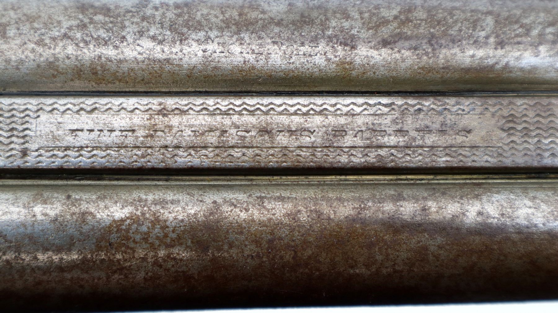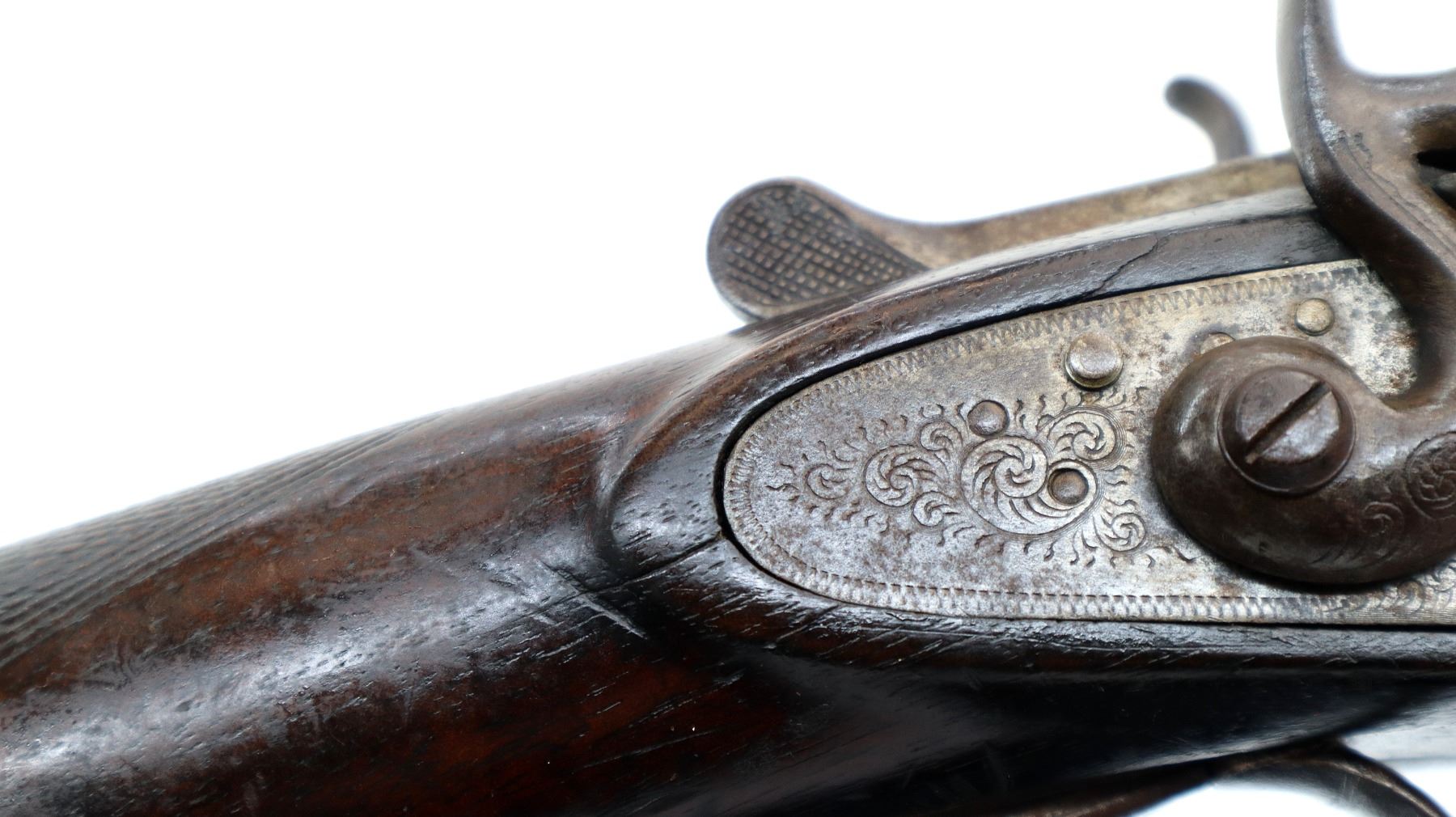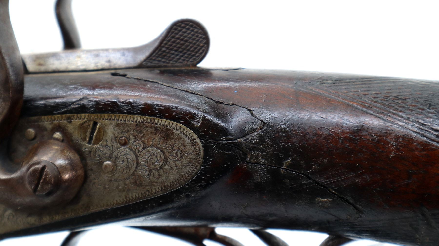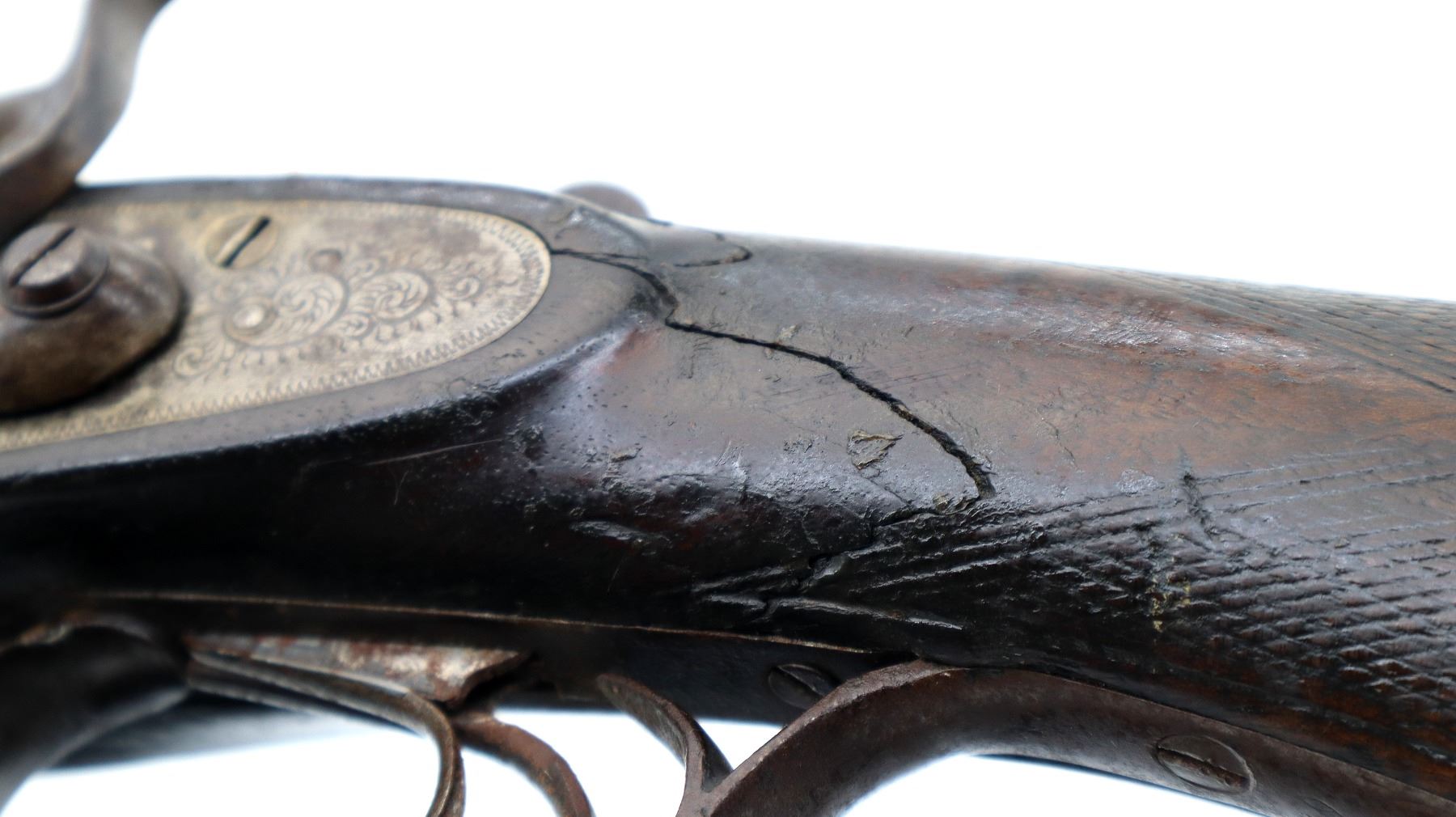 Main Description: Front bead is broken, laminated steel barrels with grooved rib that are loose on face, engraved receiver and side locks with checkered spur hammers that don’t function, triggers are bent, extractor. Two piece wood stocks, checkered forearm and pistol grip, chipped cracked and broken behind receiver and locks, grooved black polymer butt plate, stock repaired at toe, vanity plate, grip cap.