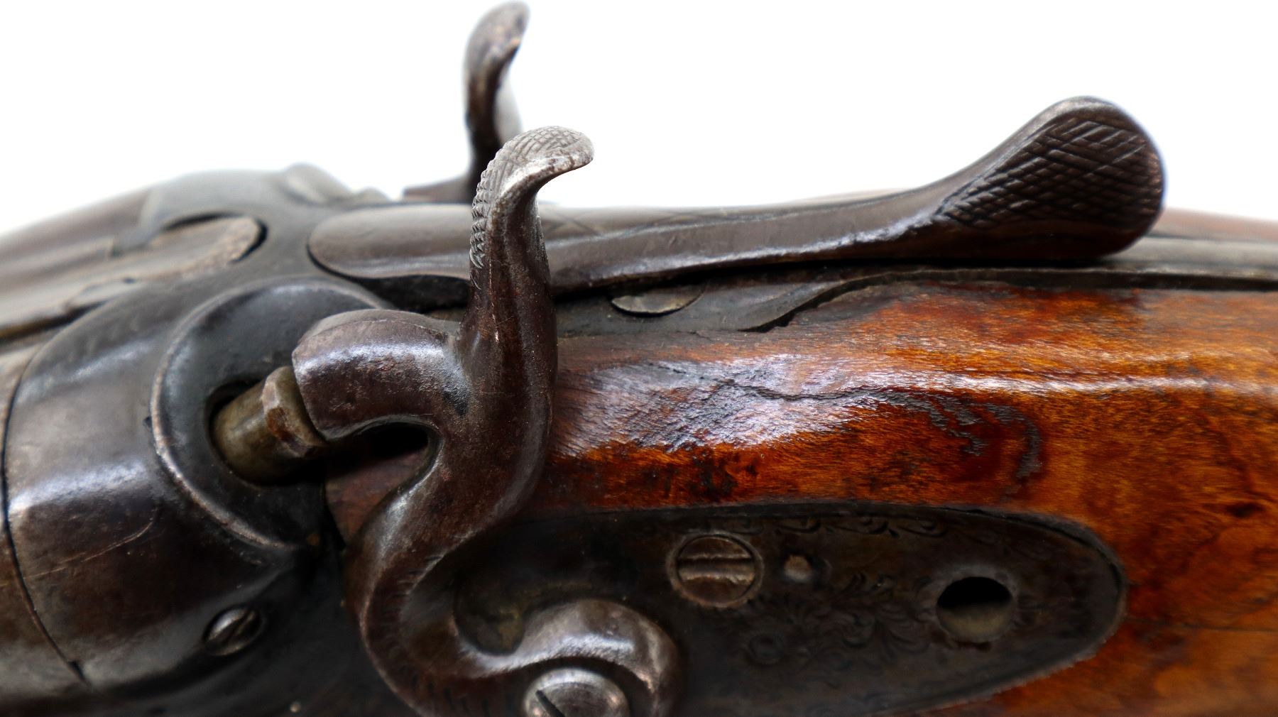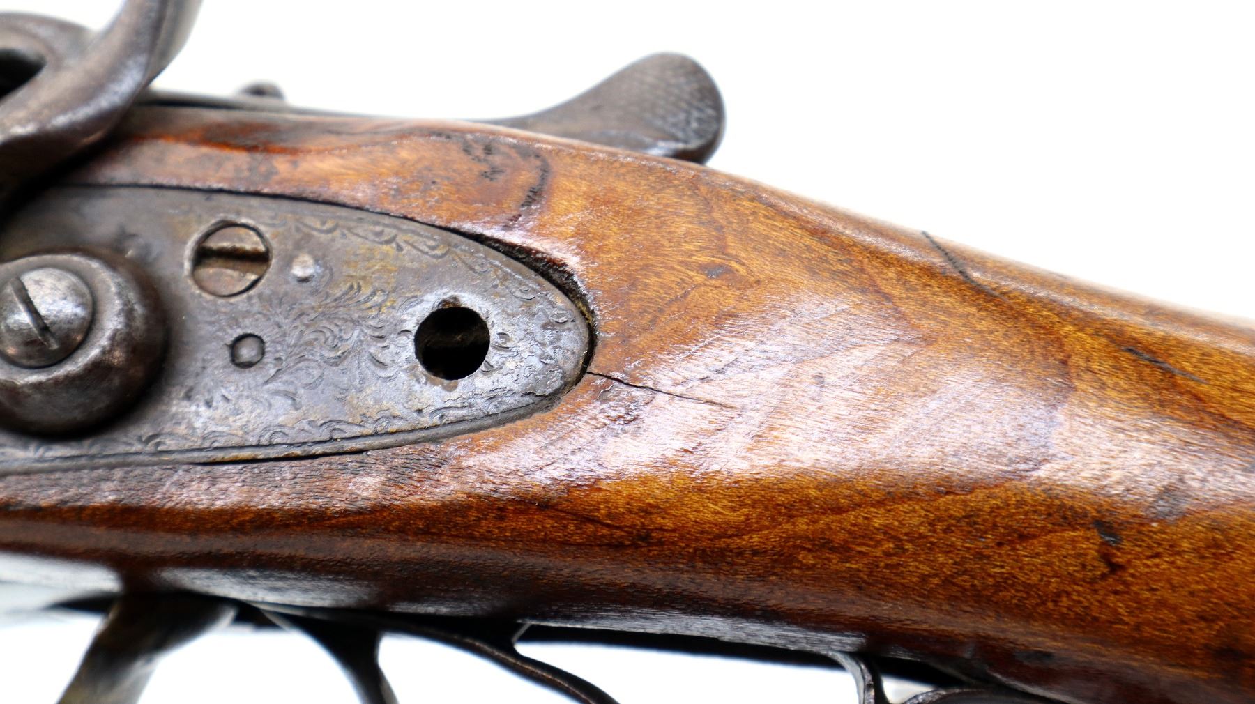 Main Description: silver bead, Damascus barrels with smooth rib that are loose on face, engraved side locks and checkered spur hammers that function, extractor, double triggers, hole in left lock. Two piece wood stocks, replaced butt, pistol grip chipped and cracked behind receiver and tang, replaced brown polymer butt plate, upper tang and trigger guard have been repaired.