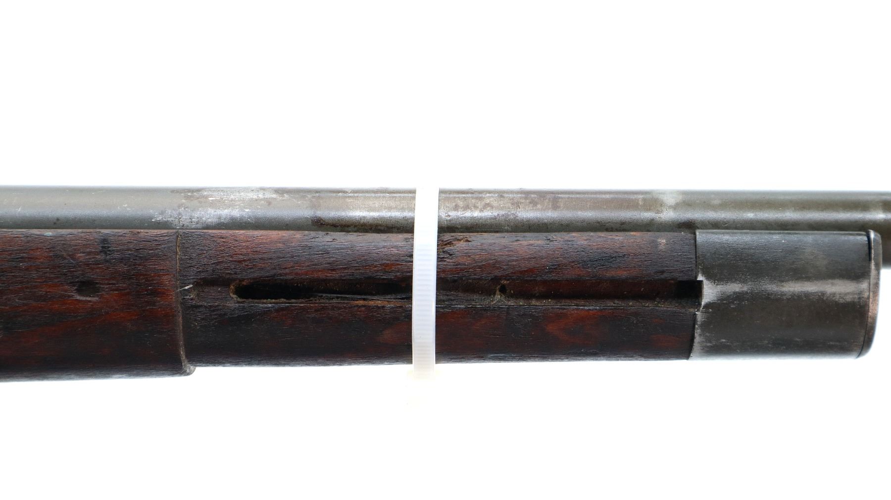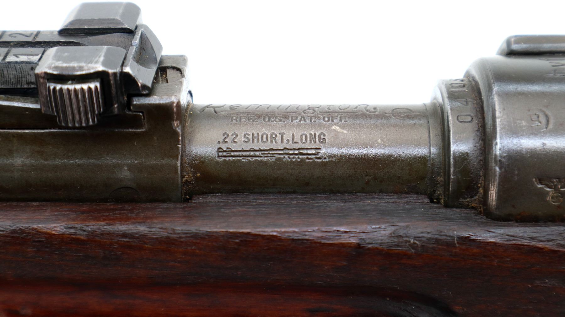 Main Description: Receiver manufactured by BYF, Barley corn front sight with ramp, adjustable u notched rear sight, Parkerized metal finish, barrel is marked Remington 521-T, Includes bolt stop, trigger and sear. Missing bolt assembly, trigger guard, action screws, top handguard, barrel bands and associated parts. Has one piece full military wood stock, finger grooved forearm, pistol grip, smooth cupped steel butt plate, rear sling slot.