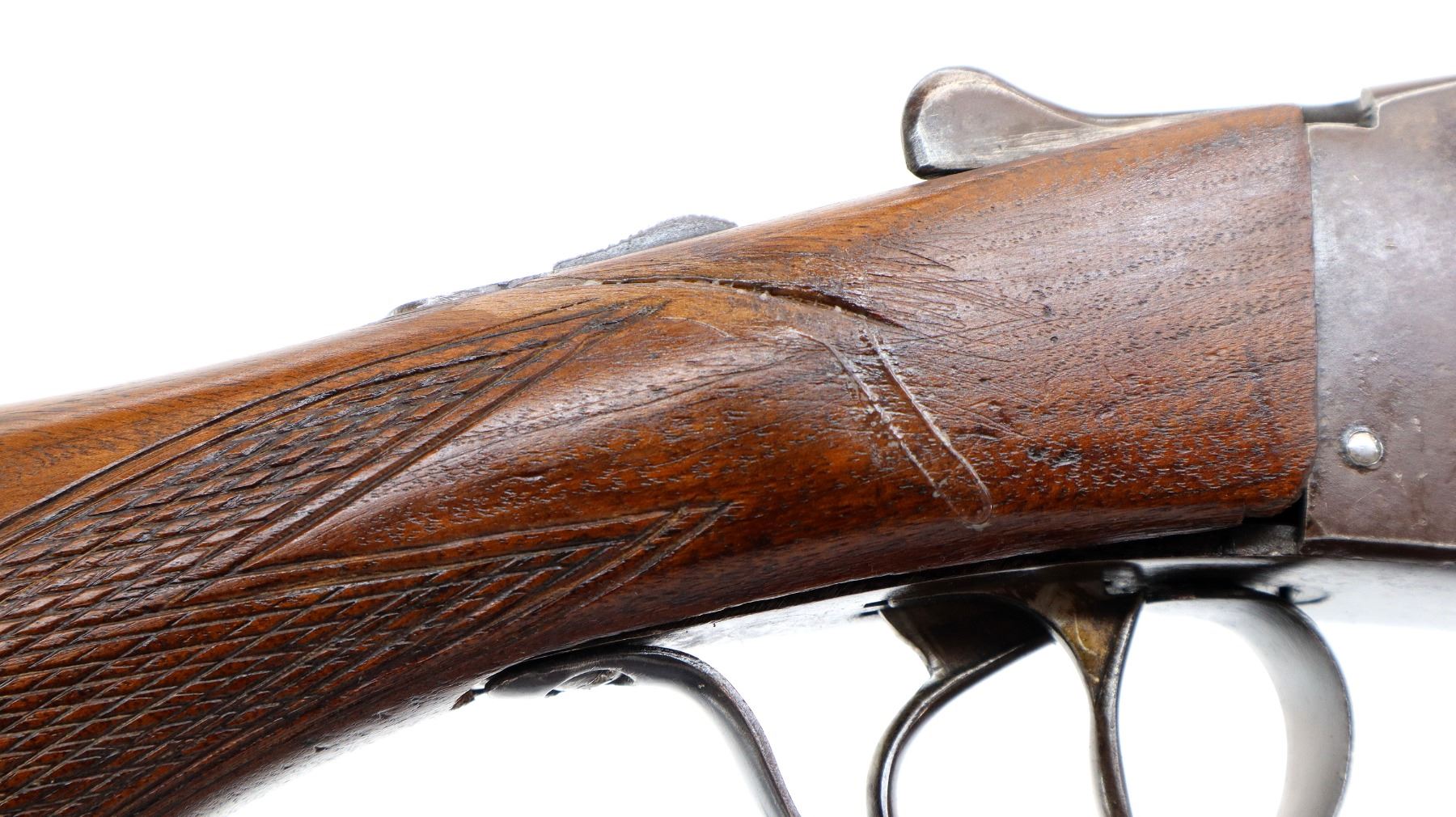 Main Description: Missing front bead, hole present, blued barrels with raised rib, holes drilled into chambers not fireable, automatic safety, action does not function, missing parts. Has extractor, double triggers. Two piece wood stocks, checkered forearm and pistol grip, chipped, cracked and broken behind receiver. Black rubber recoil pad