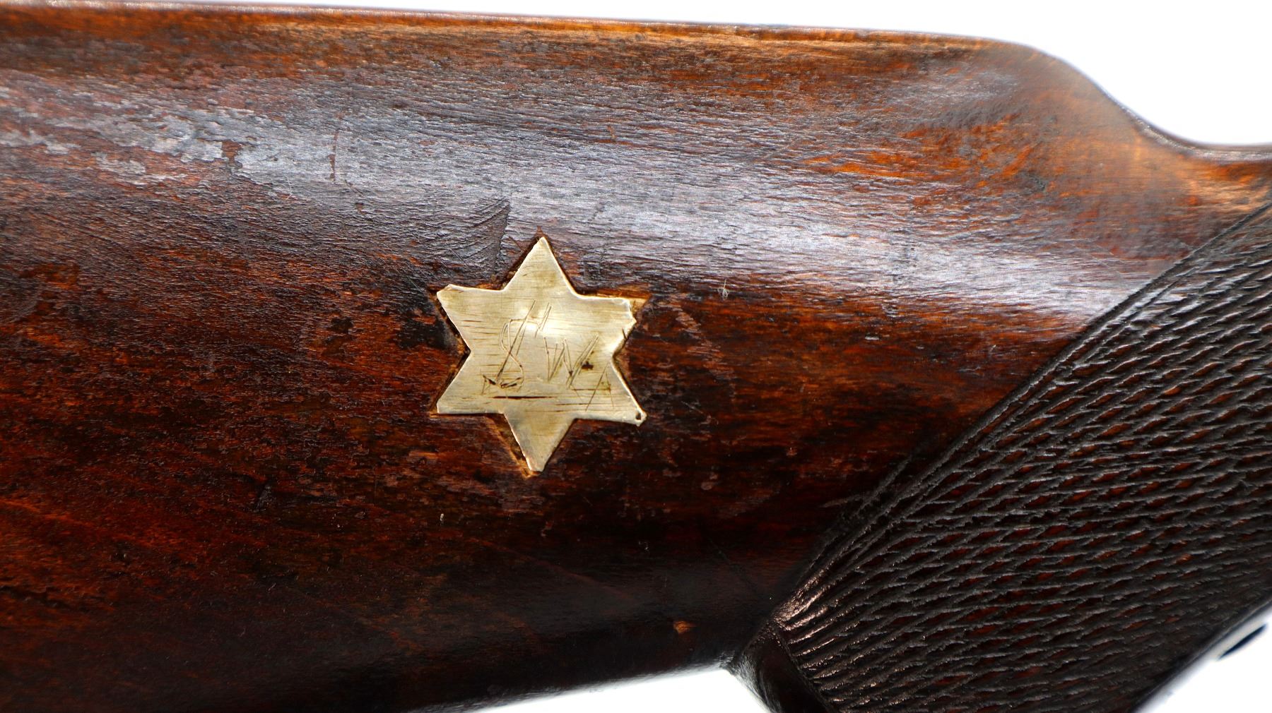 Main Description: Broken bead, laminated steel barrels with smooth rib that are loose on face, back action locks with grooved spur hammers that don't function, opening lever spring is broken, double triggers. Two piece wood stocks, checkered forearm which does not fit correctly not attached requires repair, checkered pistol grip, chipped cracked and broken behind receiver, grooved steel butt plate, stock has chips and cracks along the bottom edge, medallion on right side of stock.