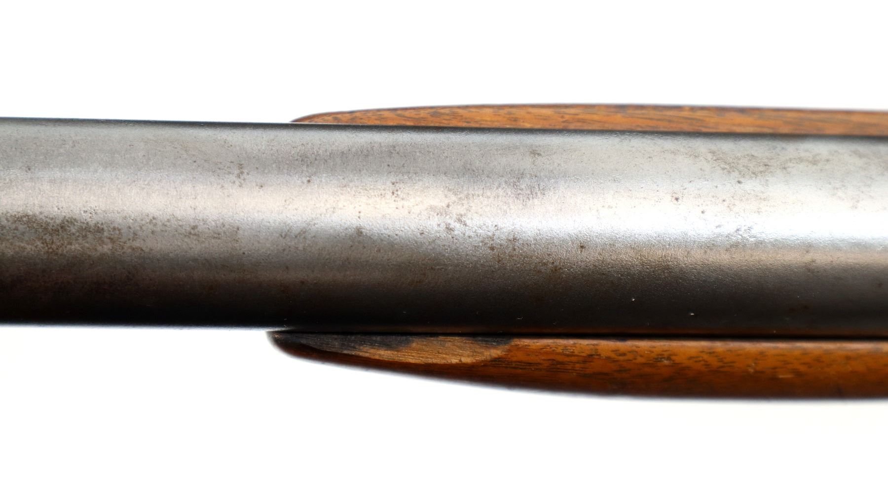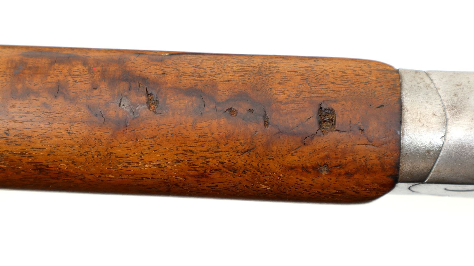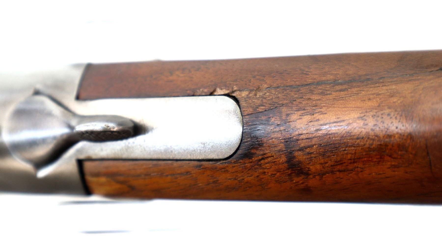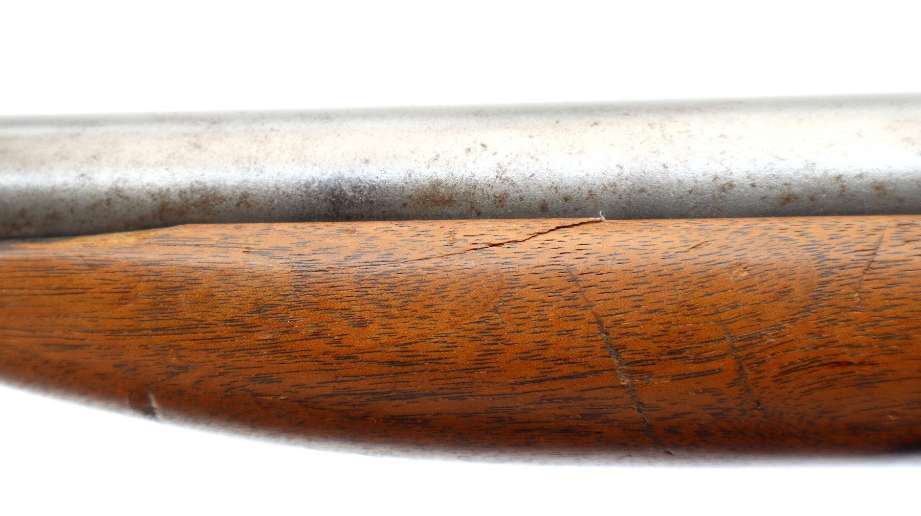 Main Description: Brass bead, round barrel loose on face, checkered spur hammer, ejector. Two piece wood stocks, forearm is cracked, pistol grip, cracked behind receiver and tangs, grooved black polymer butt plate, stock chipped at toe.