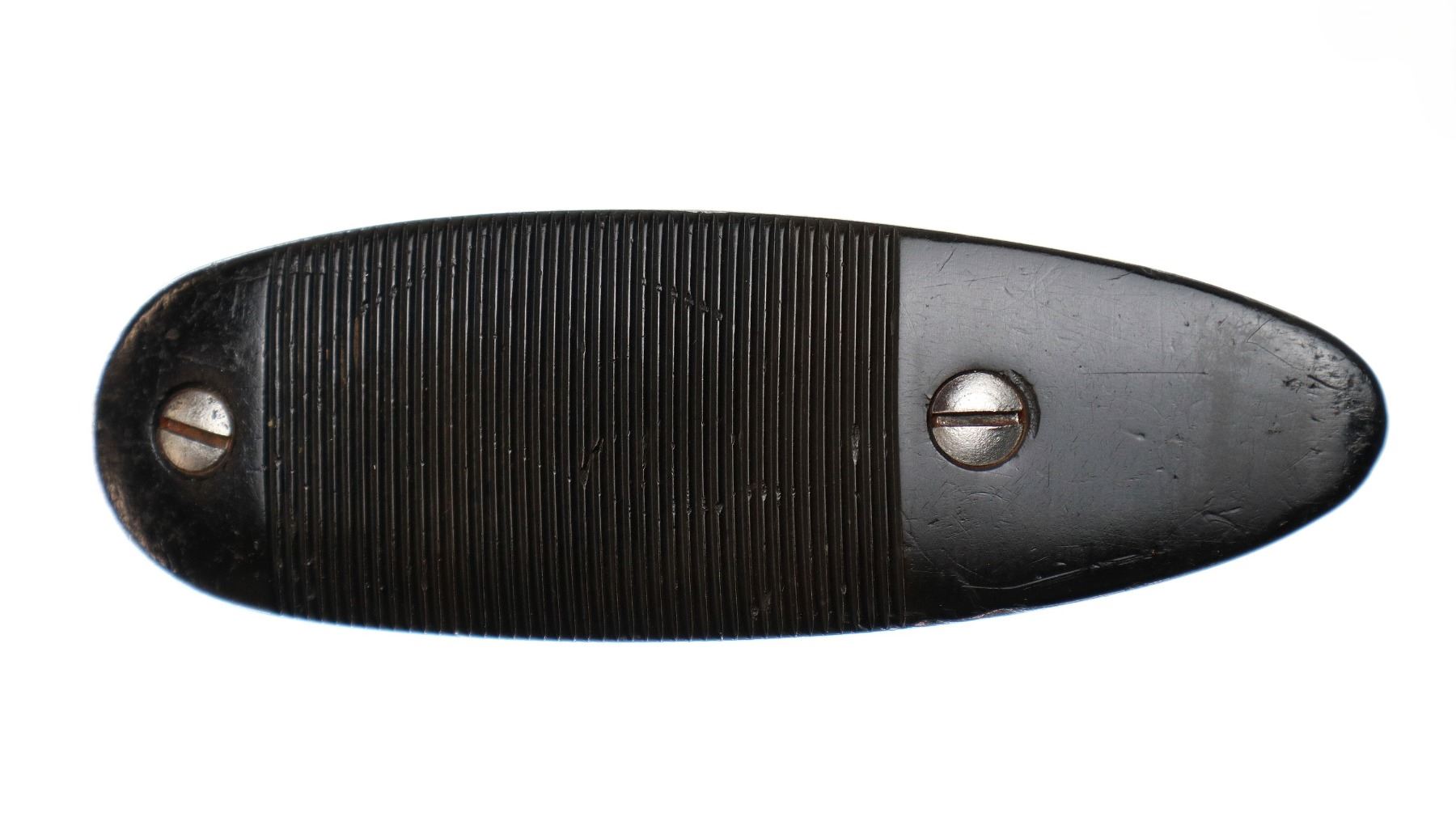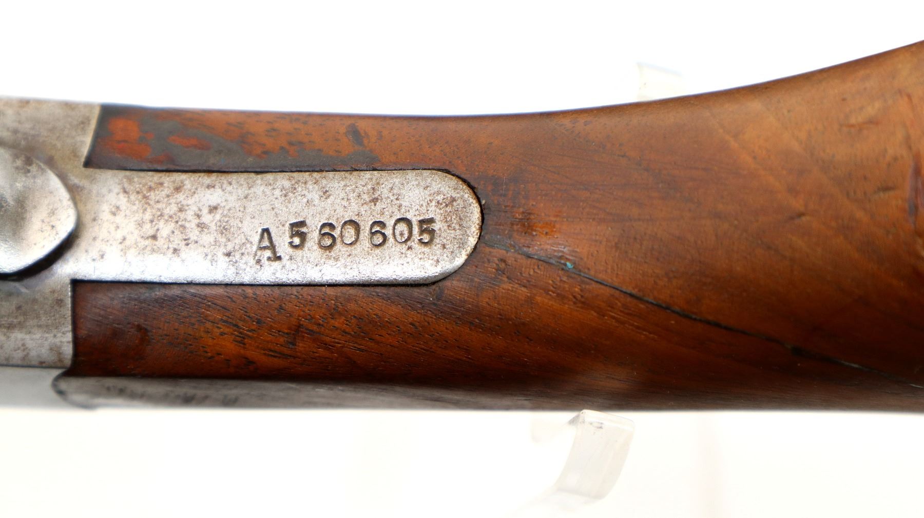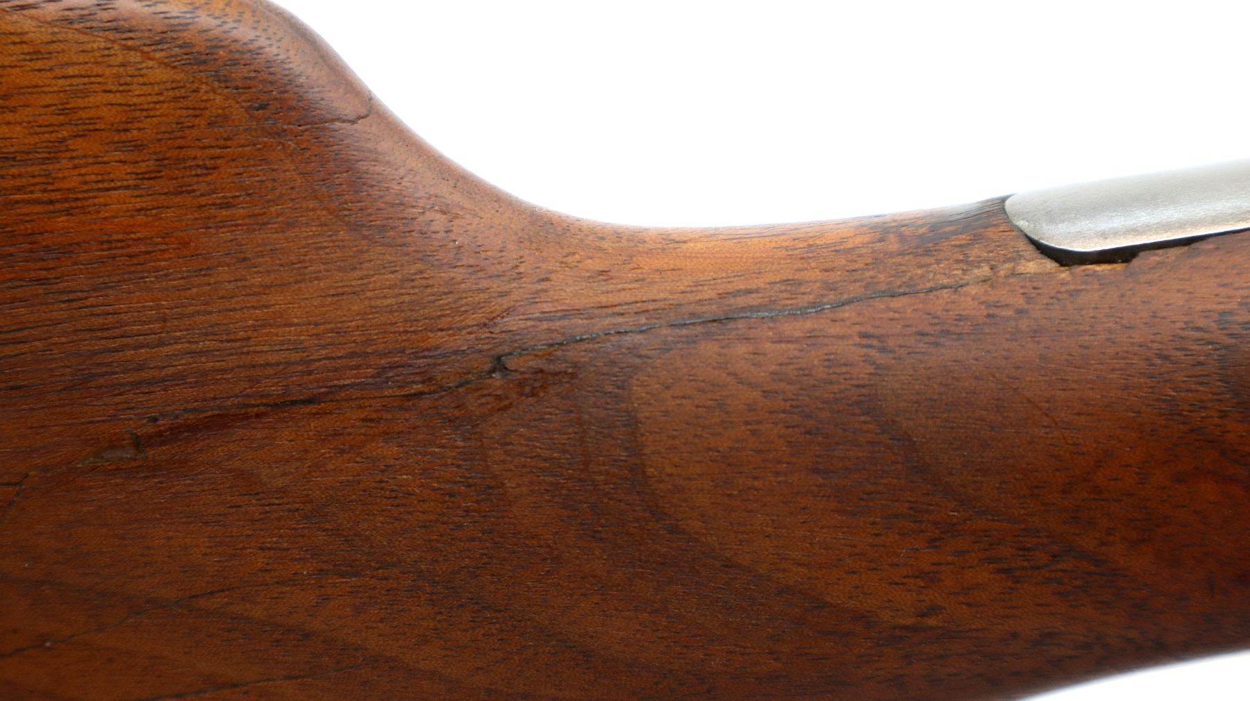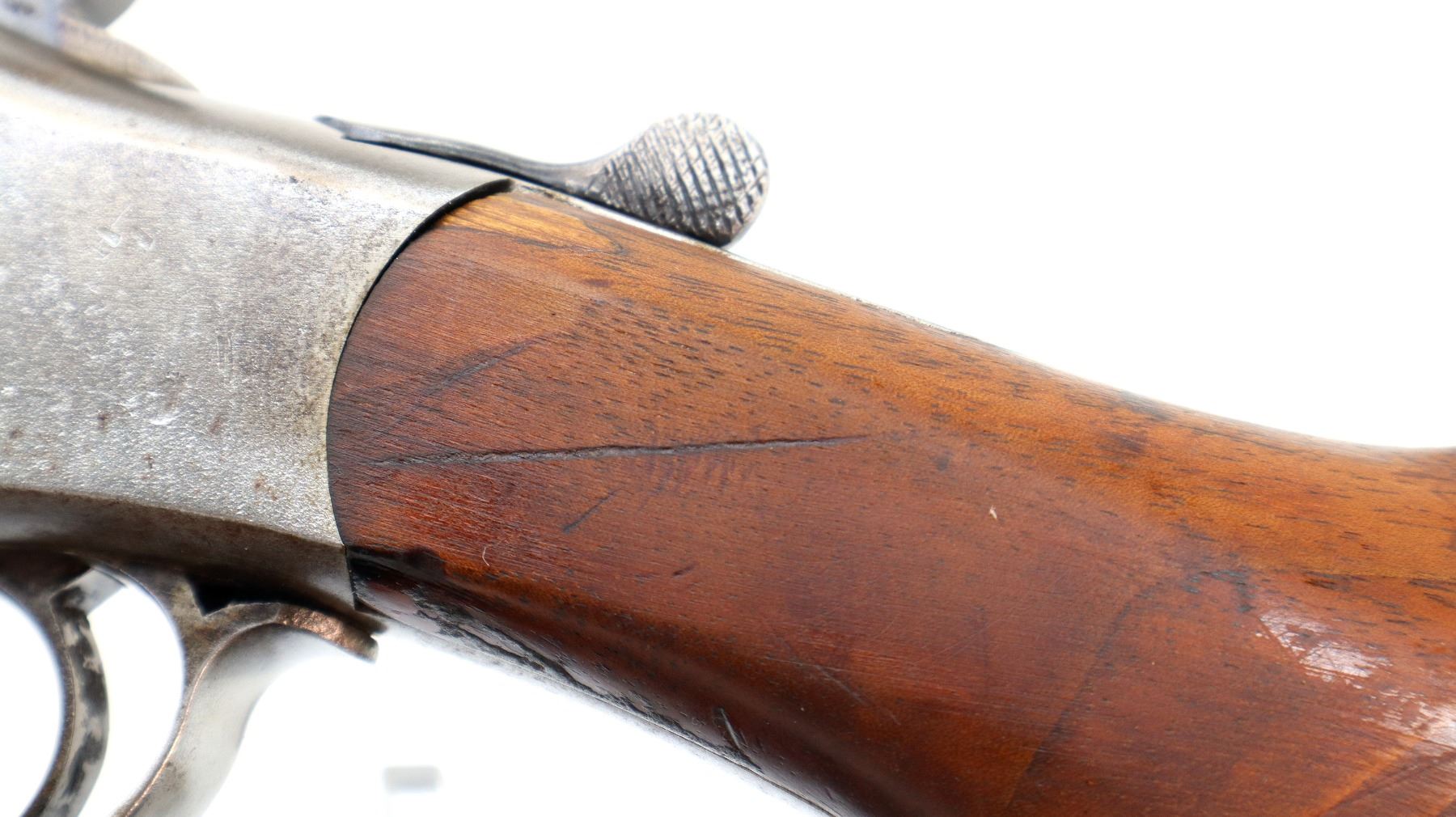 Main Description: Brass bead, round barrel loose on face, checkered spur hammer, ejector. Two piece wood stocks, forearm is cracked, pistol grip, cracked behind receiver and tangs, grooved black polymer butt plate, stock chipped at toe.