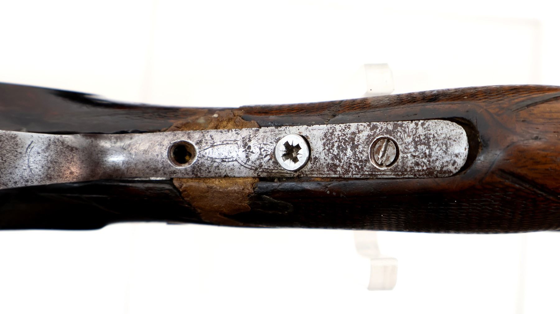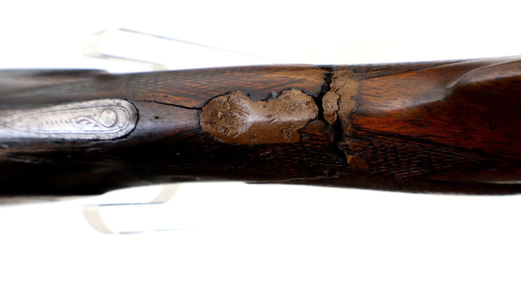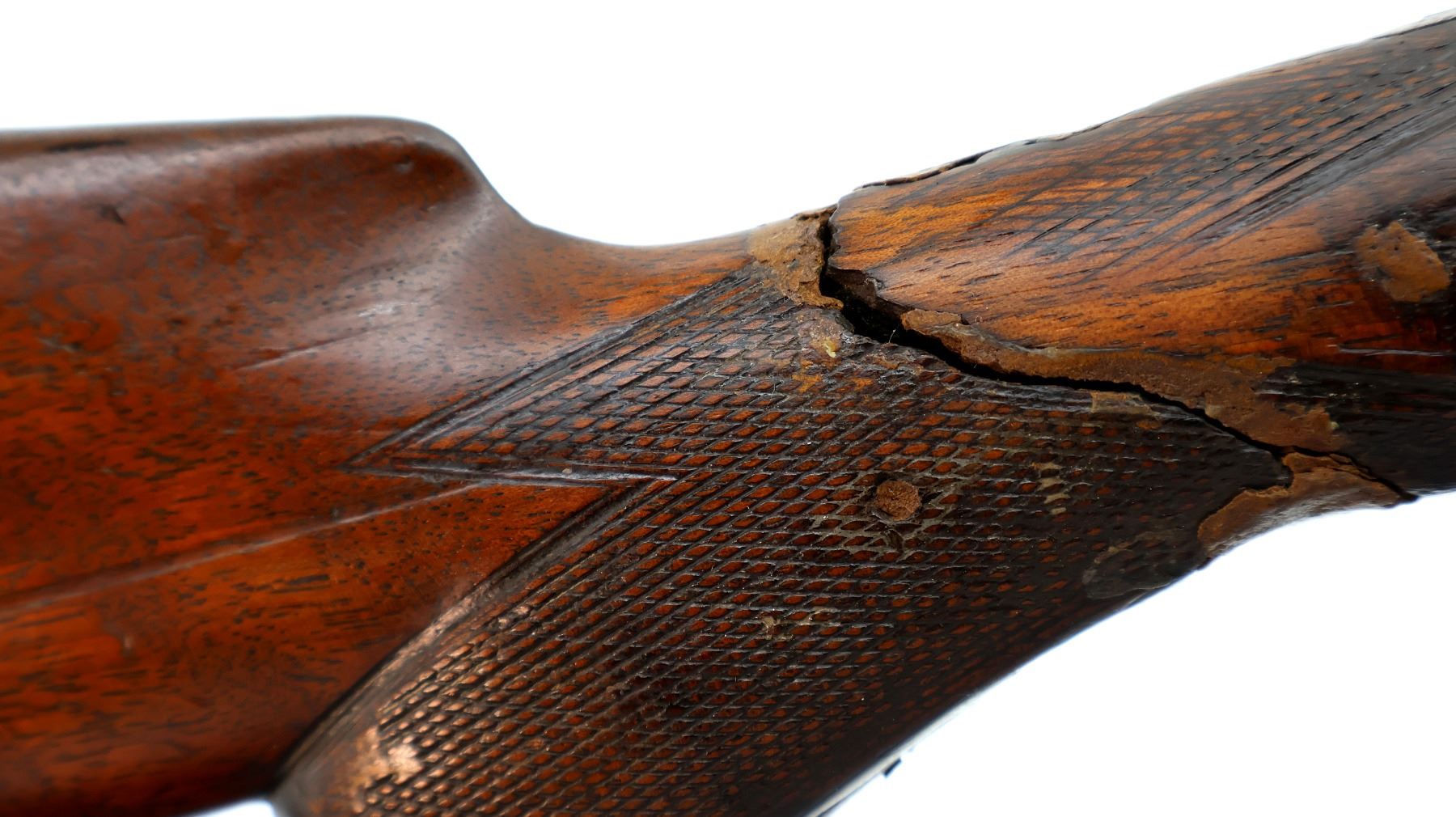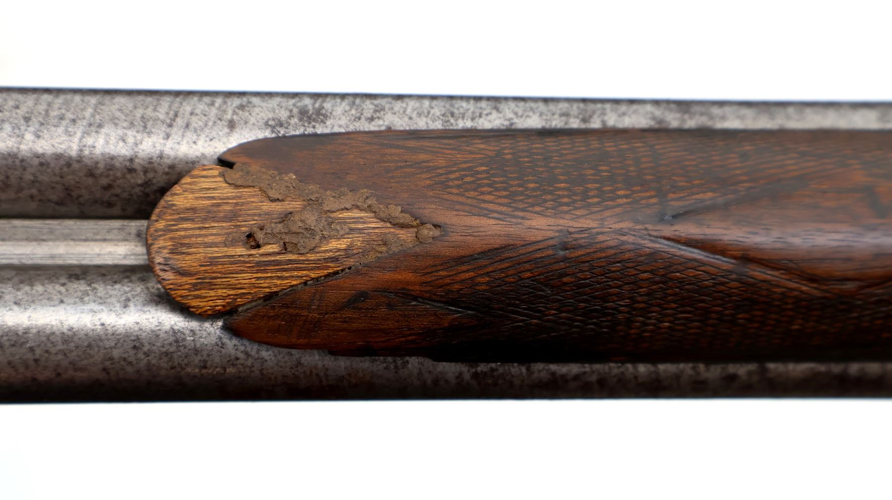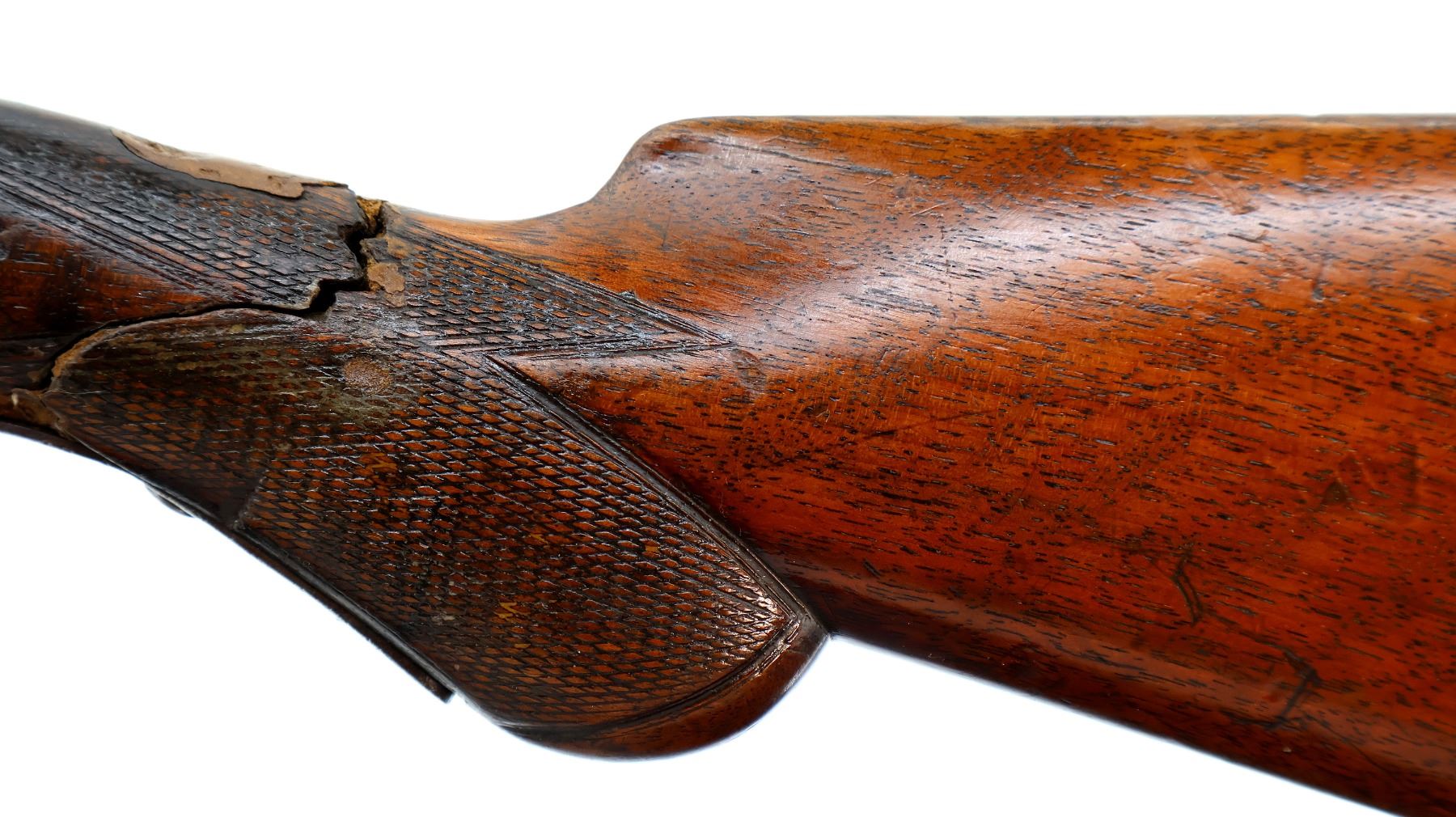 Main Description: Brass bead, Damascus barrels with smooth rib that are loose on face, engraved receiver and side locks with checkered spur hammers that function, extractor, double triggers. Two piece wood stocks, checkered forearm, tip insert has been replaced with wood, checkered pistol grip, chipped cracked and broken through wrist, grooved horn butt plate, vanity plate