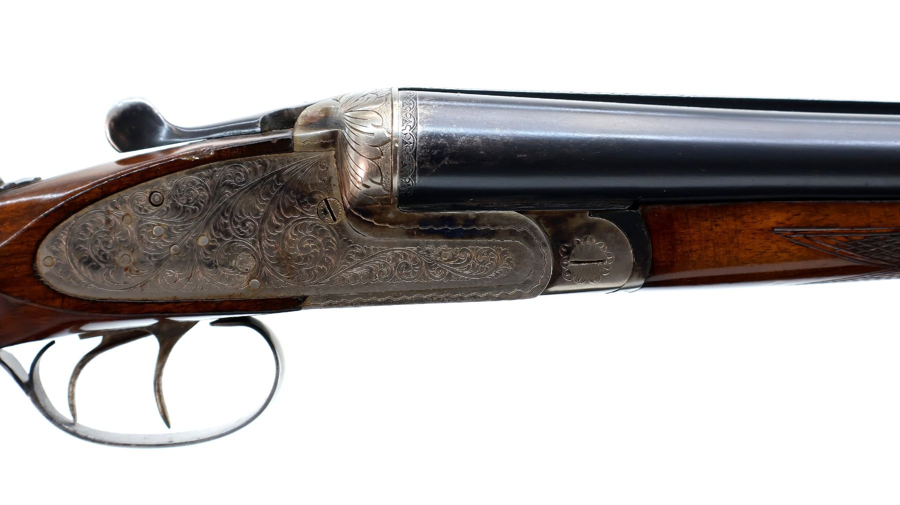 Main Description: Brass bead, blued barrels with solid rib that are loose on face, engraved colour case hardened receiver and side locks, automatic safety, action does not function requires adjustment parts or repair, extractor, double triggers. Two piece wood stocks, checkered forearm and straight grip, basketweave checkered black polymer butt plate, has a rear swivel stud front is broken off.