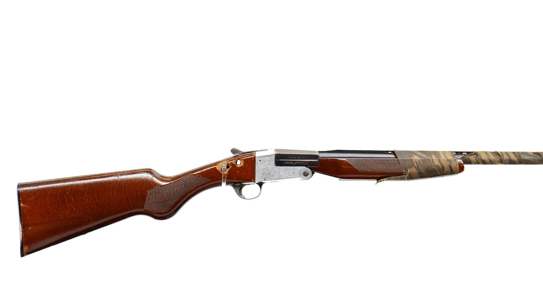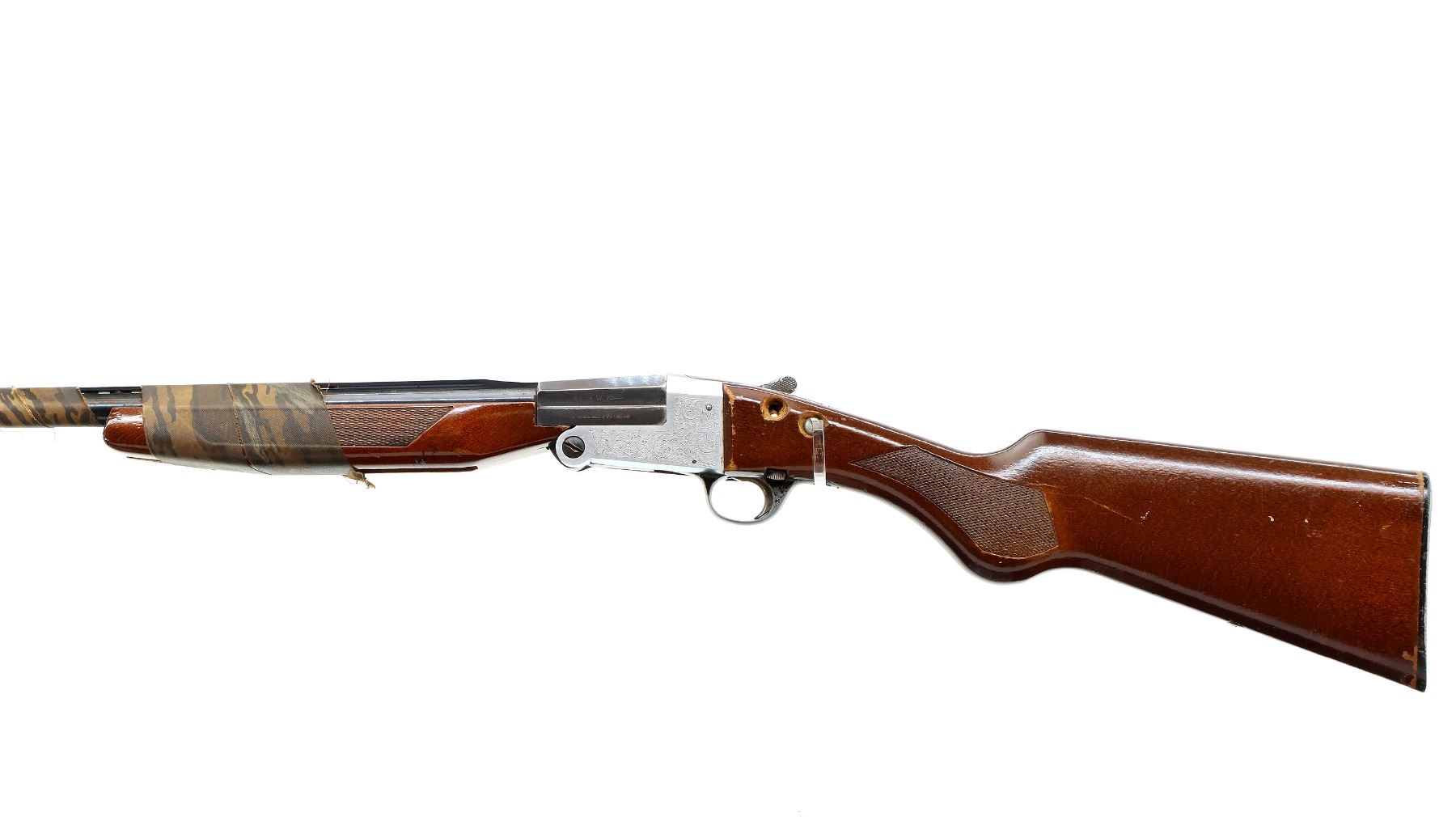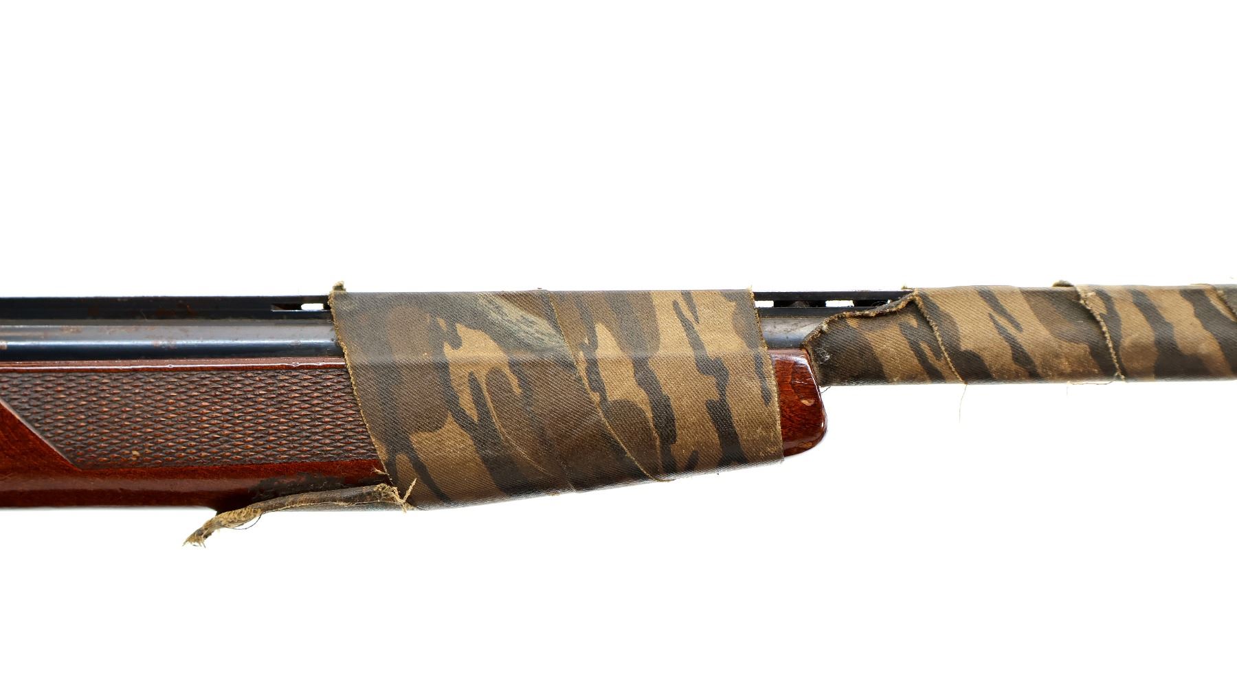 Main Description: Missing bead, blued vent rib barrel with threaded muzzle attachment, barrel is loose on face. Engraved silver receiver, extractor. Two piece wood stocks, checkered forearm wrapped with camo tape which extends down the barrel, checkered pistol grip, cracked with holes on both sides and one bolt, stock is still loose, checkered black polymer butt plate.