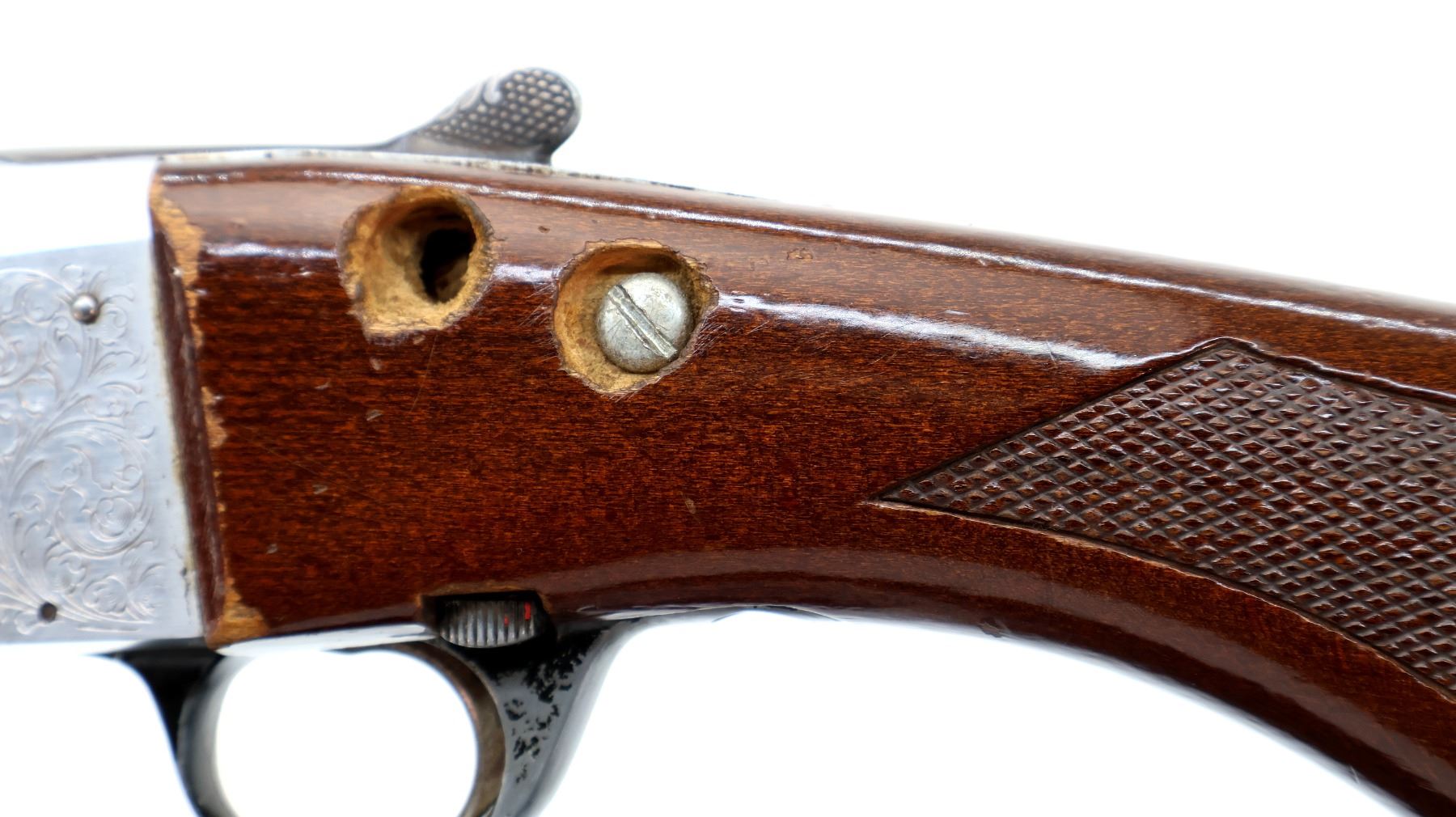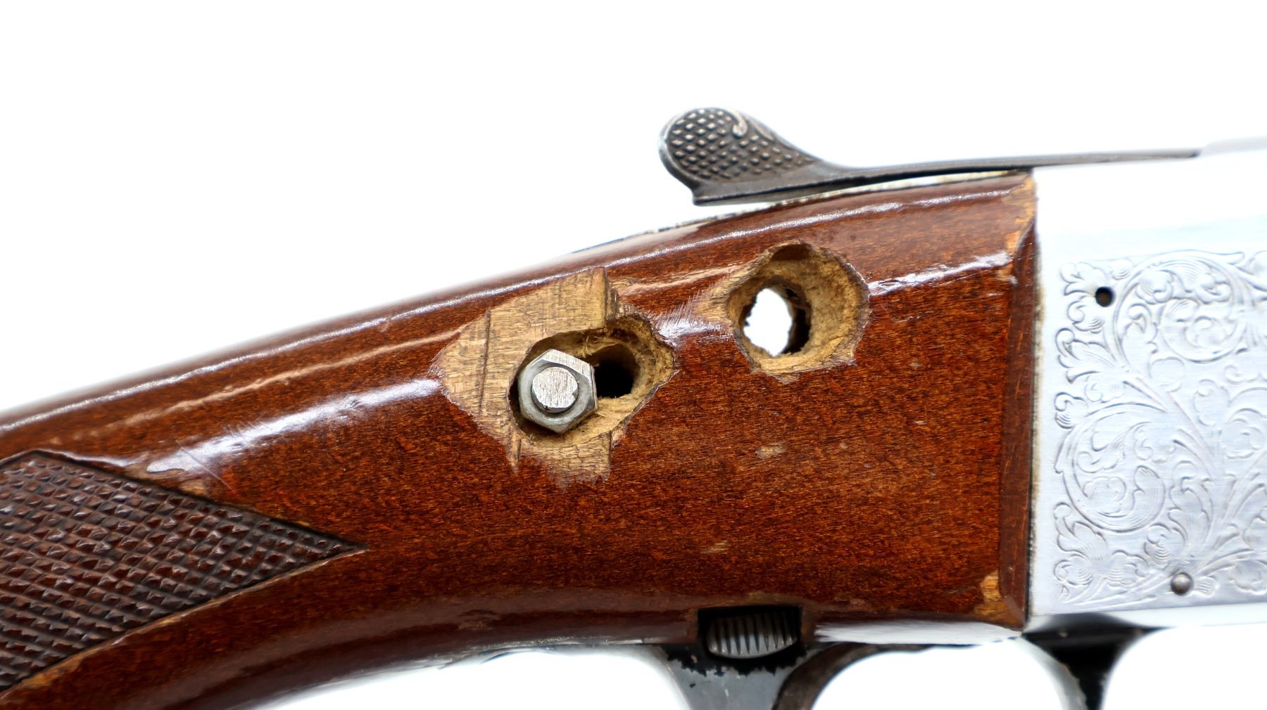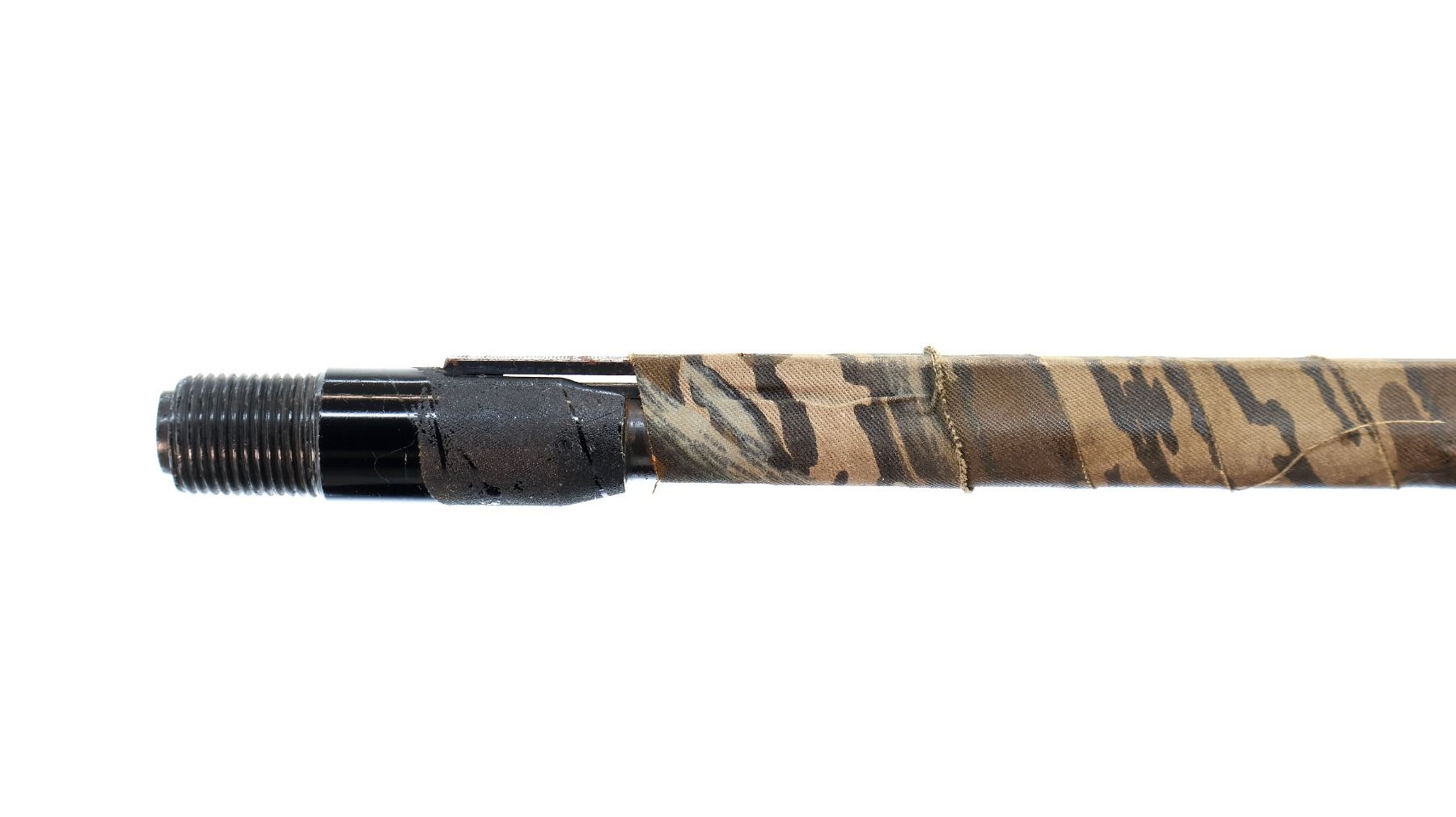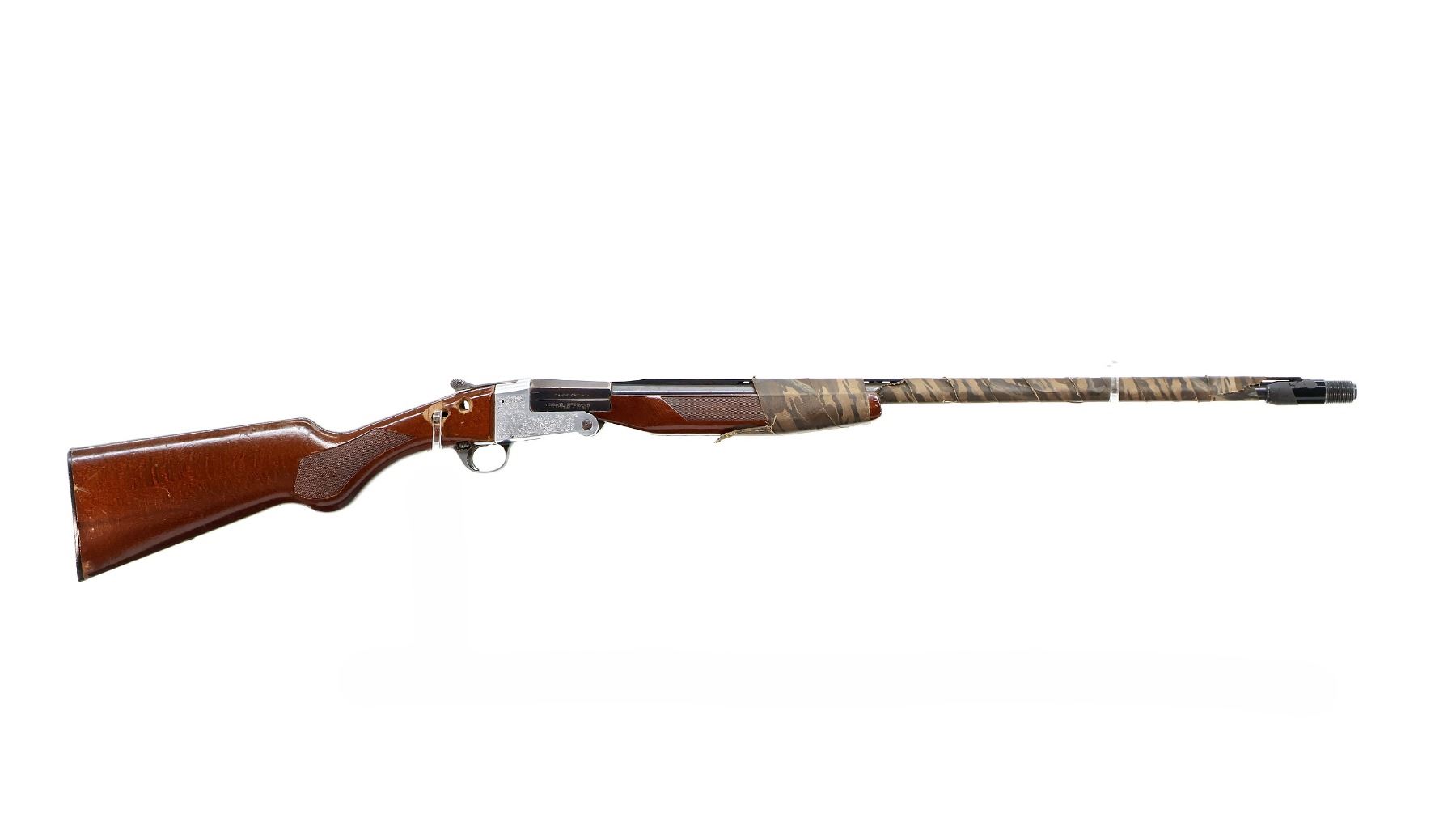 Main Description: Missing bead, blued vent rib barrel with threaded muzzle attachment, barrel is loose on face. Engraved silver receiver, extractor. Two piece wood stocks, checkered forearm wrapped with camo tape which extends down the barrel, checkered pistol grip, cracked with holes on both sides and one bolt, stock is still loose, checkered black polymer butt plate.