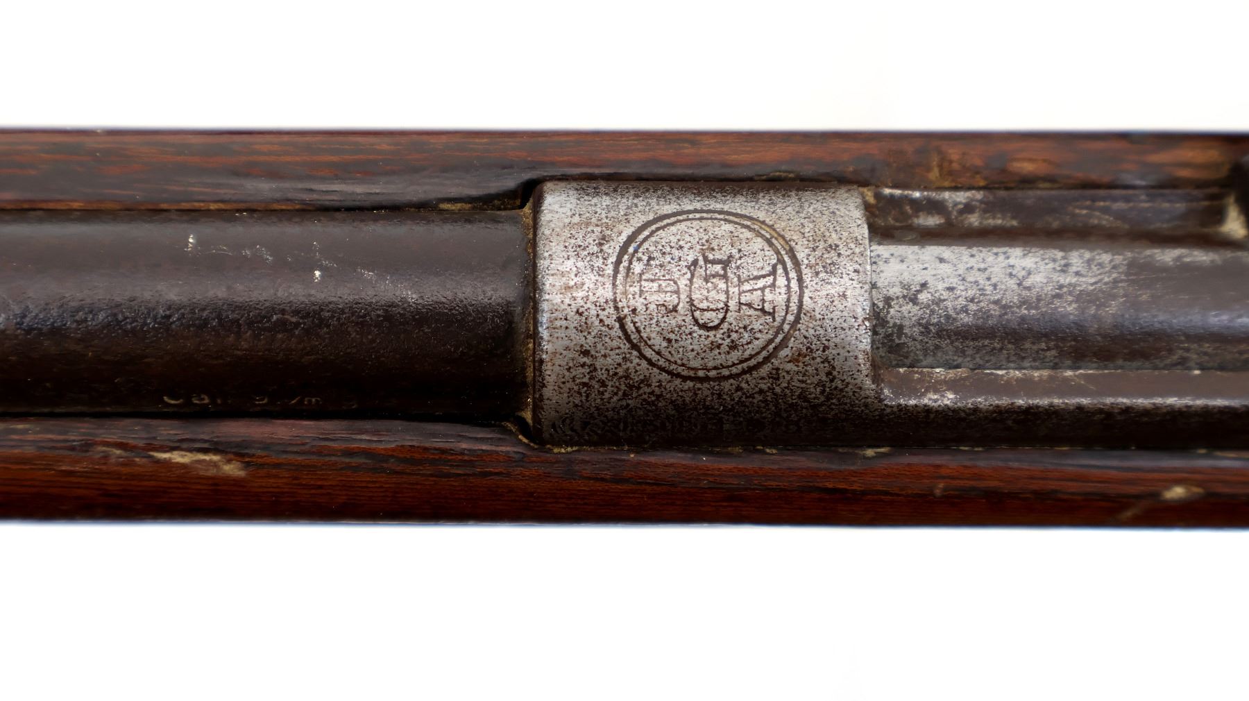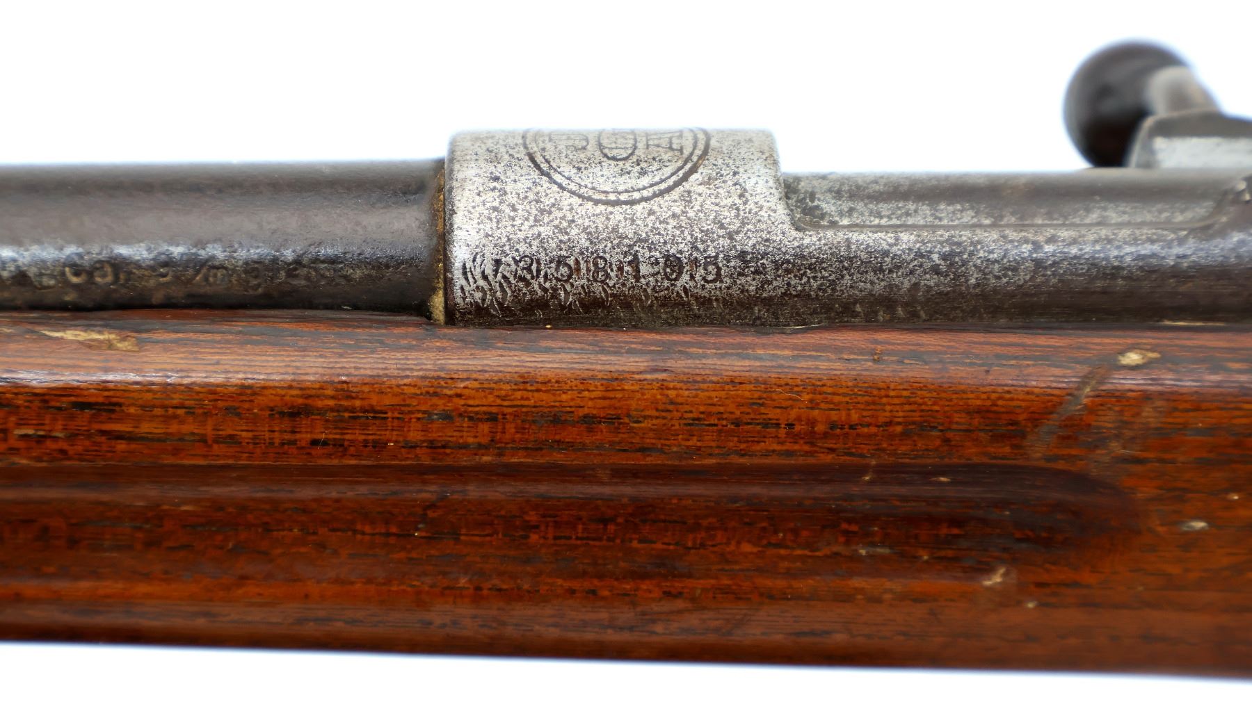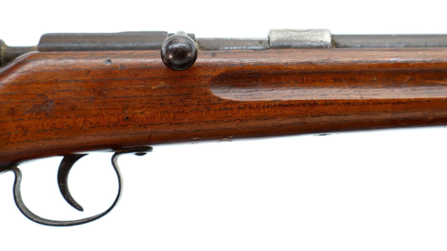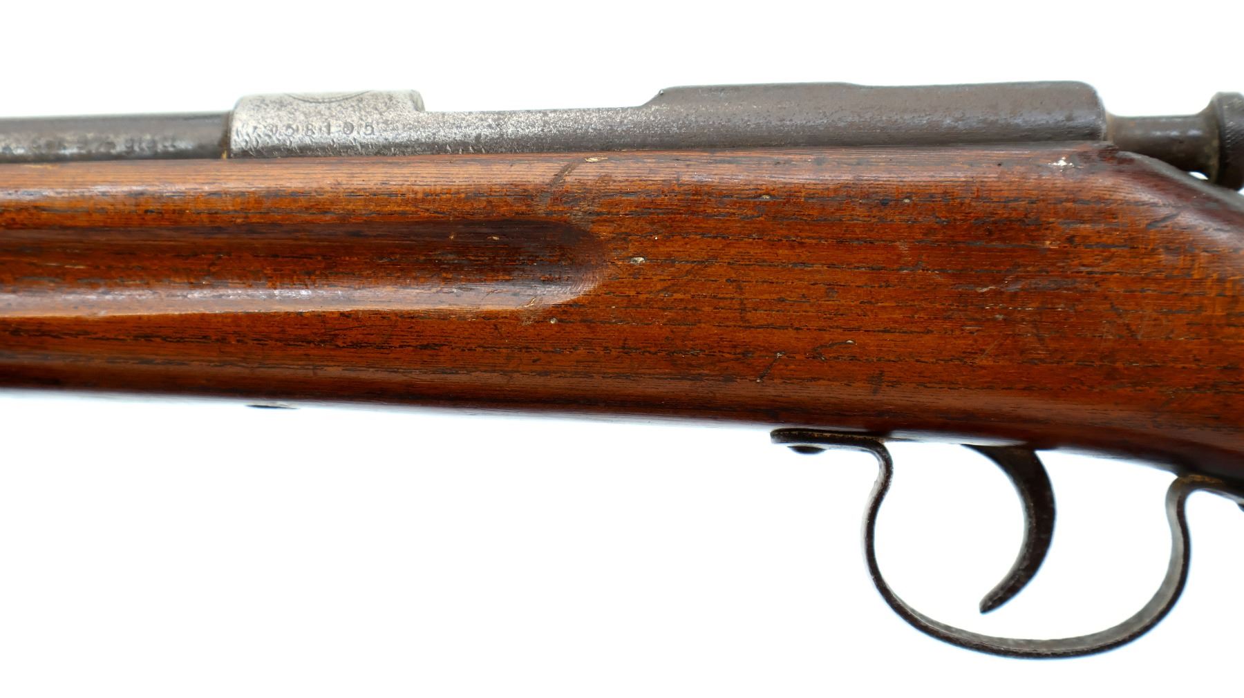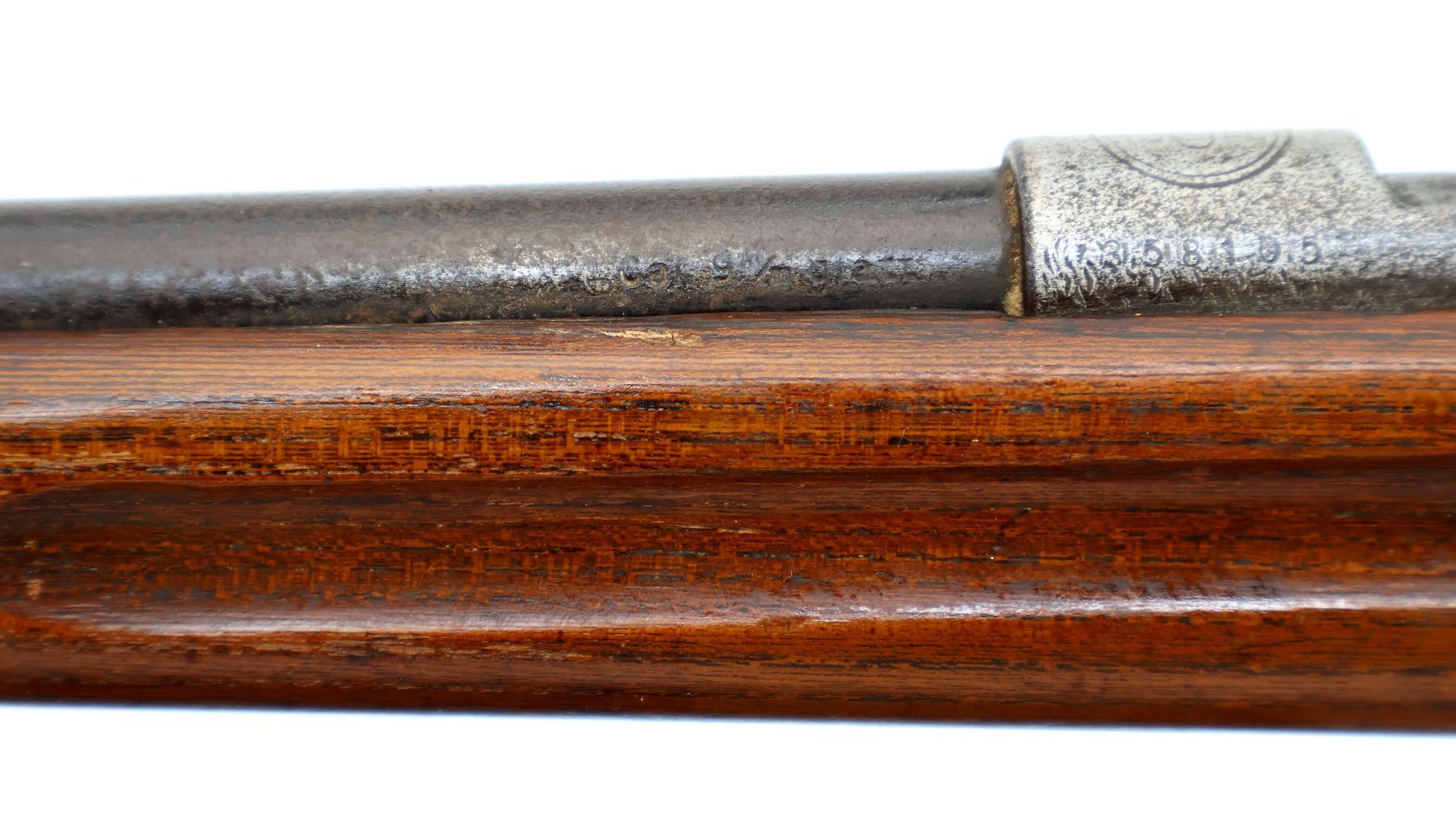Main Description: Blade front sight, u notched rear sight, grooved bolt knob, extractor is present. One piece wood stock, finger grooved forearm, pistol grip chipped behind receiver, smooth butt chipped at toe, action screw is replaced.