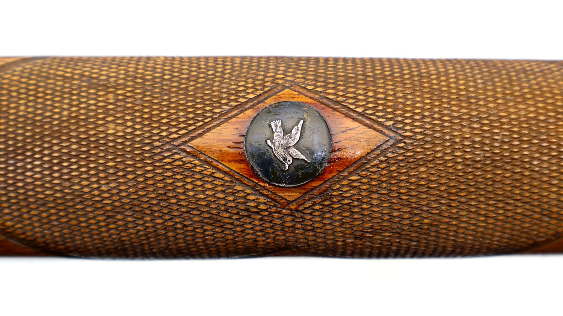 Main Description: Silver bead, blued finish, round barrel, jewelled bolt, missing ejector assembly. One trigger guard screw is replaced. Two piece wood stocks, checkered forearm, pistol grip and black polymer butt plate, stock is chipped, cracked and broken around receiver wrapped with tape.