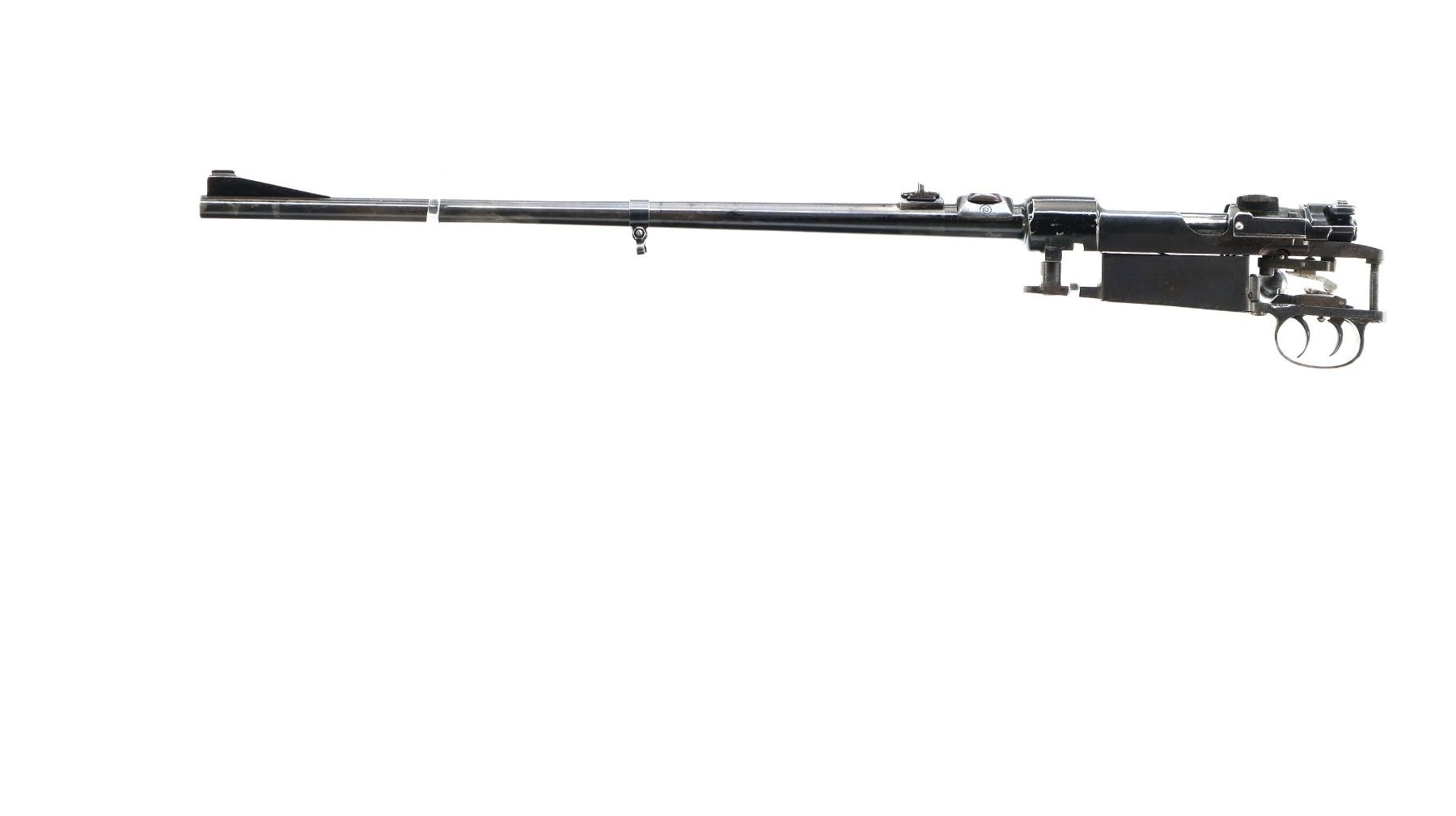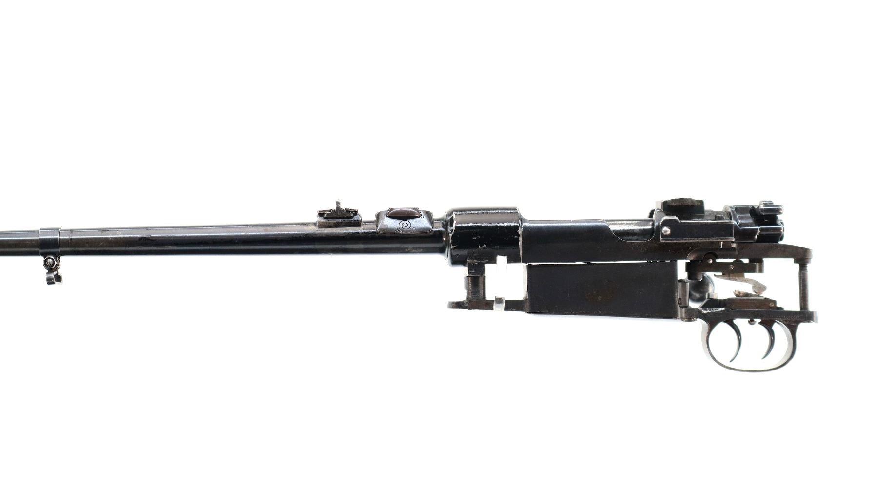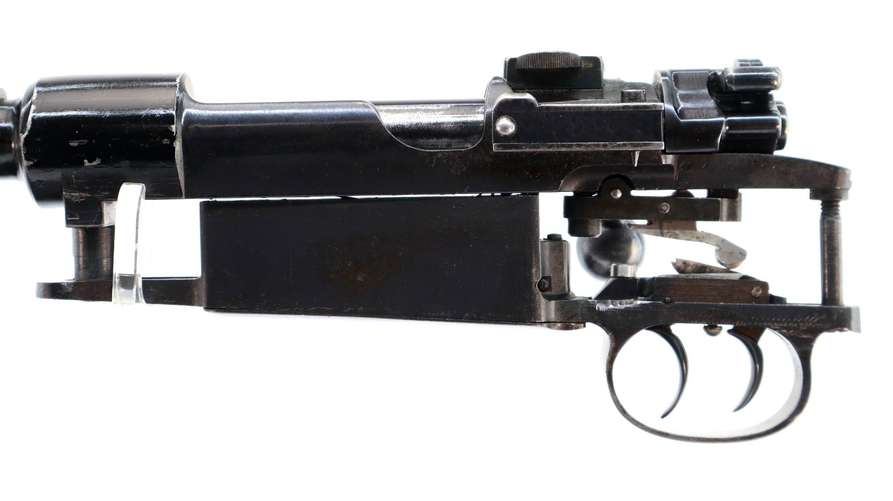 Main Description: Blade front sight with ramp, adjustable u notched rear sight with one fixed and two folding leafs, blued/black painted metal finish, receiver and barrel have QD claw mount bases only. Turned down bolt handle, includes double set triggers, trigger guard and action screws, front sling swivel, missing complete stock.