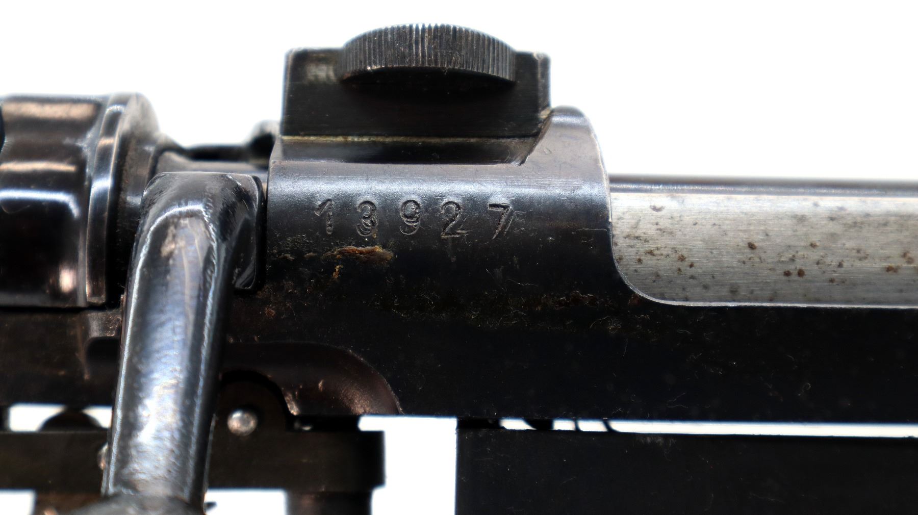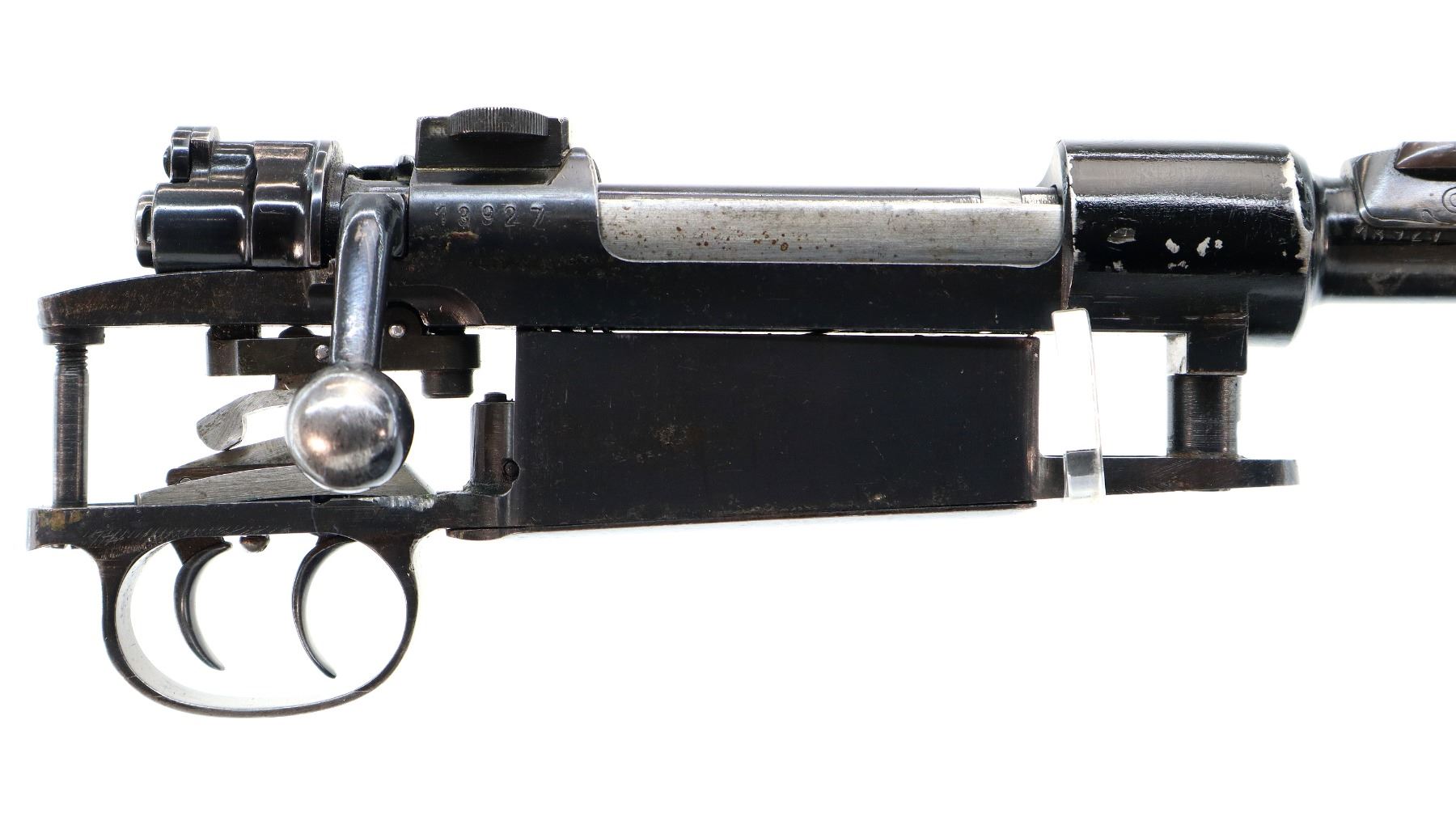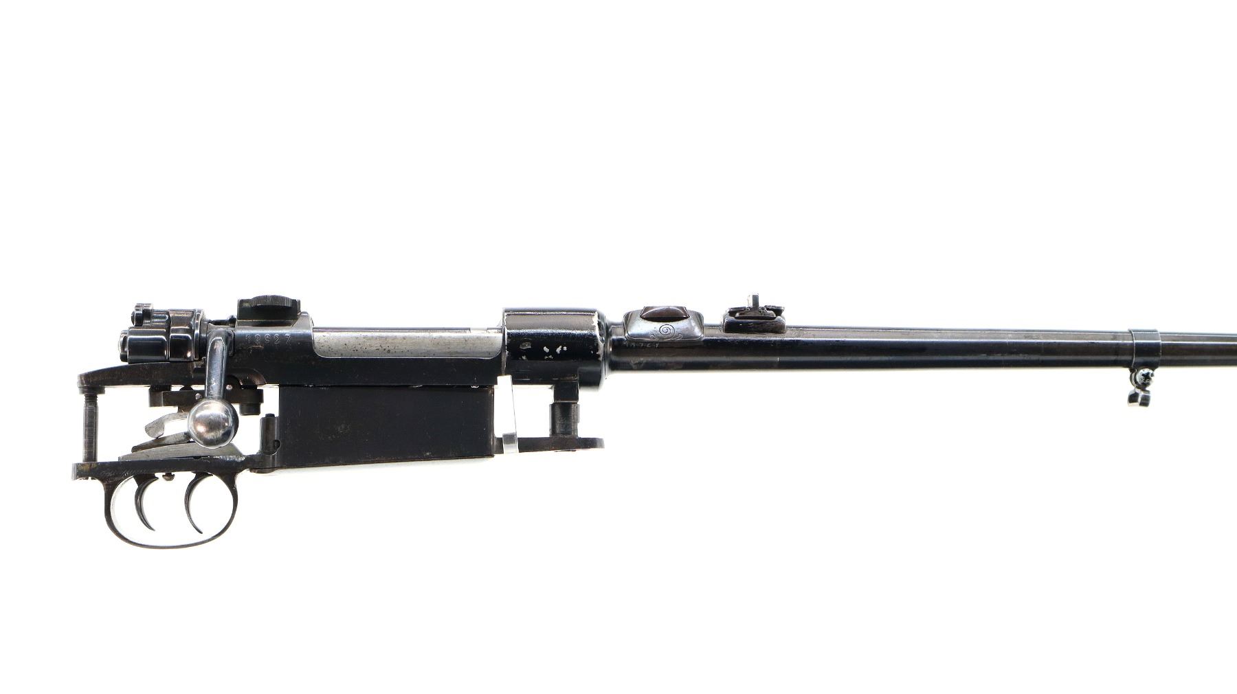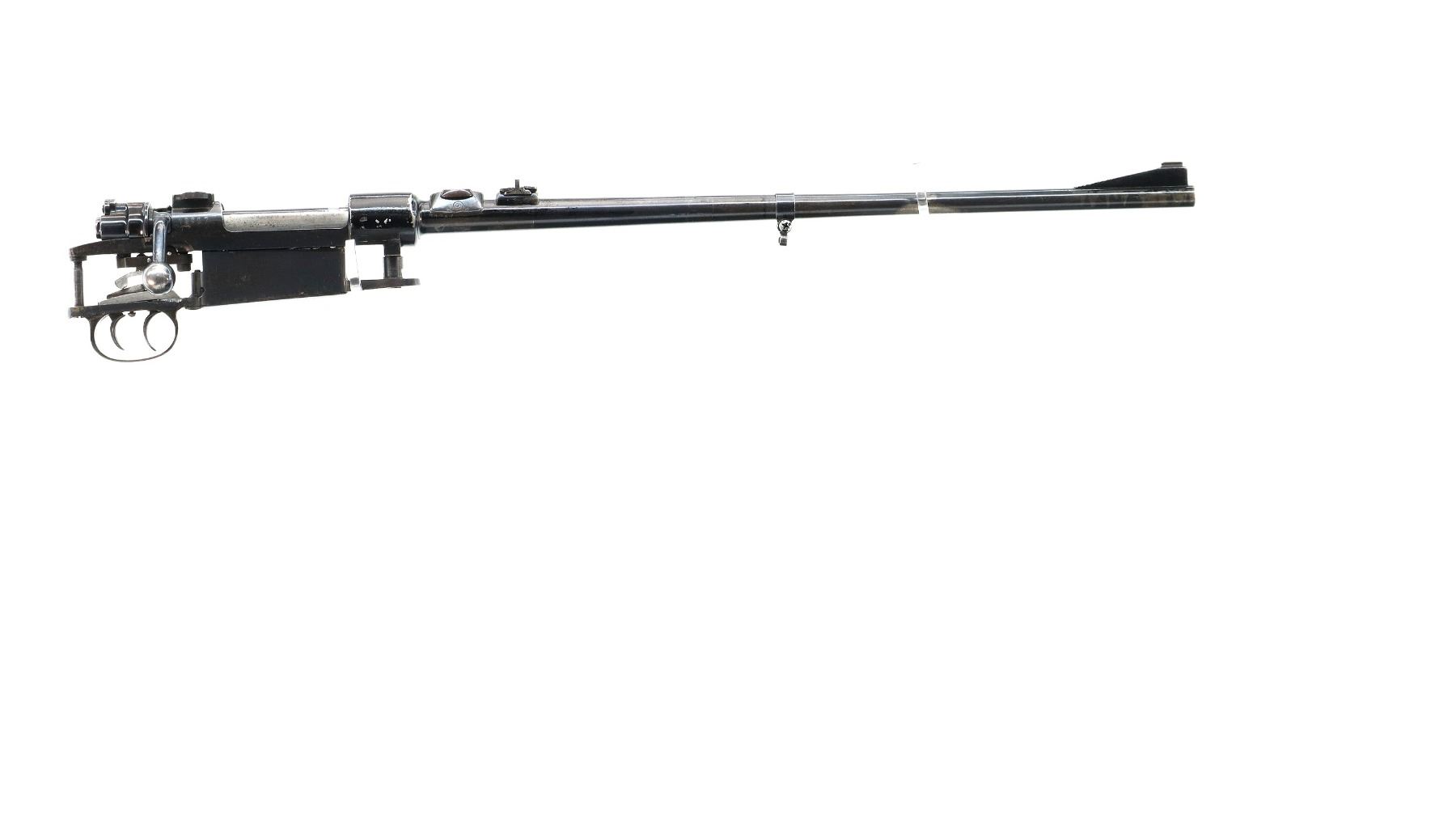 Main Description: Blade front sight with ramp, adjustable u notched rear sight with one fixed and two folding leafs, blued/black painted metal finish, receiver and barrel have QD claw mount bases only. Turned down bolt handle, includes double set triggers, trigger guard and action screws, front sling swivel, missing complete stock.