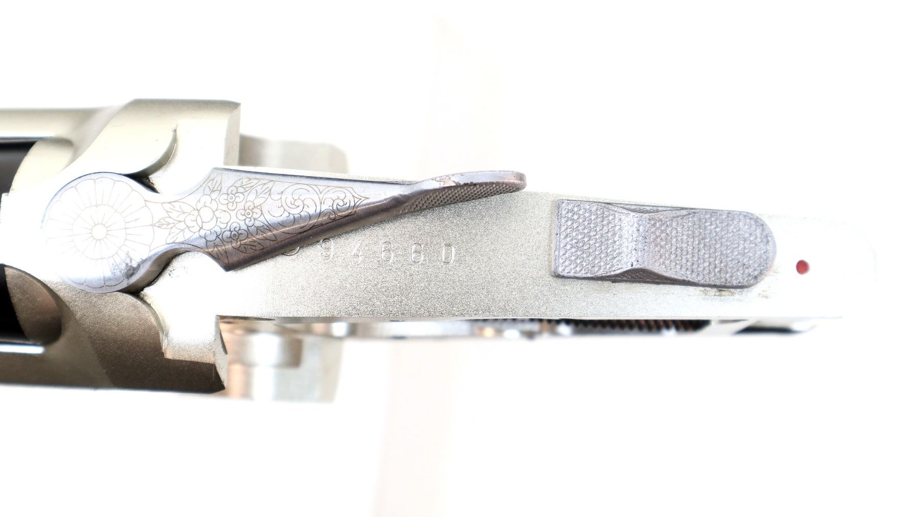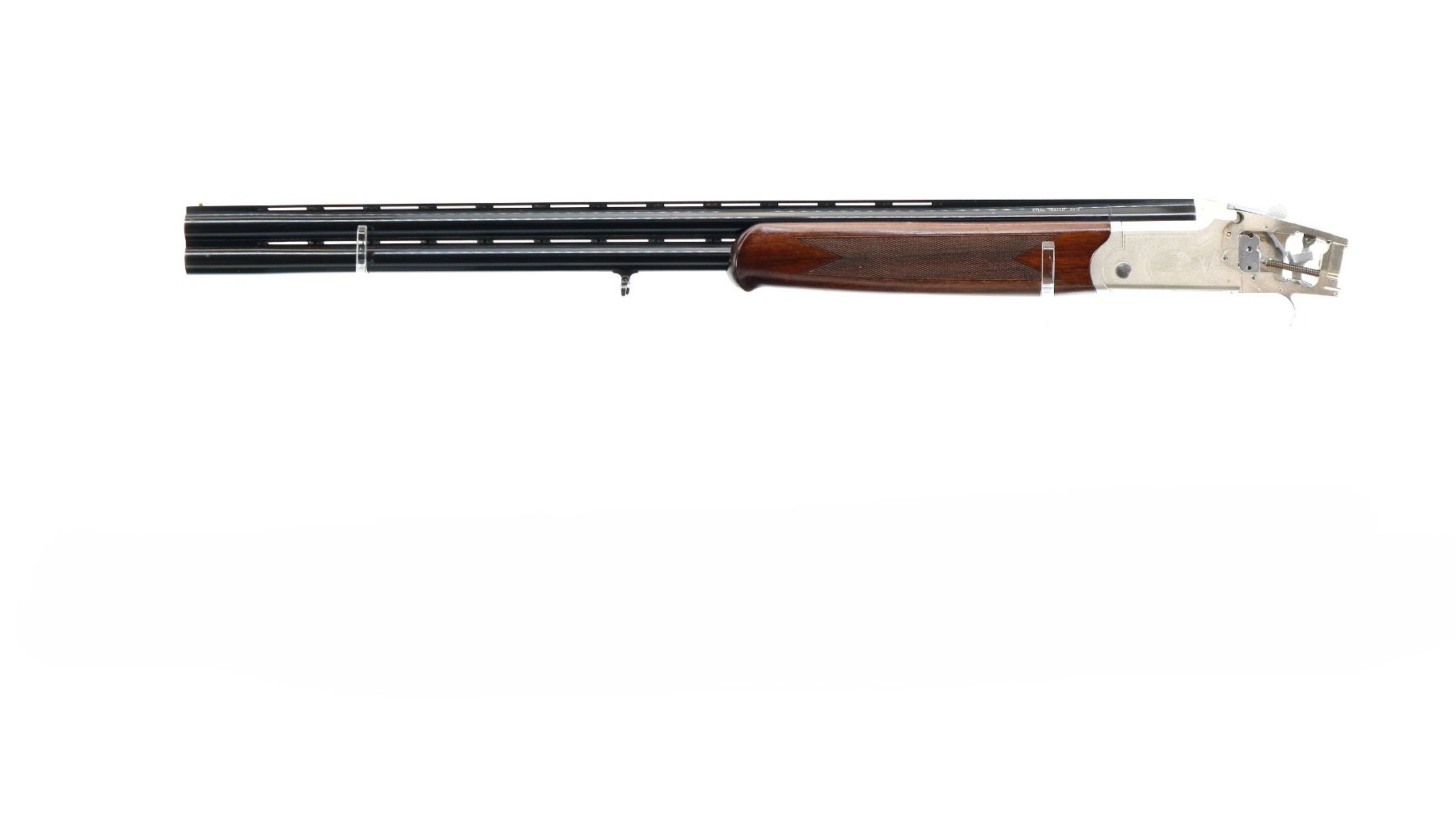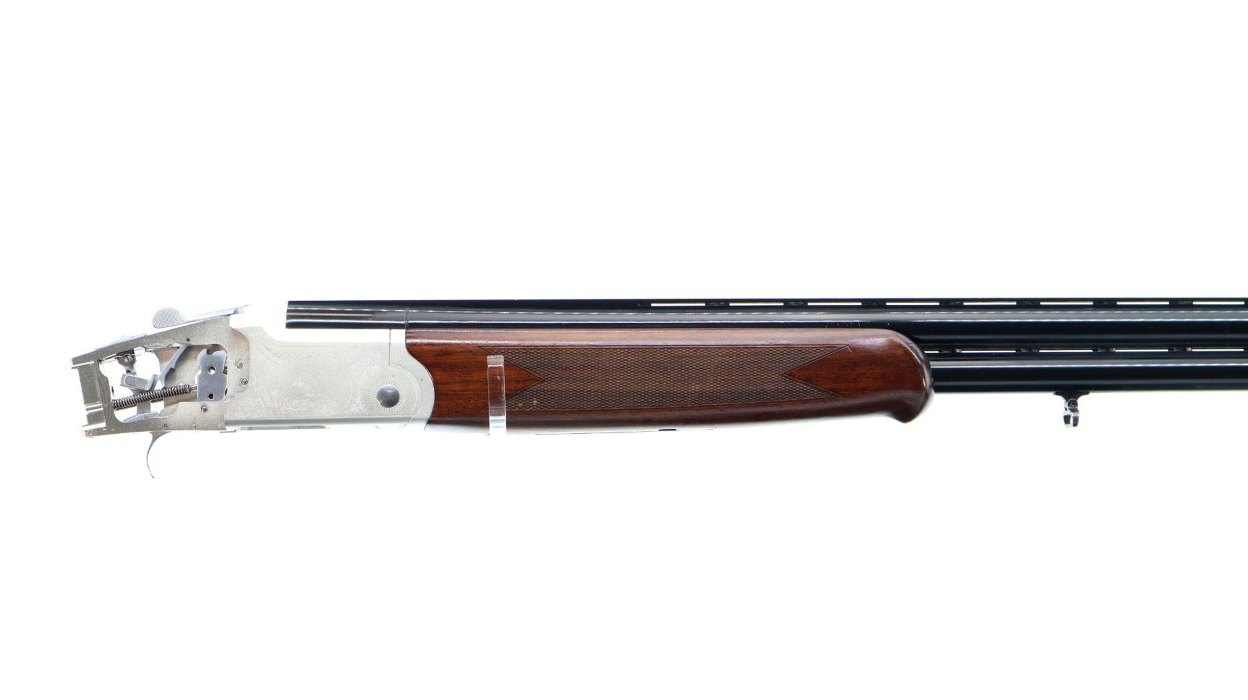 Main Description: Brass bead, blued vent rib barrels, silver engraved alloy receiver, manual selective safety, action does not function missing bottom plate, trigger guard and possibly other small parts. One piece checkered wood forearm, butt stock assembly is not included.
