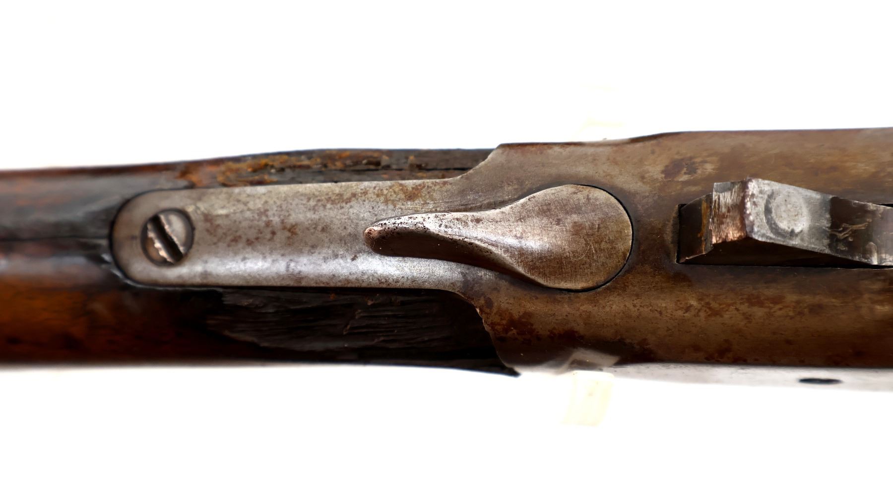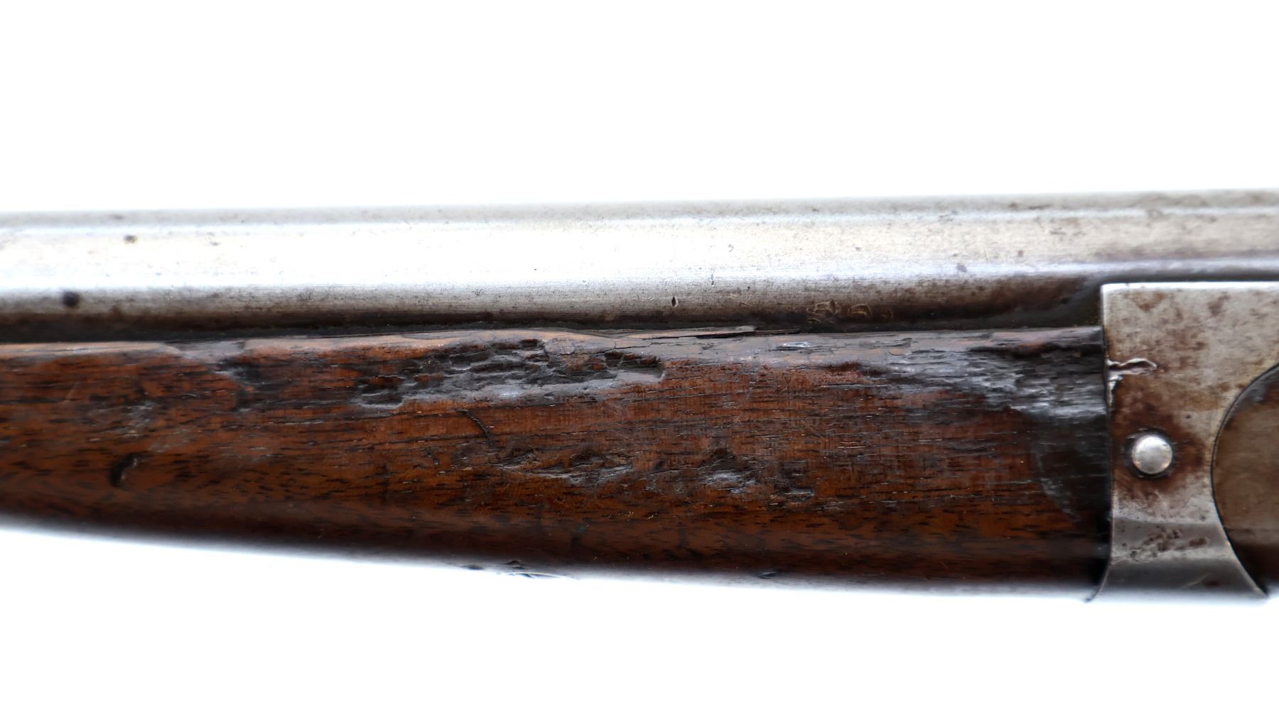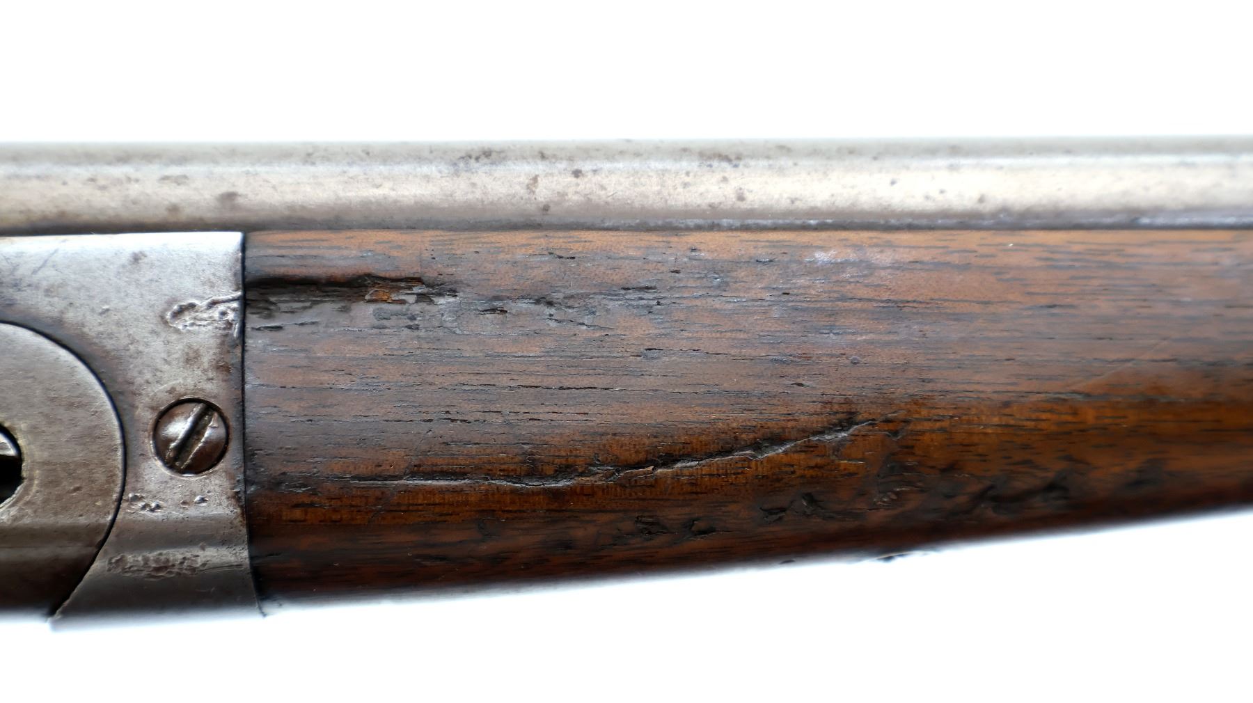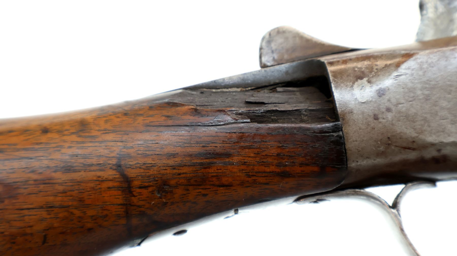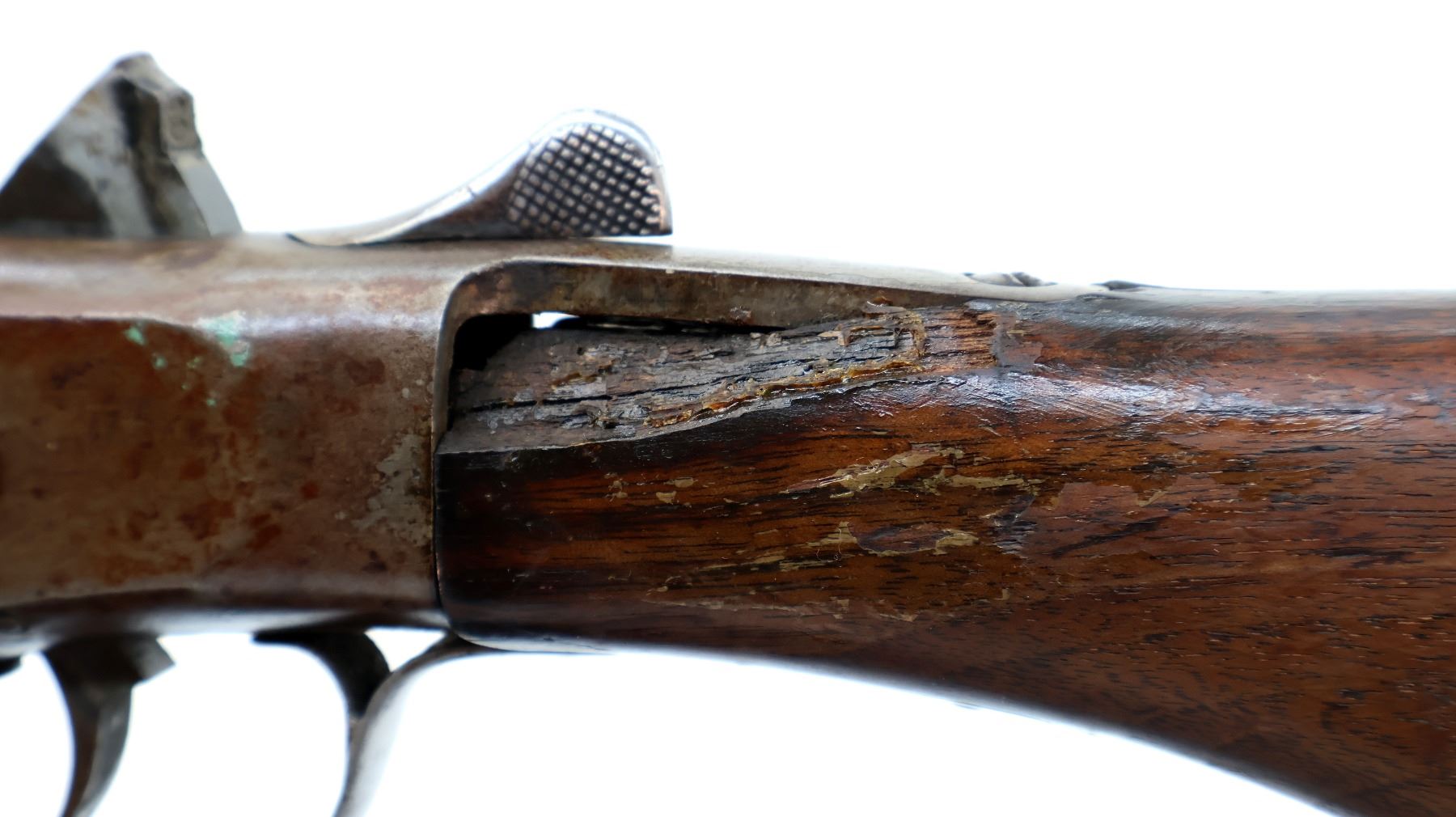 Main Description: Brass bead, round barrel loose on face, action is misassembled does not function requires parts or repair, extractor. Two piece wood stocks, forearm is chipped and cracked, pistol grip chipped cracked and loose behind receiver, missing butt plate and screws.
