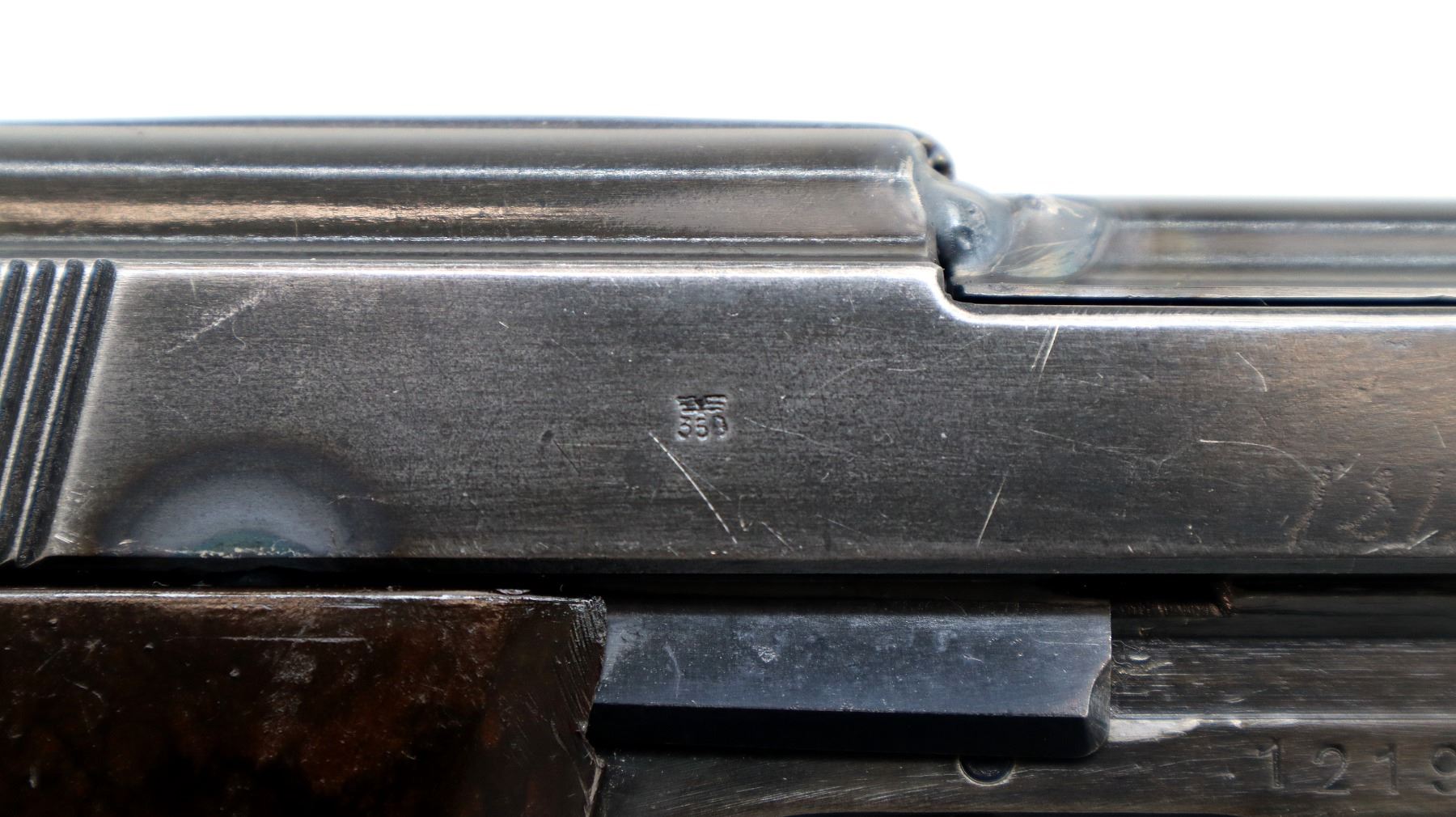 Main Description: This deactivation has one visible weld action does not function, magazine does not come out, cannot be disassembled. Manufactured by Walther, visible serial numbers match. Blade front sight with ramp, u notched rear sight, blued finish, grooved spur hammer. Two piece grooved brown polymer grips, heel mag release, lanyard ring.