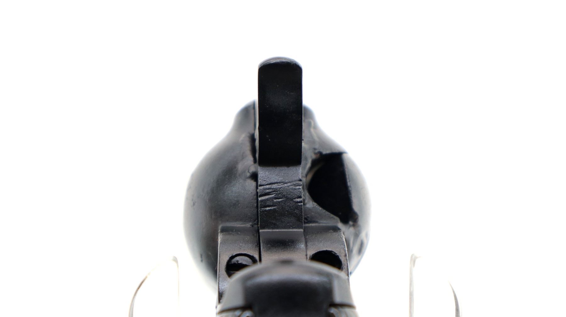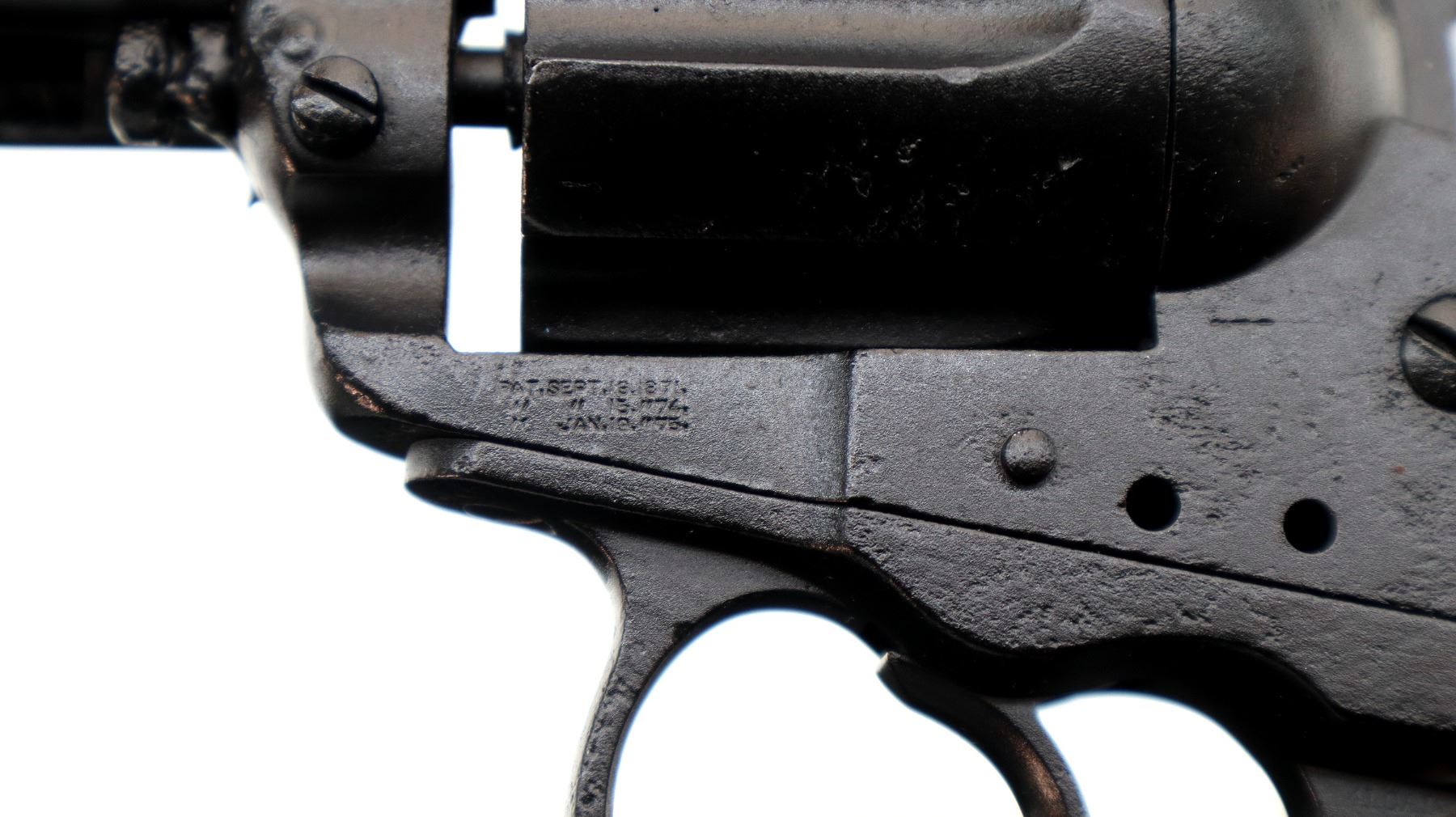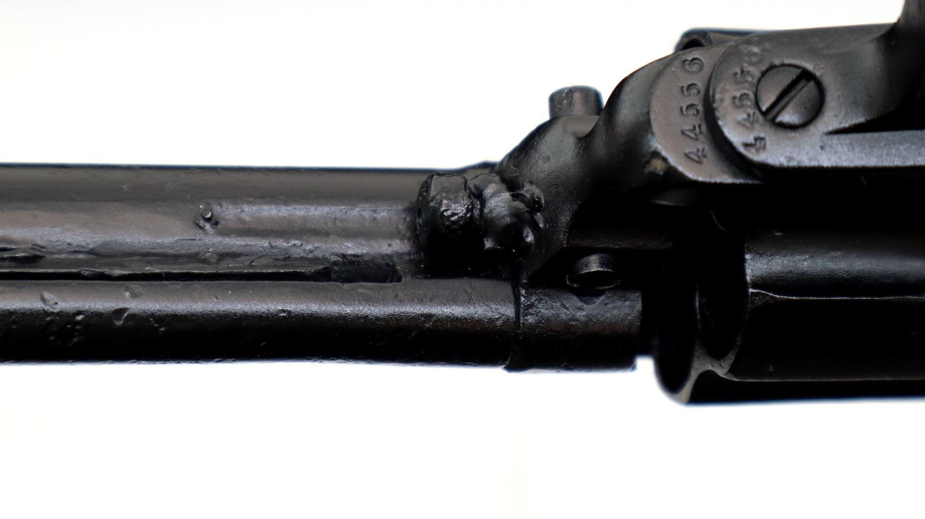 Main Description: This deactivation has six visible welds, action does not function, cannot be disassembled. Blade front sight, fixed u notched rear sight, metal painted black with pitting underneath, checkered spur hammer and smooth trigger, frame missing some parts. Two piece checkered brown polymer grips with Colt logo, ejector rod under barrel.
