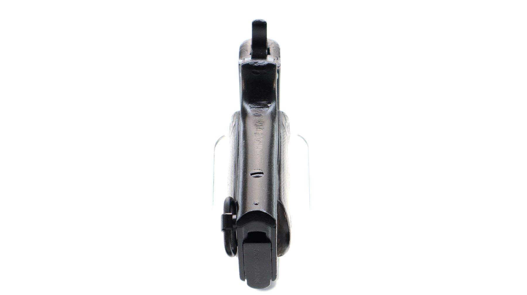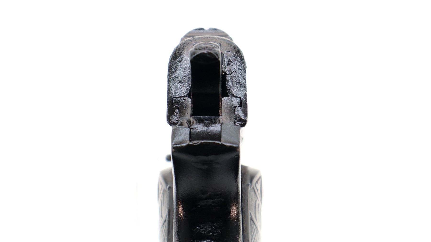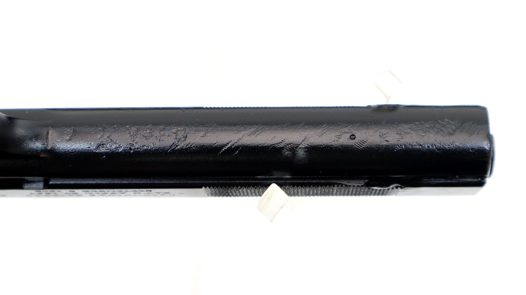 Main Description: This deactivation has six visible welds, action does not function, magazine is not removable. Blade front sight, u notched rear sight, metal painted black with pitting underneath, checkered spur hammer and smooth trigger, lanyard ring. Two piece checkered black polymer grips with Colt logos