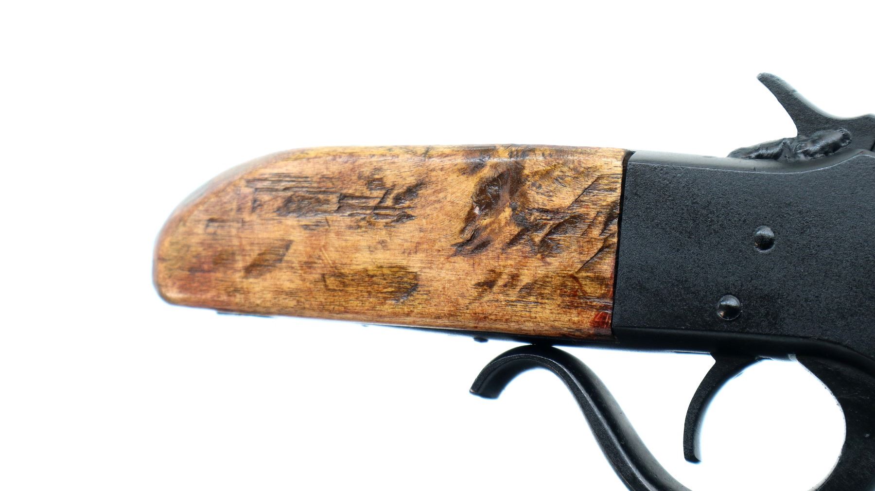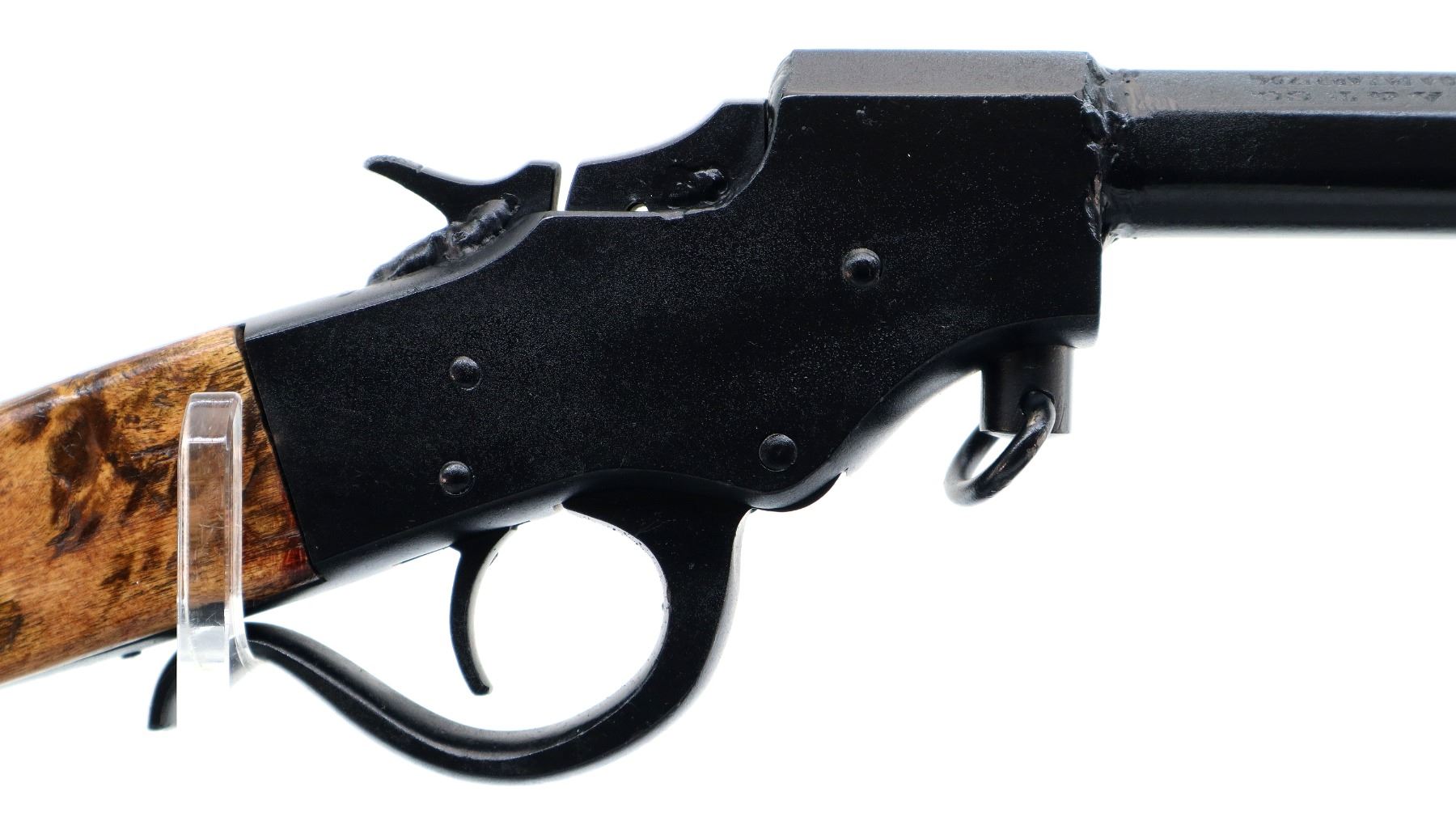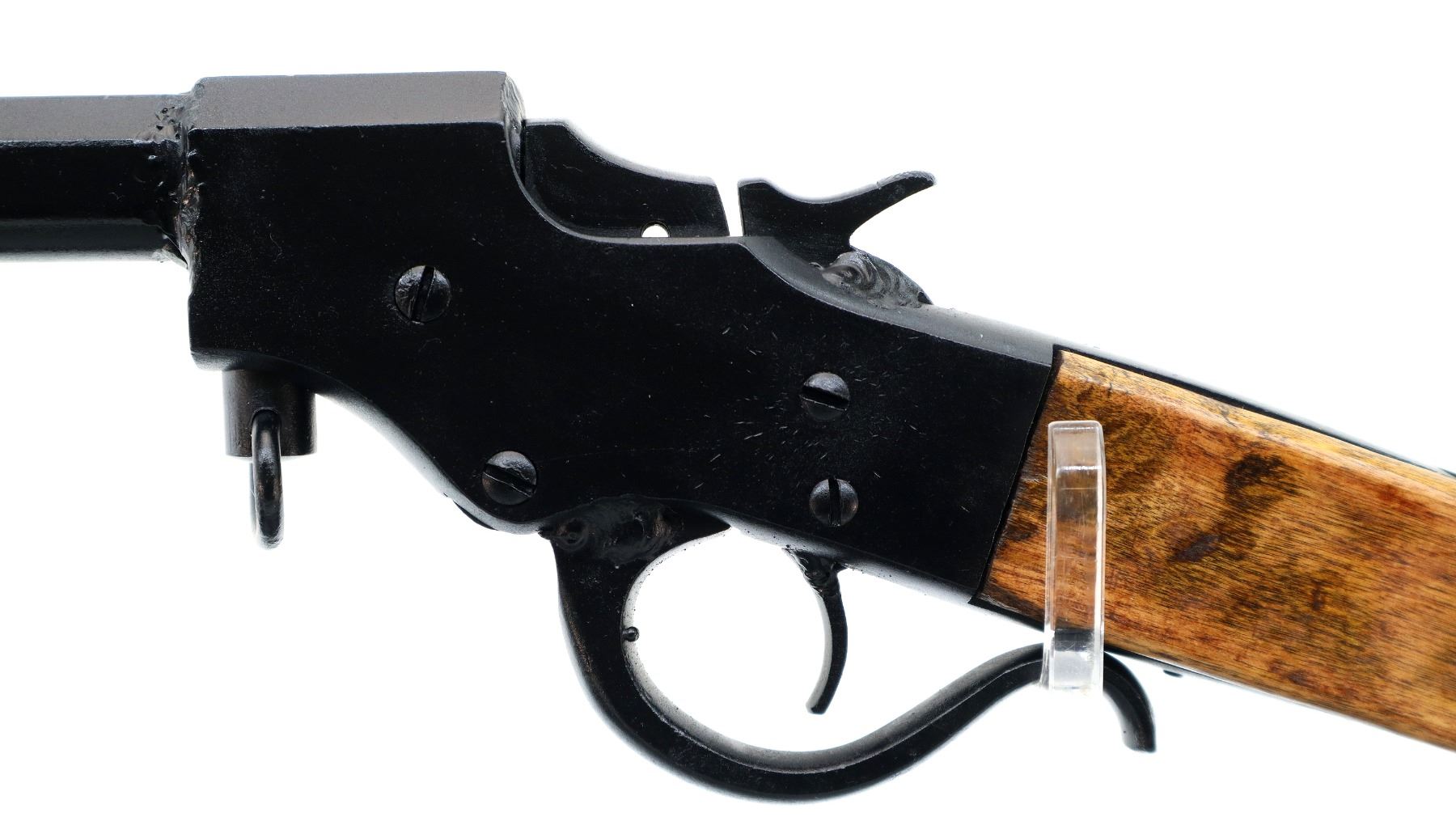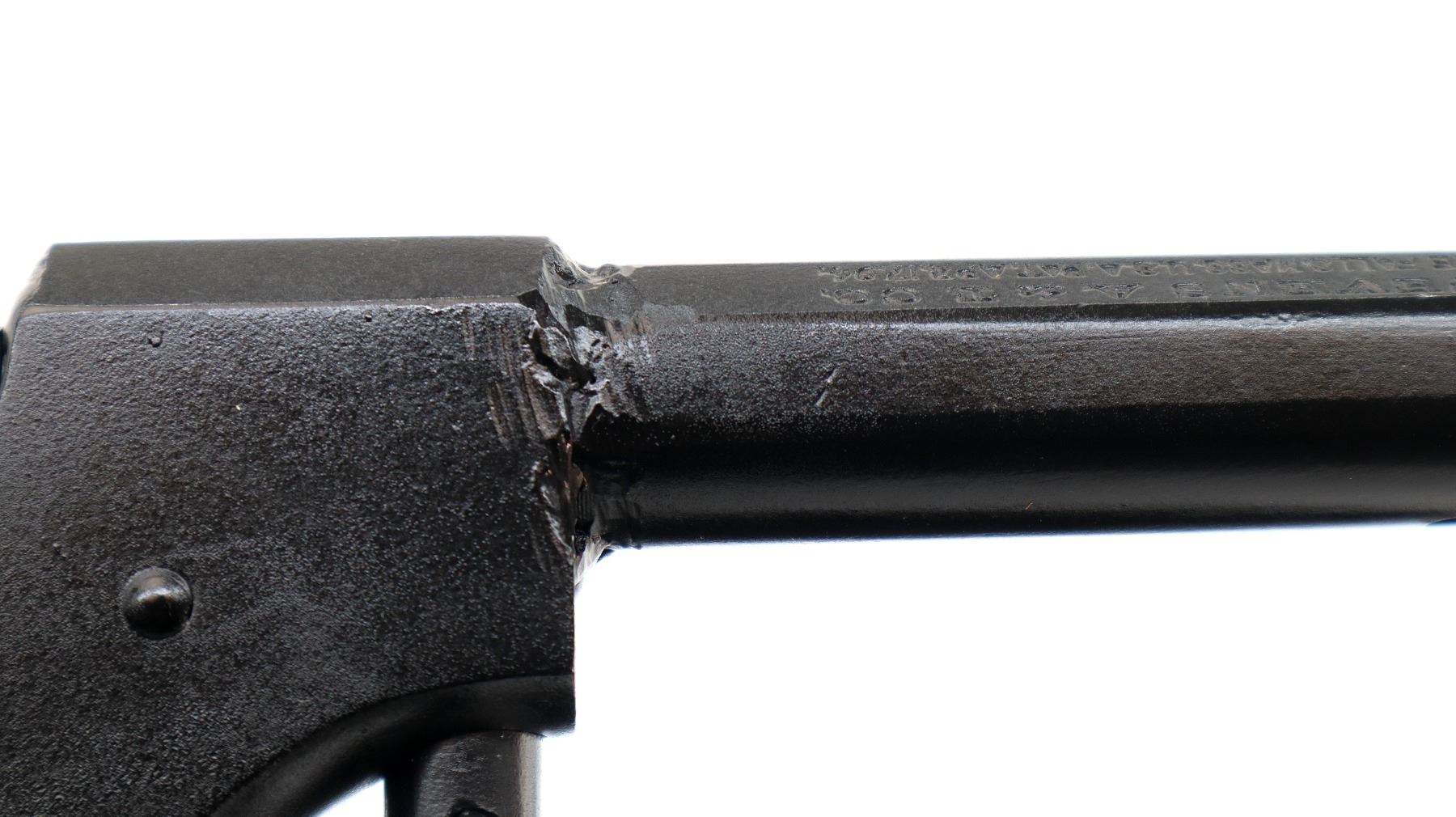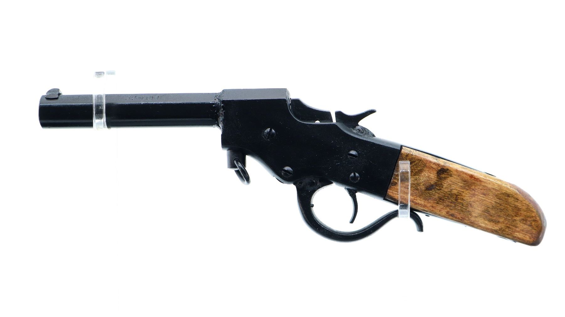 Main Description: This deactivation has six visible welds, action does not function cannot be disassembled. Broken blade front sight, black painted metal finish, octagon barrel, checkered spur hammer and smooth trigger, One piece custom smooth wood grip, takedown ring.