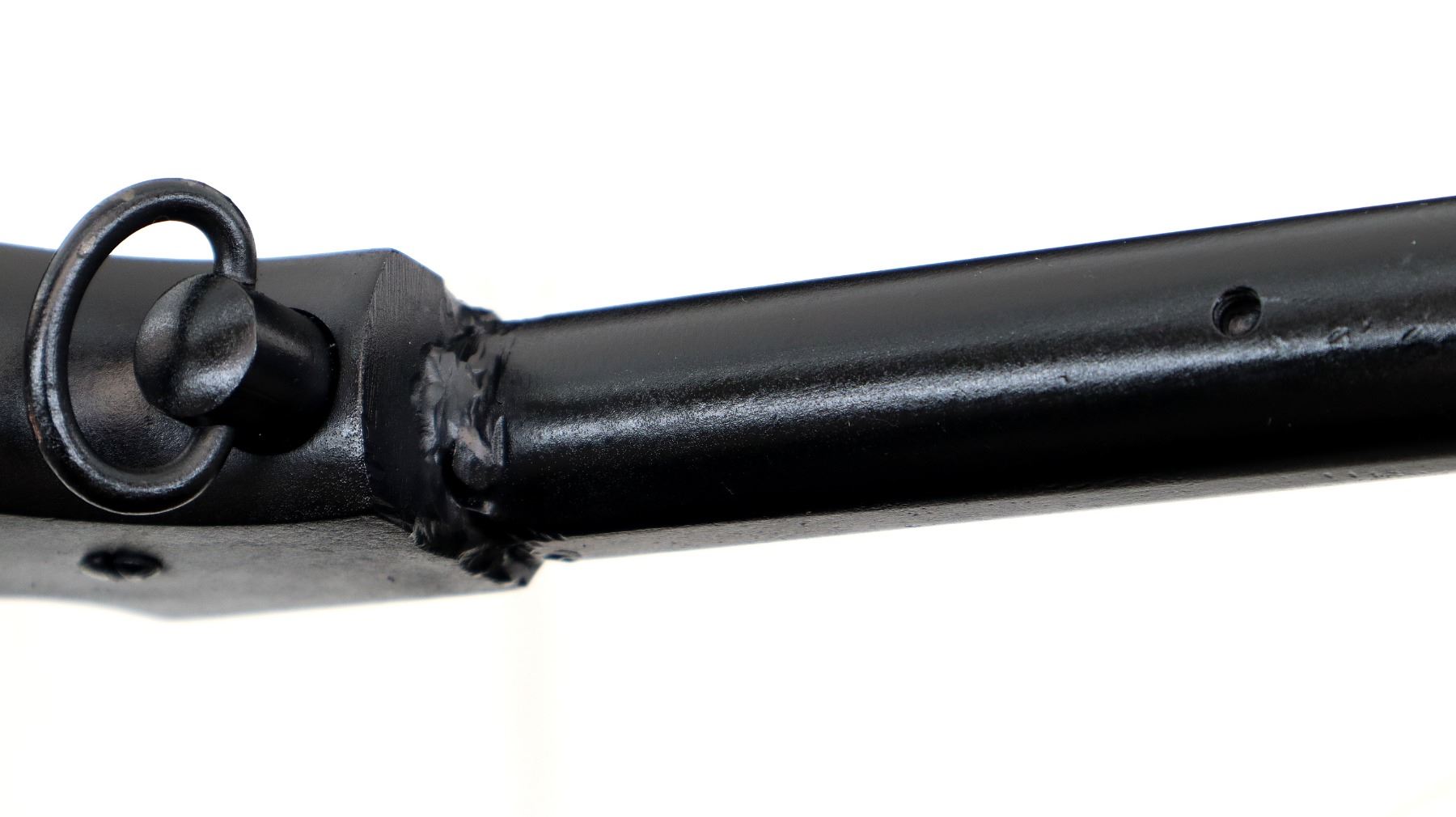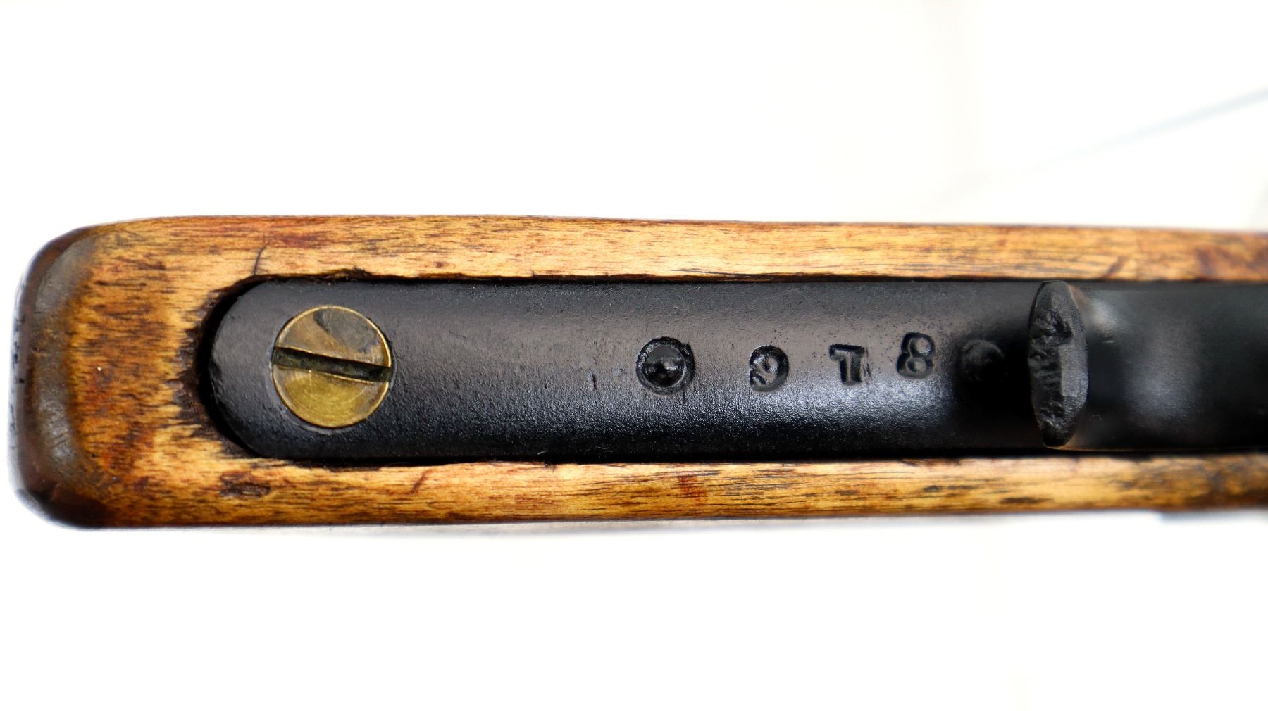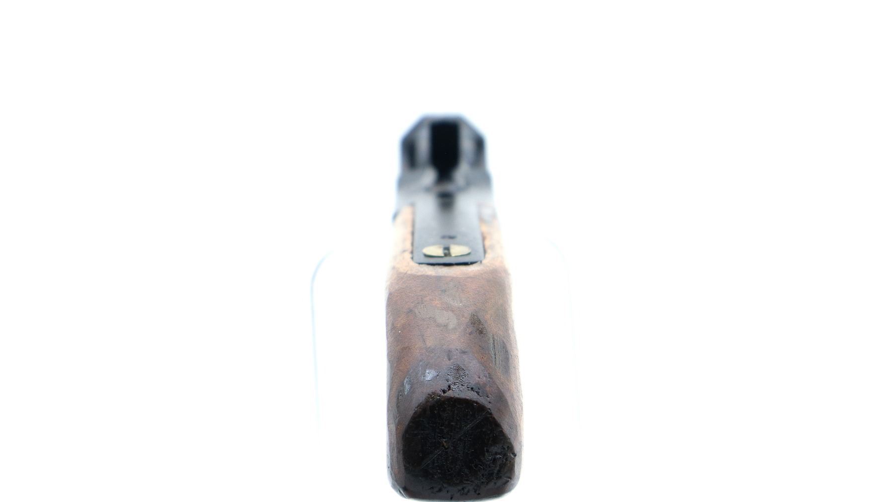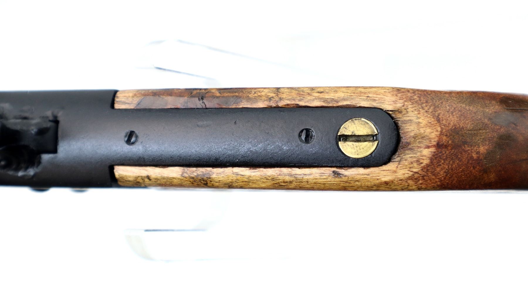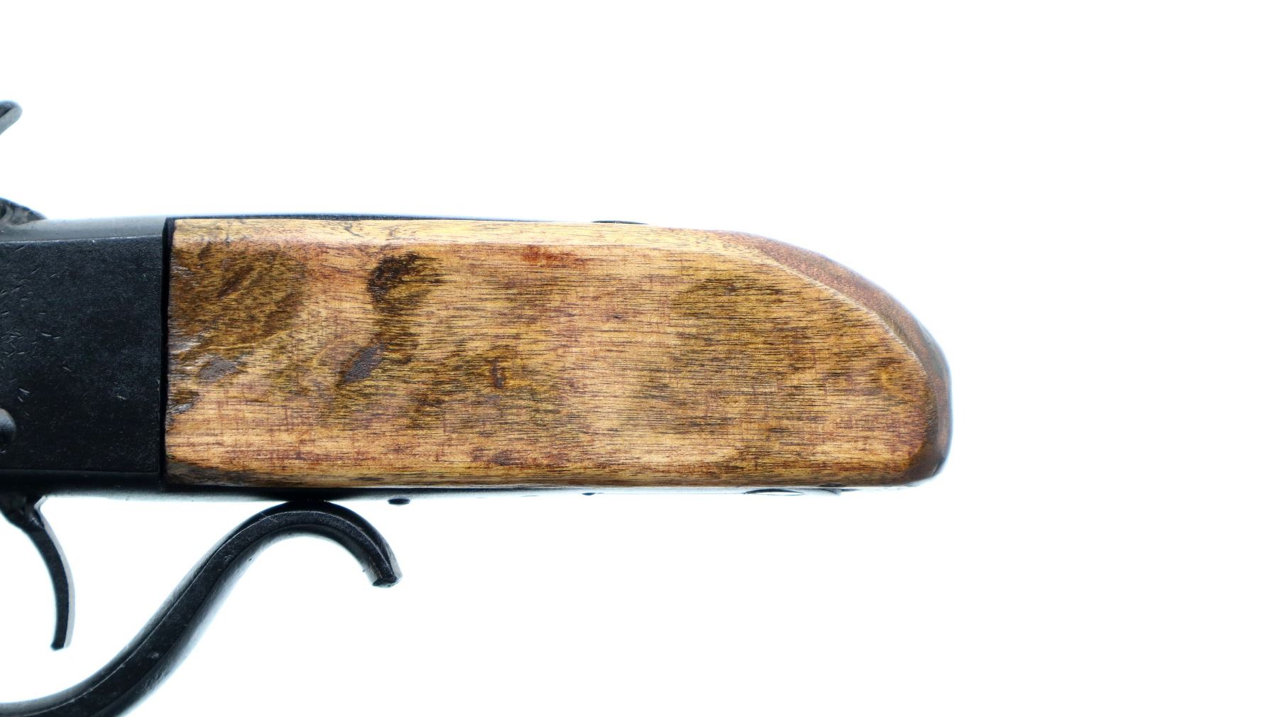 Main Description: This deactivation has six visible welds, action does not function cannot be disassembled. Broken blade front sight, black painted metal finish, octagon barrel, checkered spur hammer and smooth trigger, One piece custom smooth wood grip, takedown ring.