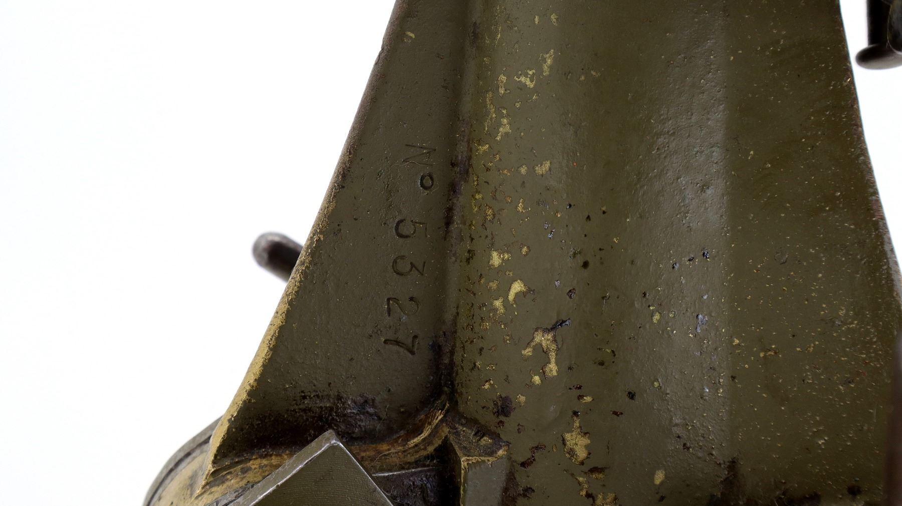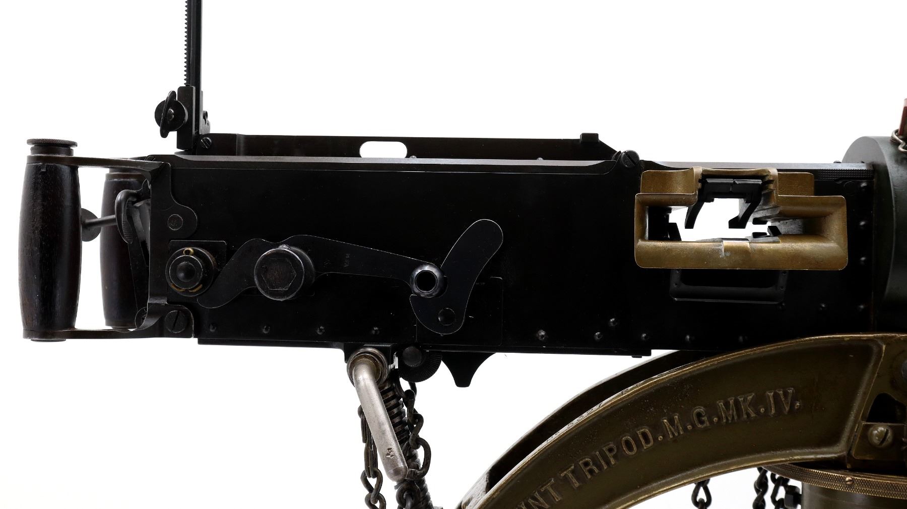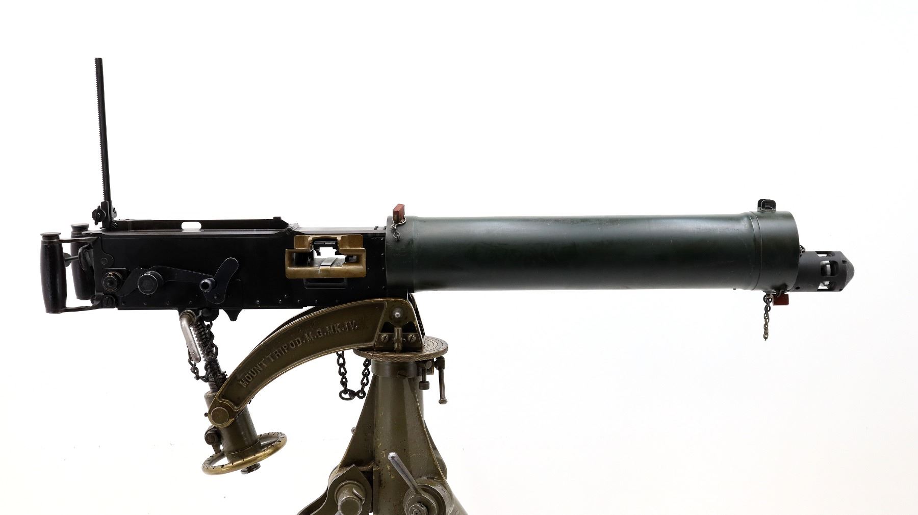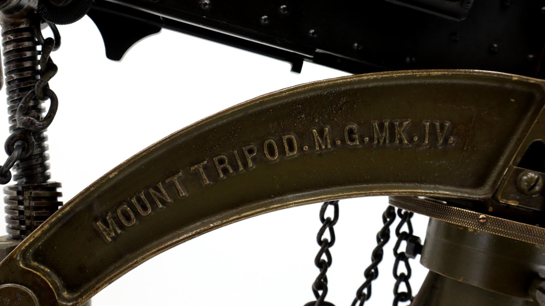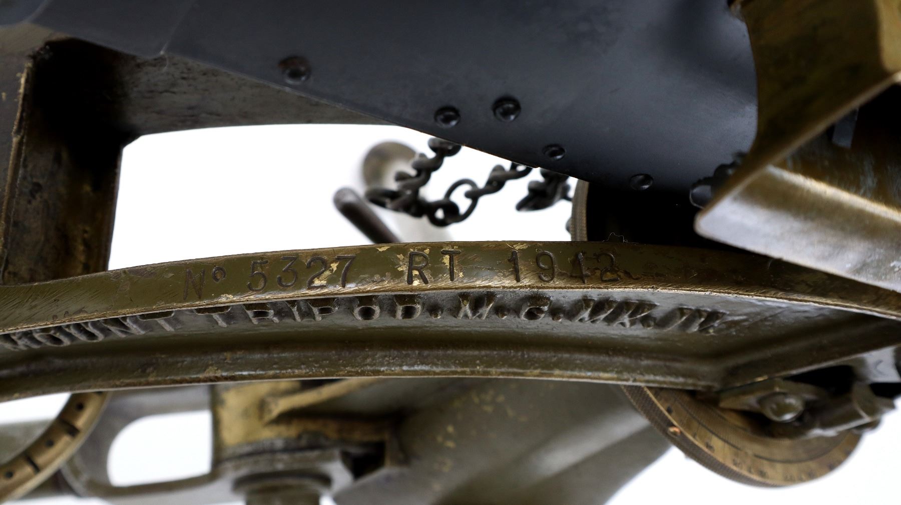 Main Description: This deactivation has 5 visible welds, action is cock and click, feed block is removable. Blade front sight with ears, adjustable folding 2900 yrd rear peep sight, Parkerized metal finish, green painted round barrel jacket, armoured nose comb, brass feed block. Two piece wood spade grips, right side cocking handle, includes water jacket plugs with chains, various markings including Broad Arrows, MA42 Etc. Mount Tripod MG MKIV, serial number 4327, dated 1942, has green painted metal finish, steel and brass construction with mounting pins and chains, elevation hand wheel functions, folding legs with clamps, brass dial, various broad arrows and other markings (shows scratches, handling marks and wear '7/10). Vickers MG Belt is available in Military Session Lot# 28190