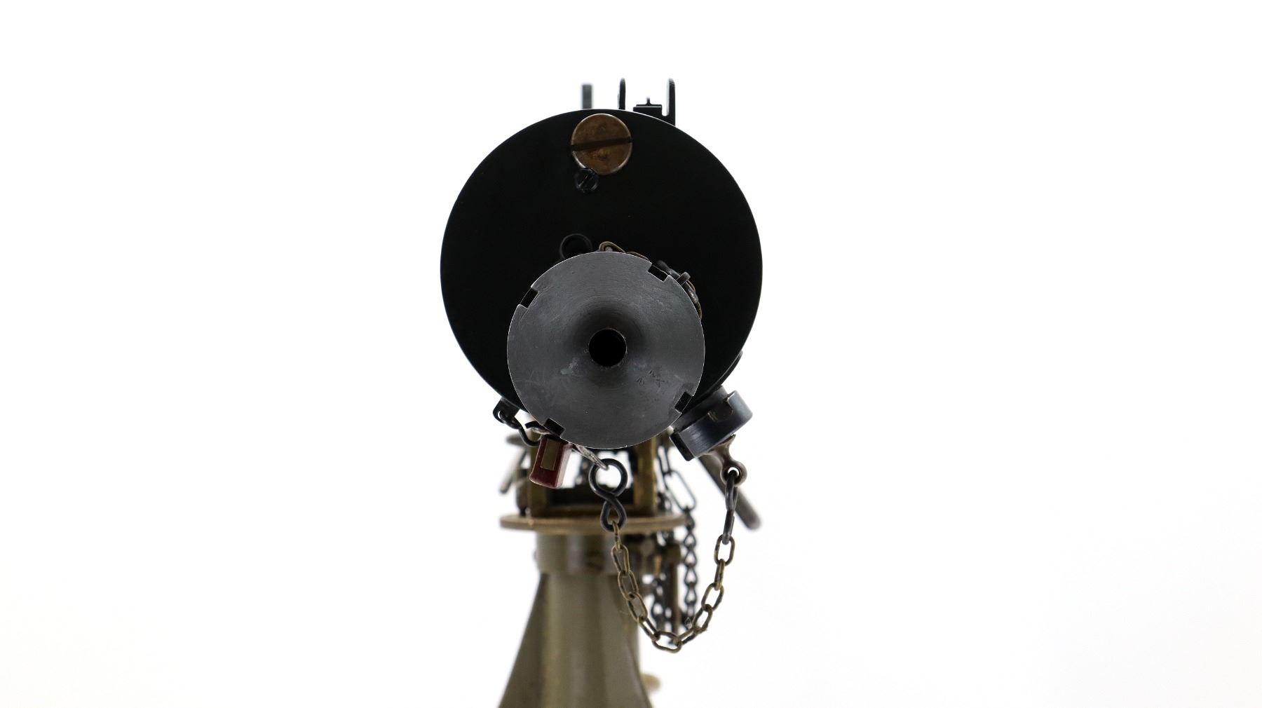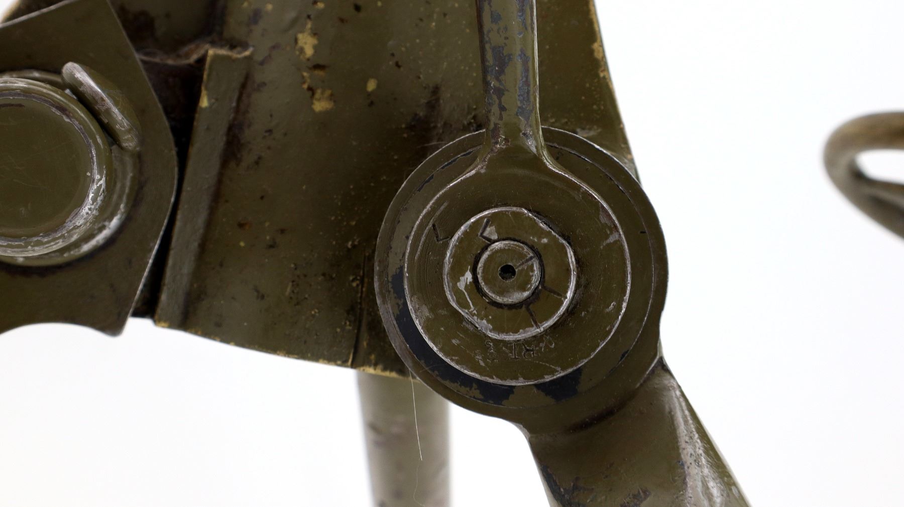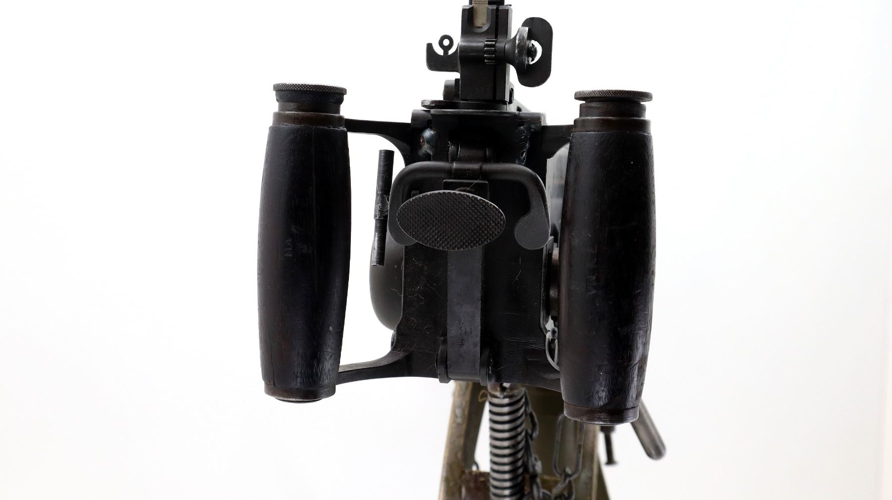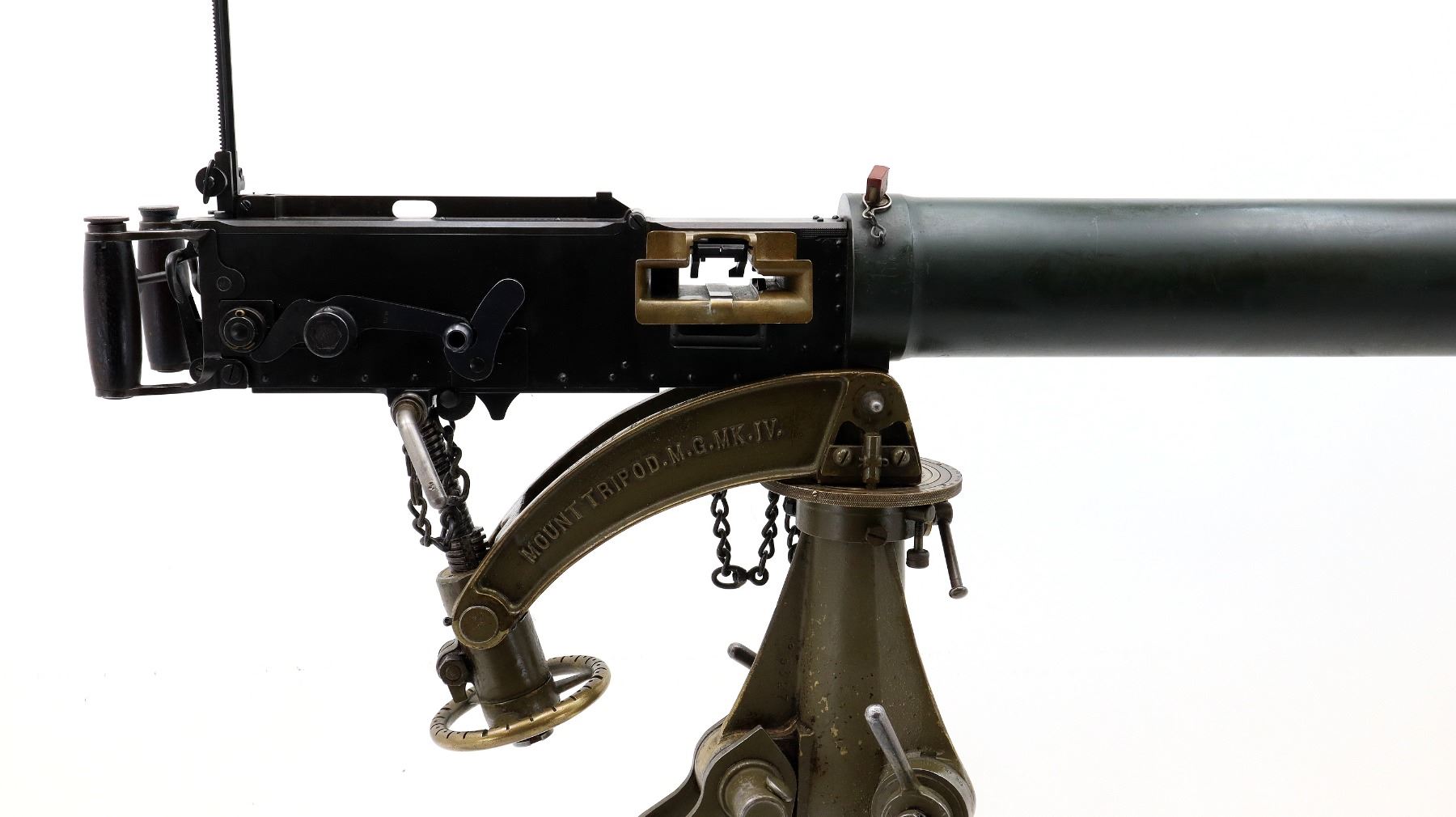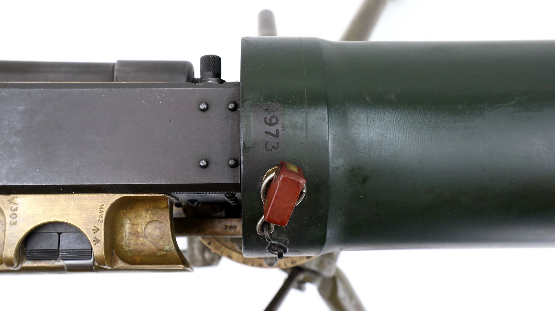 Main Description: This deactivation has 5 visible welds, action is cock and click, feed block is removable. Blade front sight with ears, adjustable folding 2900 yrd rear peep sight, Parkerized metal finish, green painted round barrel jacket, armoured nose comb, brass feed block. Two piece wood spade grips, right side cocking handle, includes water jacket plugs with chains, various markings including Broad Arrows, MA42 Etc. Mount Tripod MG MKIV, serial number 4327, dated 1942, has green painted metal finish, steel and brass construction with mounting pins and chains, elevation hand wheel functions, folding legs with clamps, brass dial, various broad arrows and other markings (shows scratches, handling marks and wear '7/10). Vickers MG Belt is available in Military Session Lot# 28190