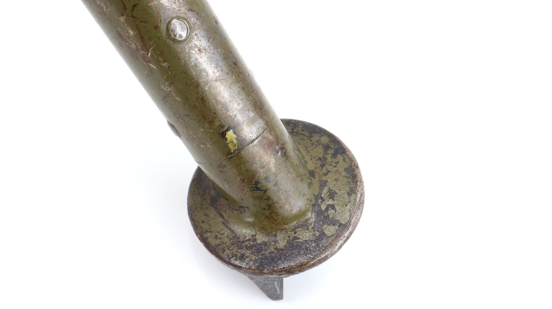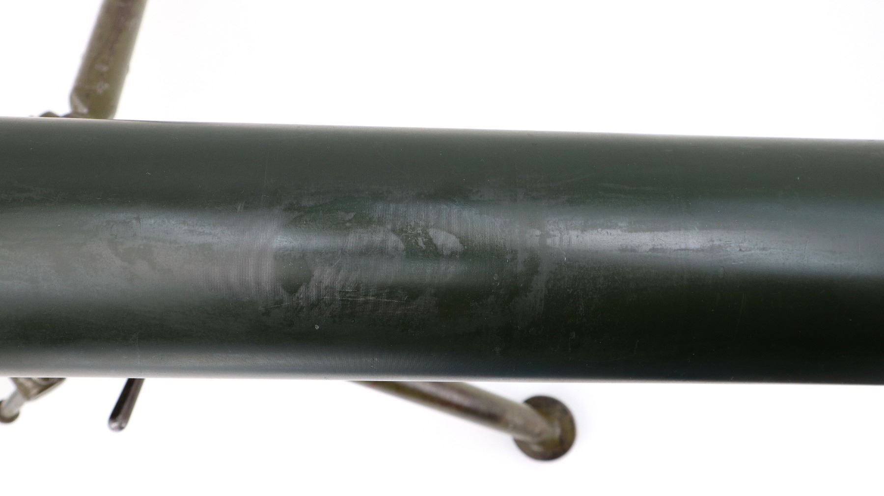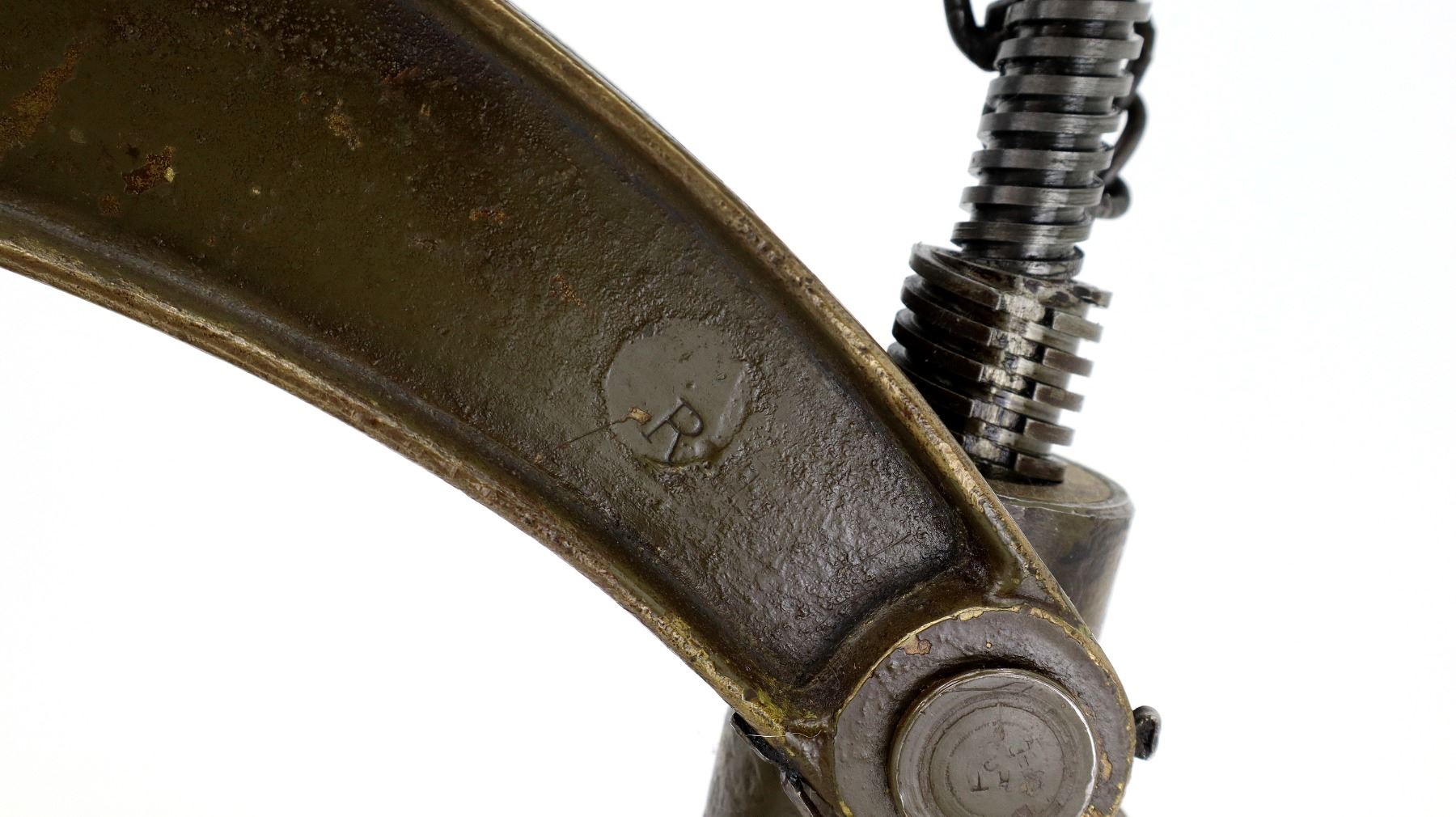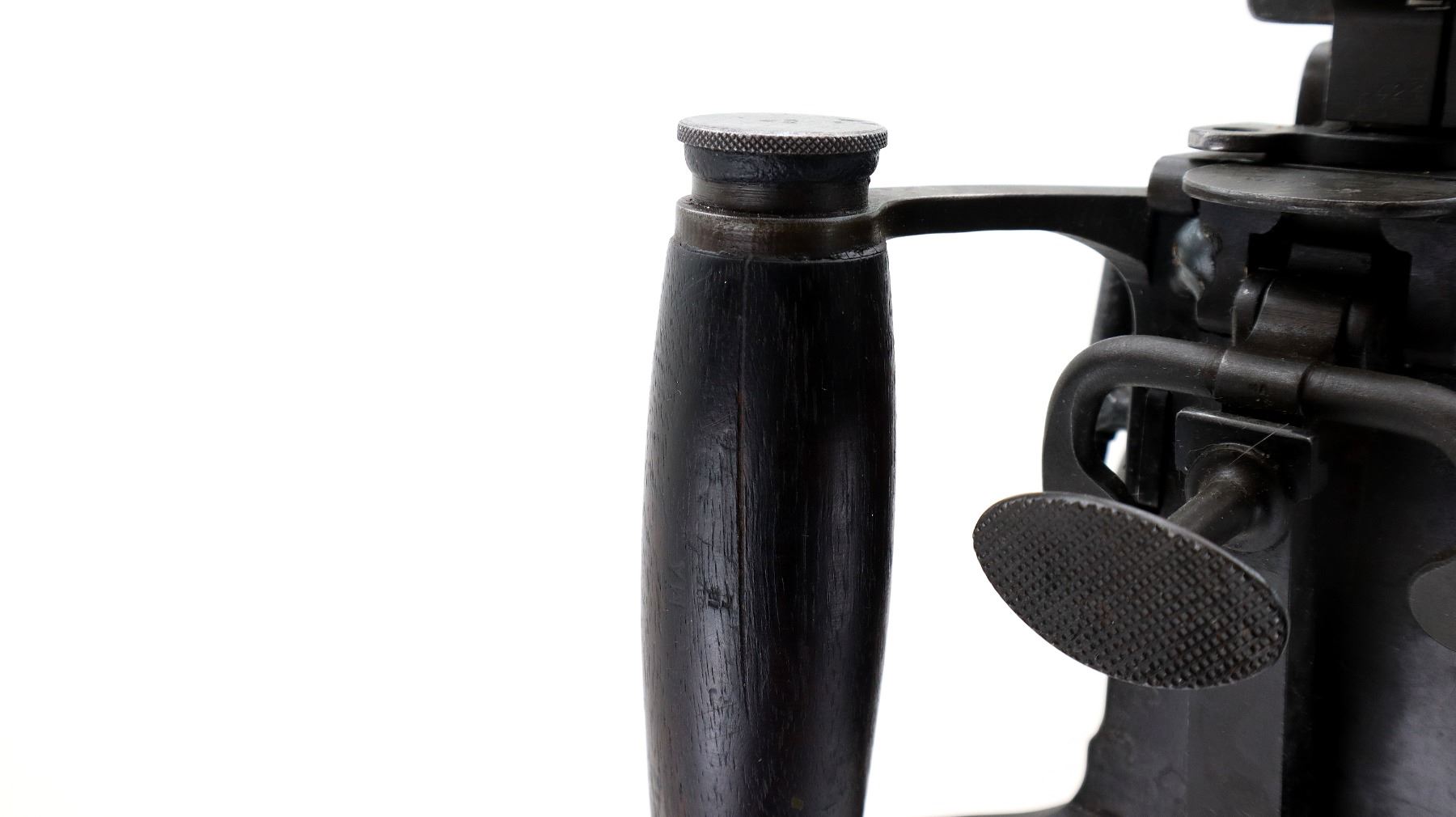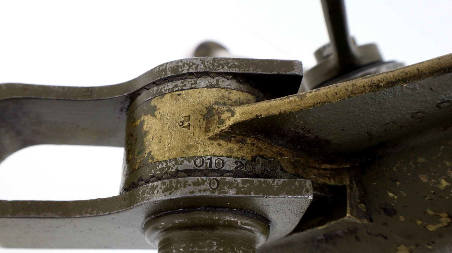Main Description: This deactivation has 5 visible welds, action is cock and click, feed block is removable. Blade front sight with ears, adjustable folding 2900 yrd rear peep sight, Parkerized metal finish, green painted round barrel jacket, armoured nose comb, brass feed block. Two piece wood spade grips, right side cocking handle, includes water jacket plugs with chains, various markings including Broad Arrows, MA42 Etc. Mount Tripod MG MKIV, serial number 4327, dated 1942, has green painted metal finish, steel and brass construction with mounting pins and chains, elevation hand wheel functions, folding legs with clamps, brass dial, various broad arrows and other markings (shows scratches, handling marks and wear '7/10). Vickers MG Belt is available in Military Session Lot# 28190