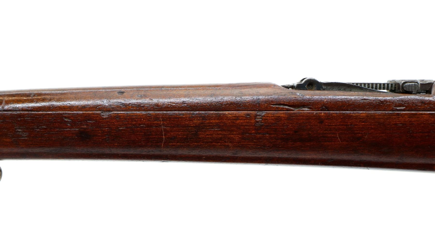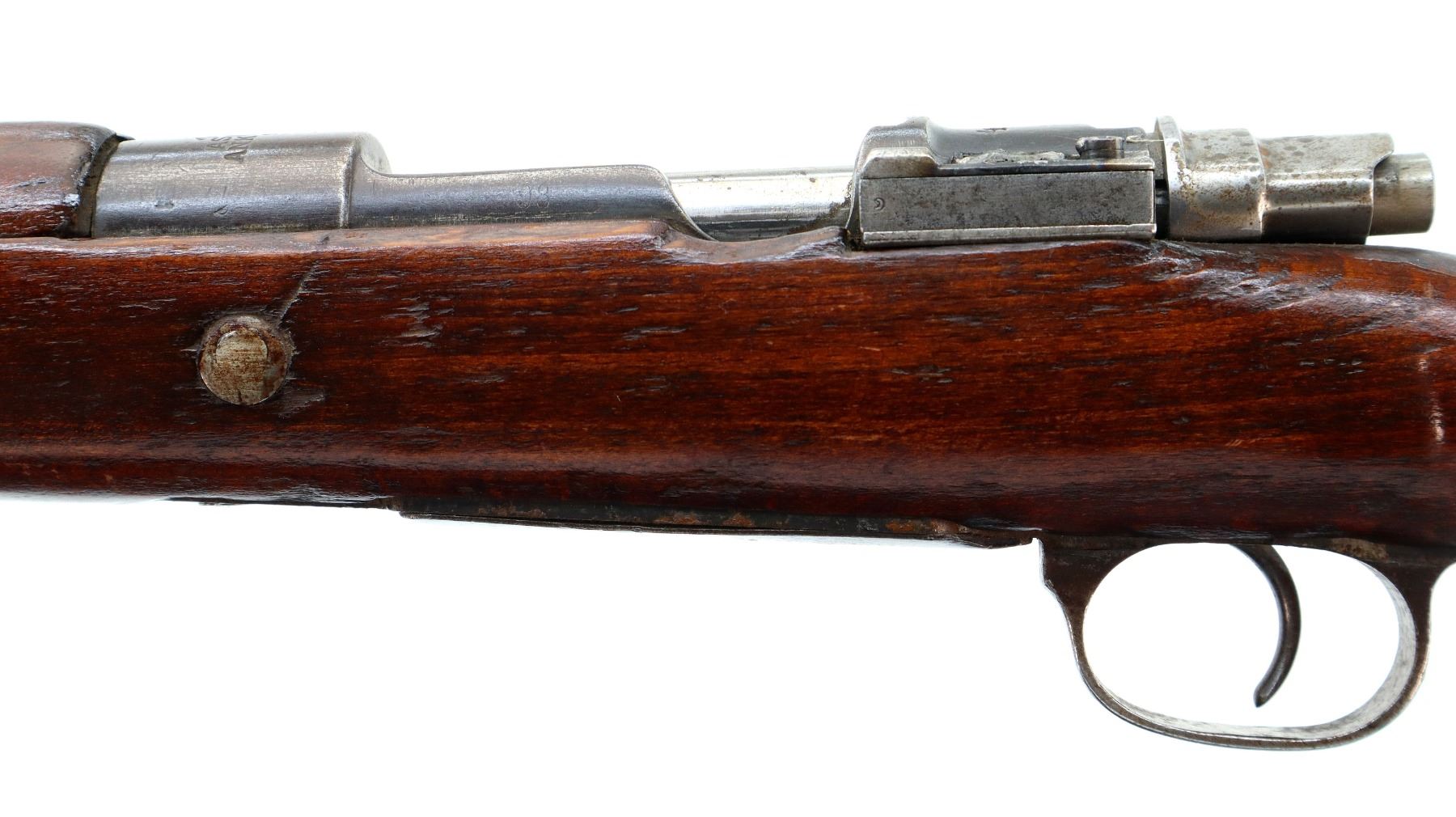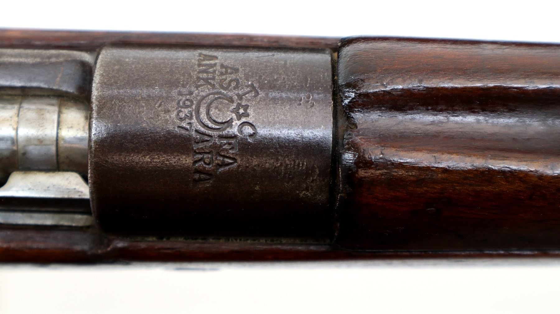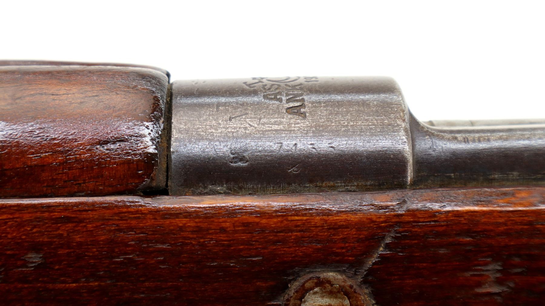 Main Description: This deactivation has pins and a slot cut through the chamber and receiver, bolt face modified, one visible weld on bolt stop, bolt cannot be removed. Marked TC SAFA Ankara 1937, numbers mismatched. Barley corn front sight with ramp, adjustable u notched rear sight, modified bolt handle, bolt shroud is incomplete. Two piece full military wood stocks, handguard is cracked, pistol grip, chipped and cracked behind receiver, smooth steel butt plate, steel stock disk, sling swivels, bayonet lug, missing cleaning rod.
