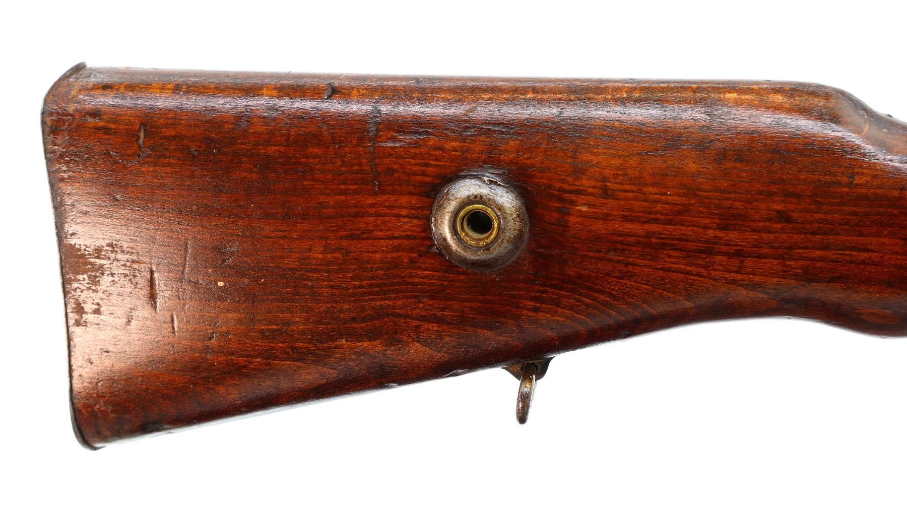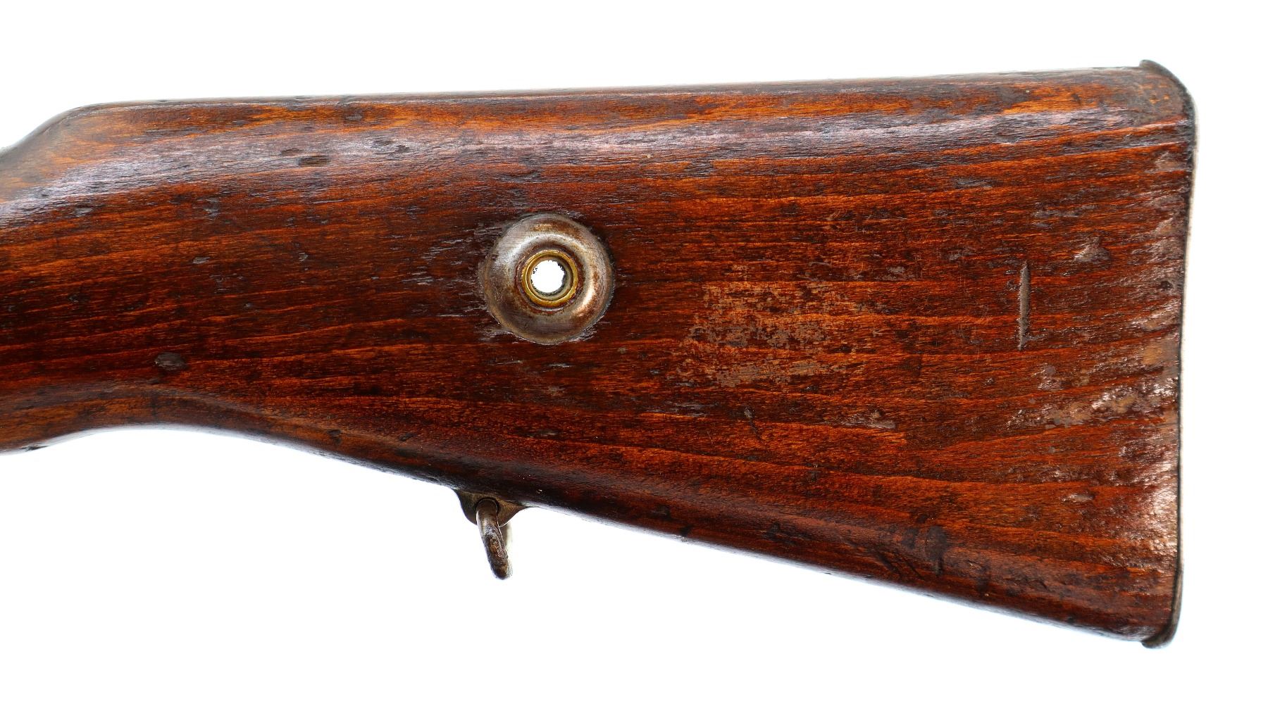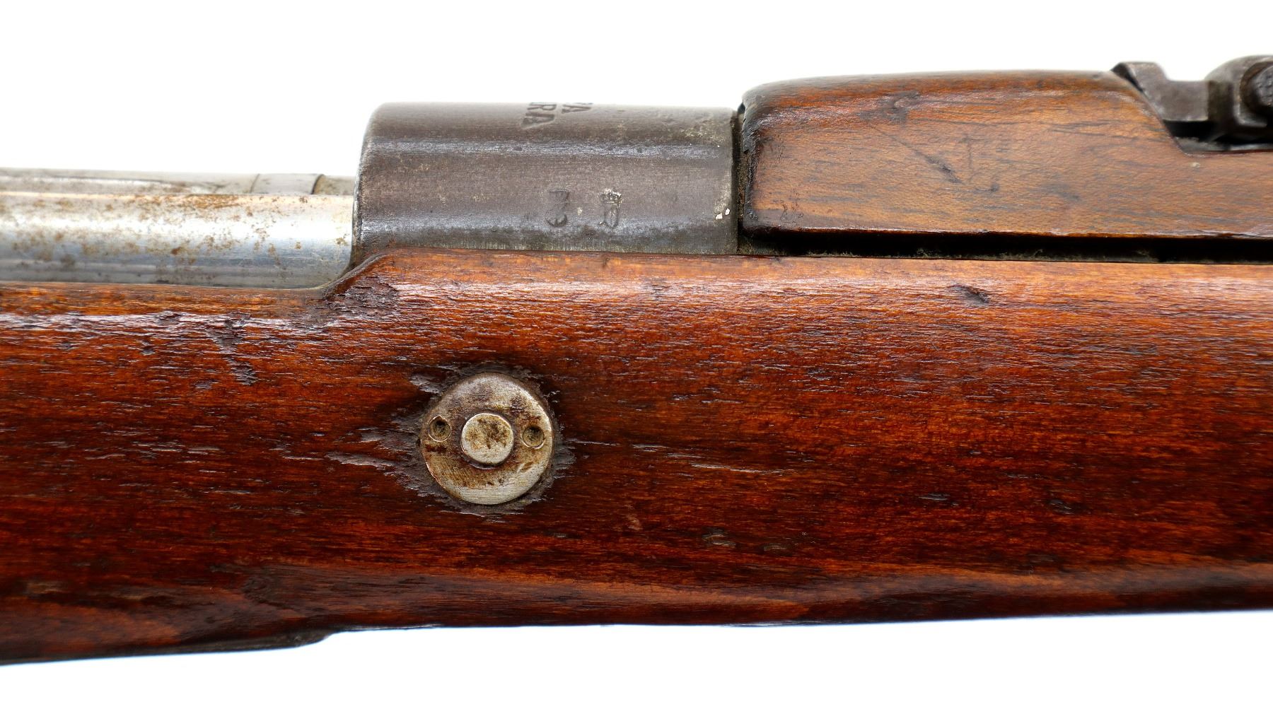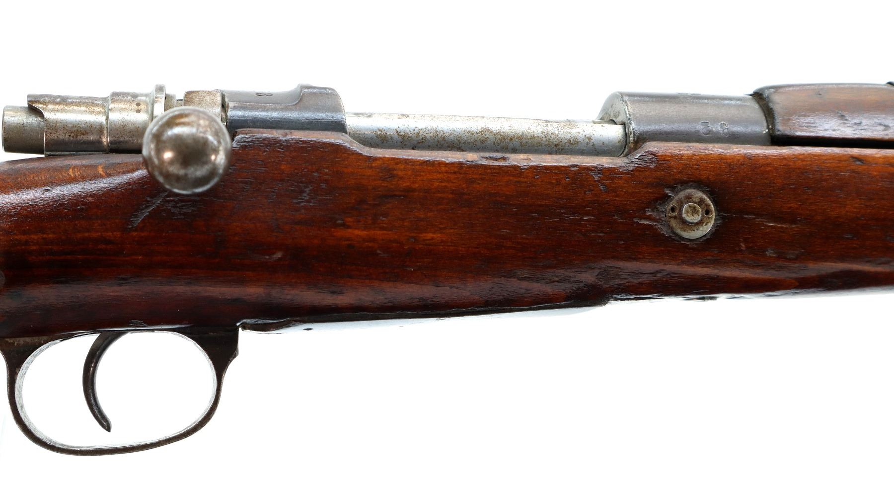 Main Description: This deactivation has pins and a slot cut through the chamber and receiver, bolt face modified, one visible weld on bolt stop, bolt cannot be removed. Marked TC SAFA Ankara 1937, numbers mismatched. Barley corn front sight with ramp, adjustable u notched rear sight, modified bolt handle, bolt shroud is incomplete. Two piece full military wood stocks, handguard is cracked, pistol grip, chipped and cracked behind receiver, smooth steel butt plate, steel stock disk, sling swivels, bayonet lug, missing cleaning rod.
