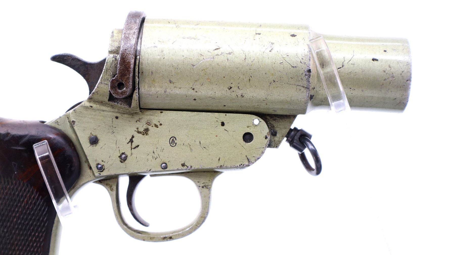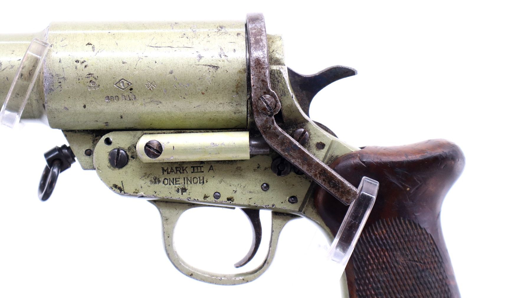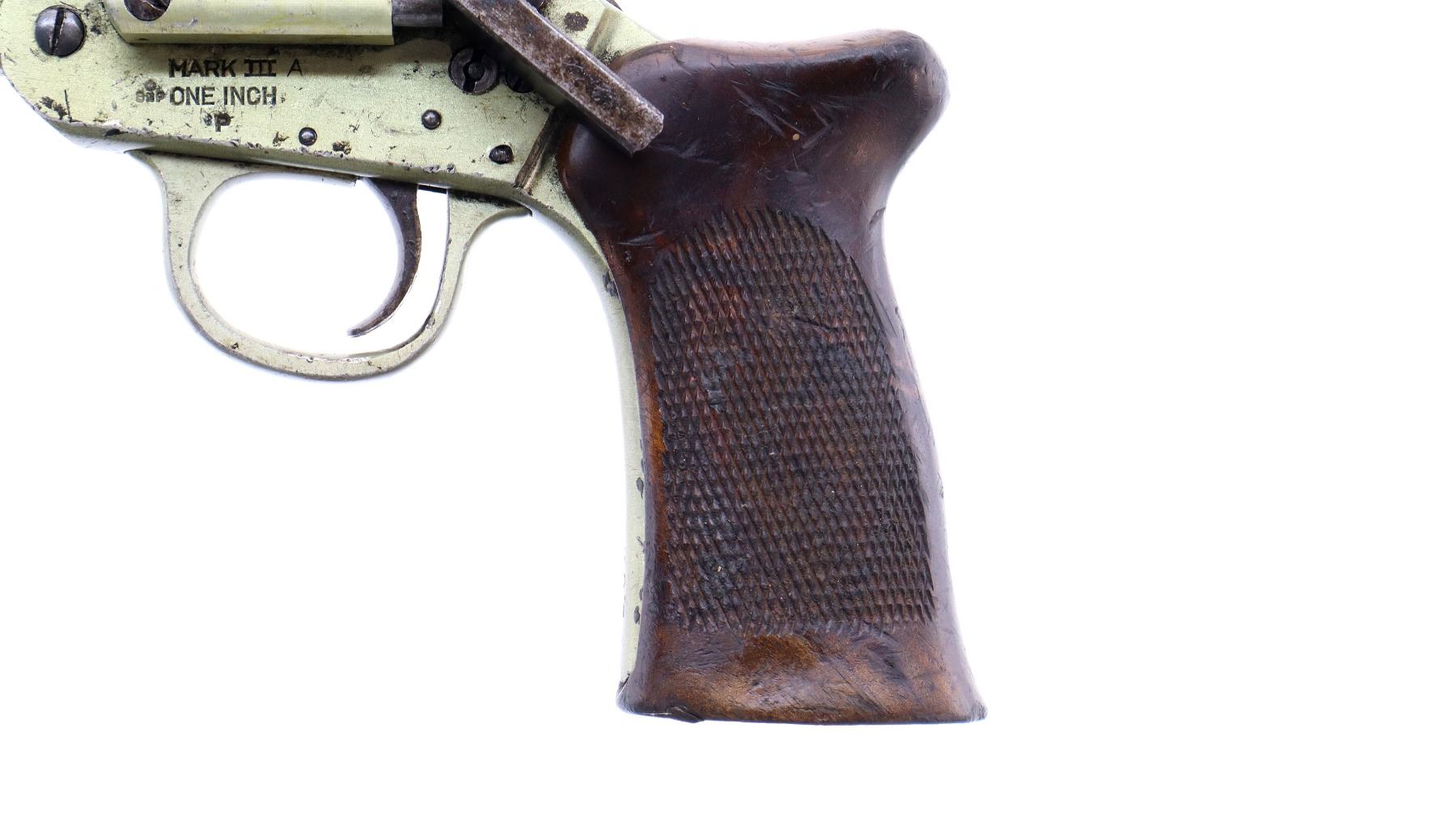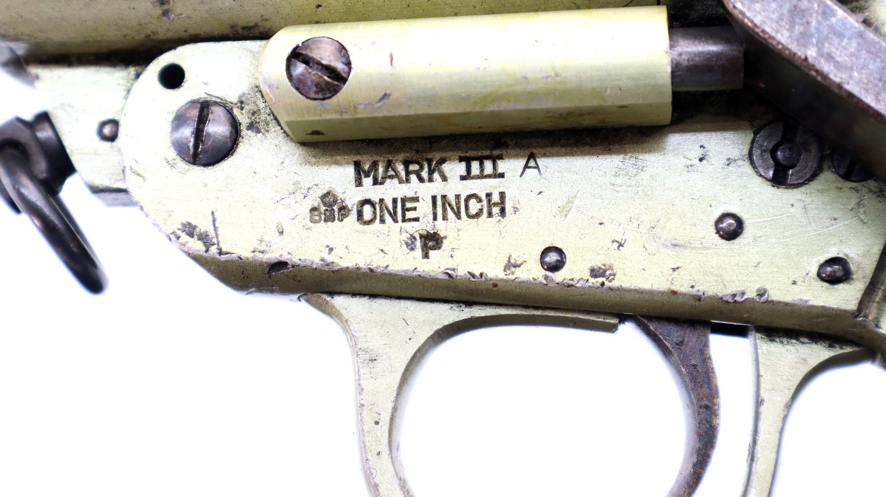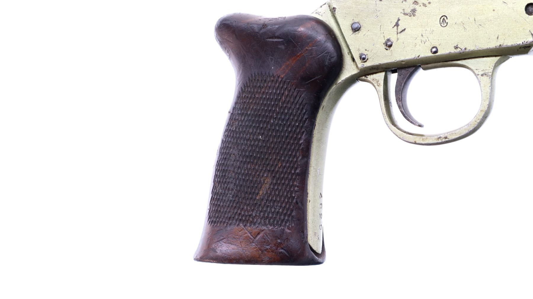 Main Description: No sights, bronze alloy finish, tapered round barrel, checkered spur hammer and opening lever that function, C-Broad arrow on right side of frame indicating Canadian Military issue, checkered one piece wood grip, lanyard ring