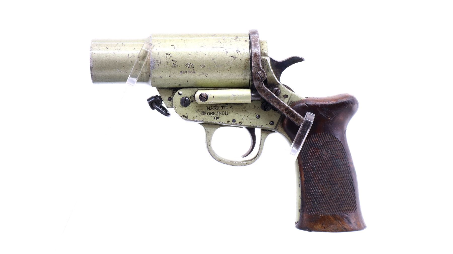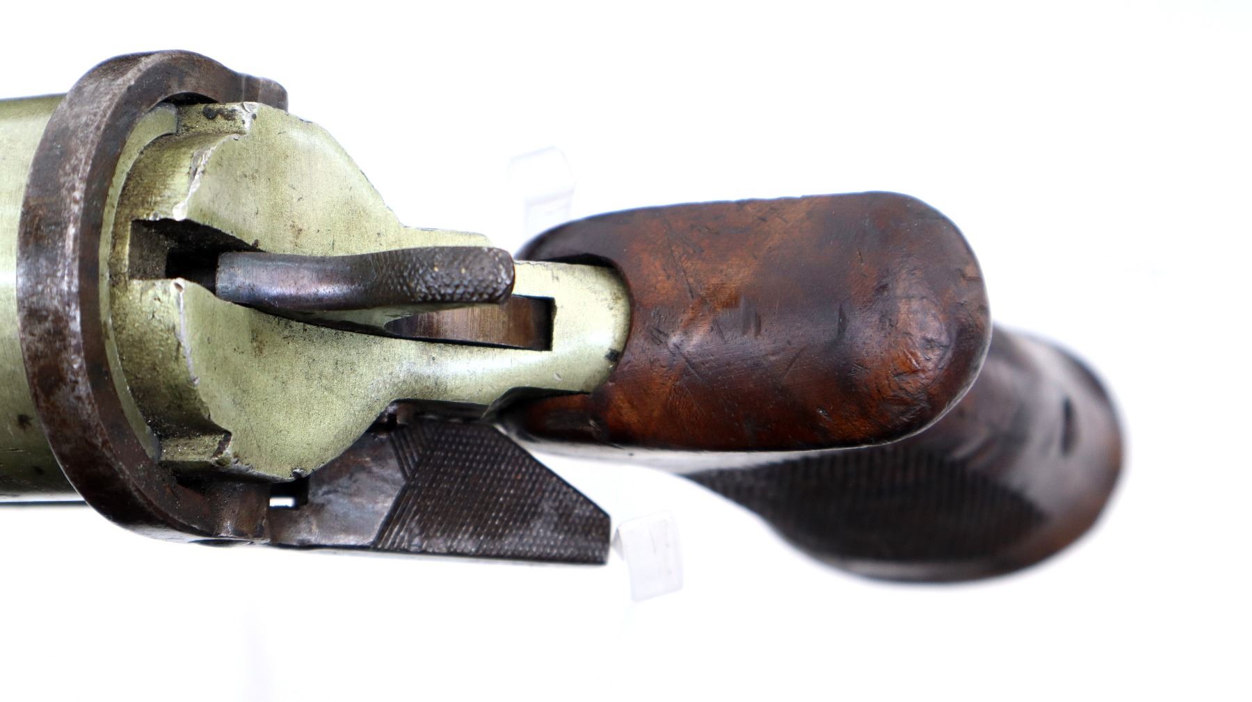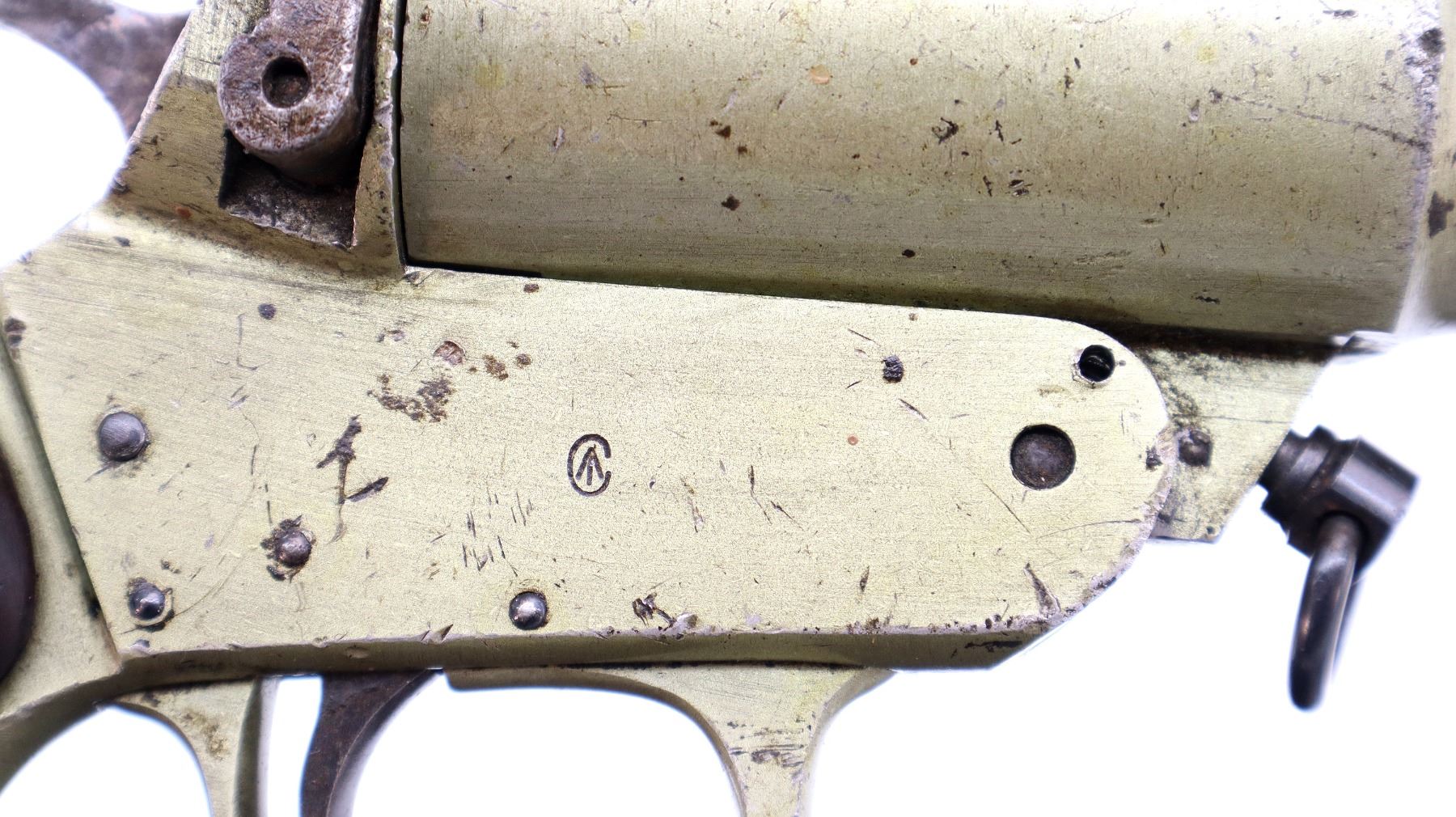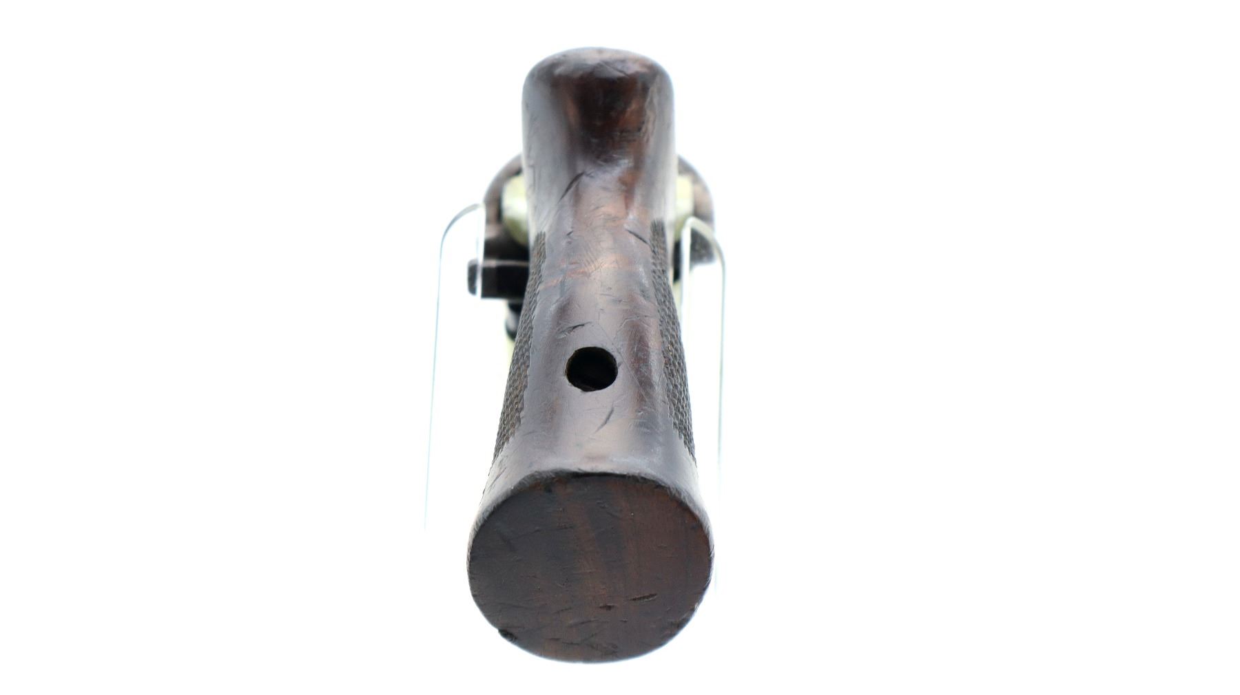 Main Description: No sights, bronze alloy finish, tapered round barrel, checkered spur hammer and opening lever that function, C-Broad arrow on right side of frame indicating Canadian Military issue, checkered one piece wood grip, lanyard ring
