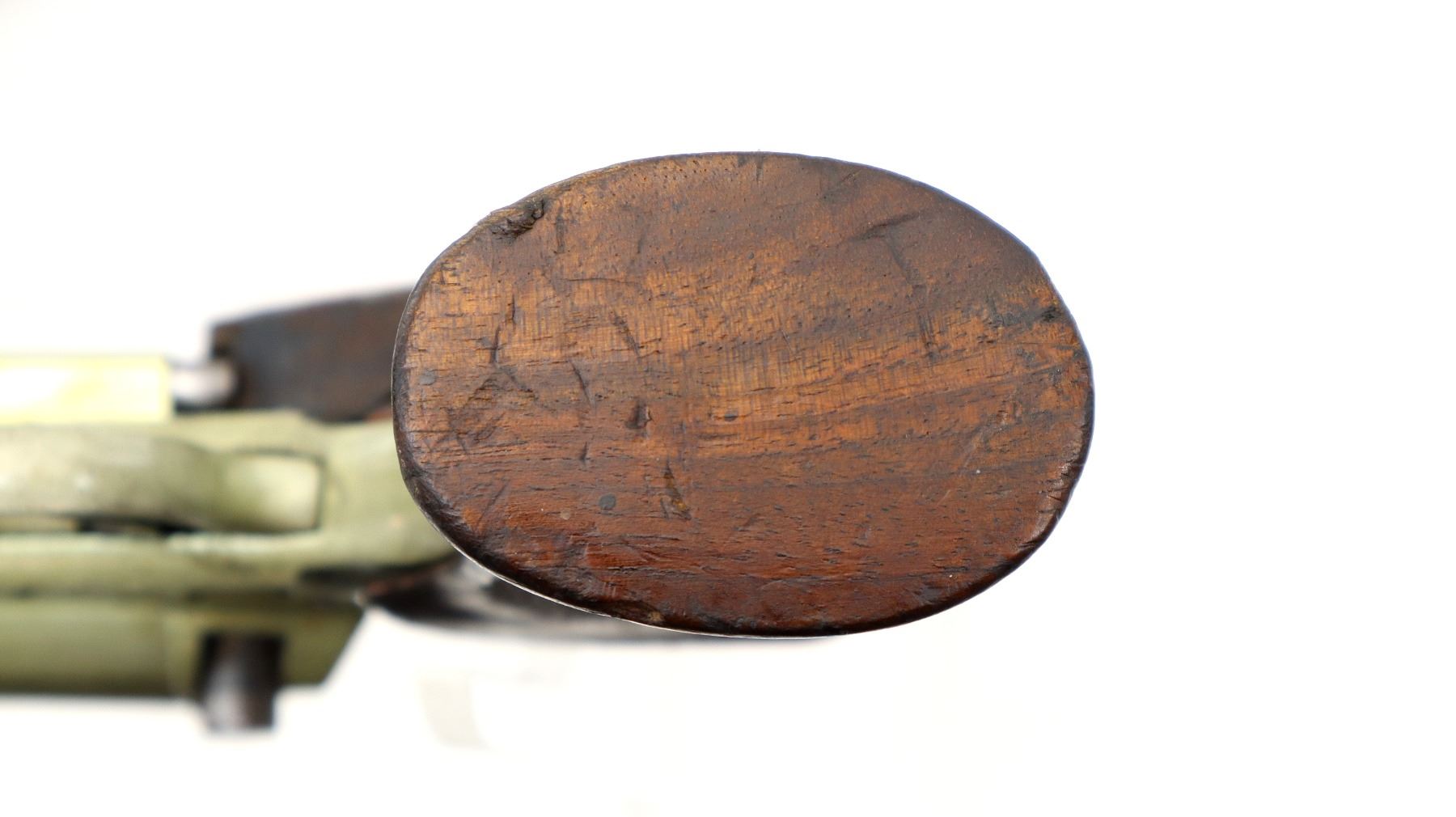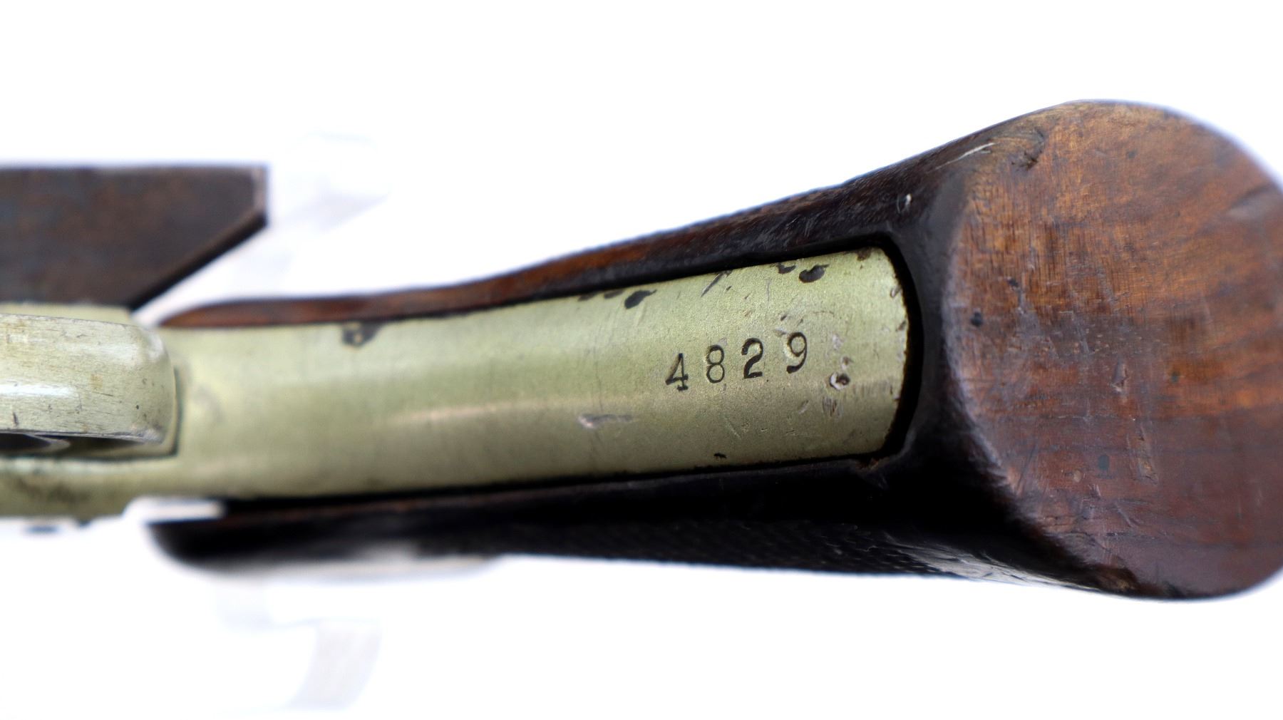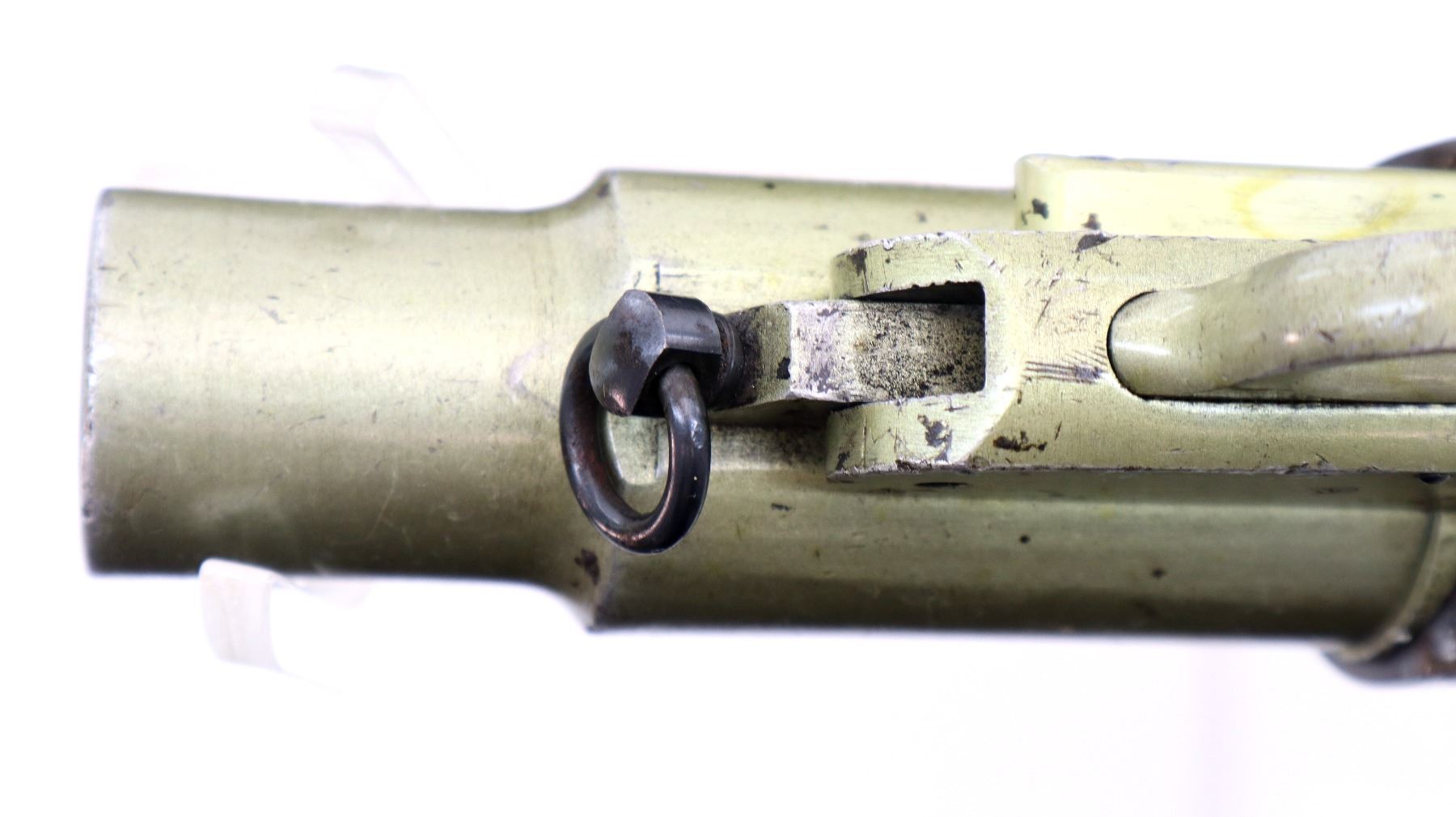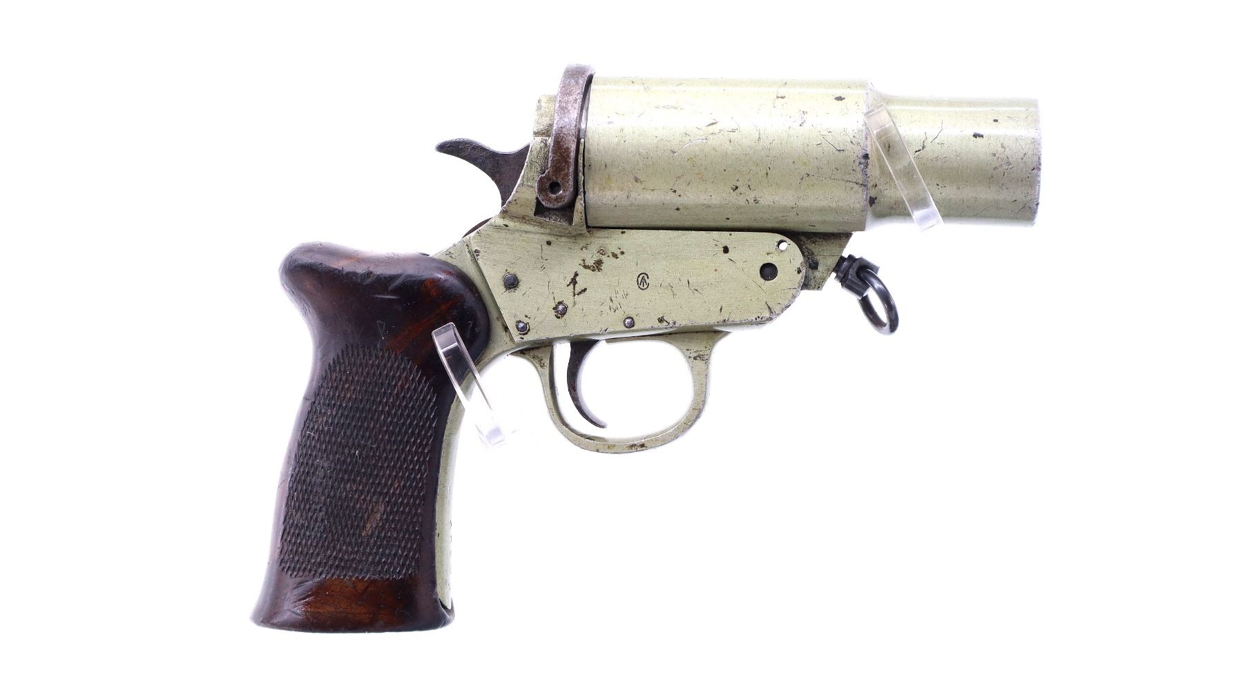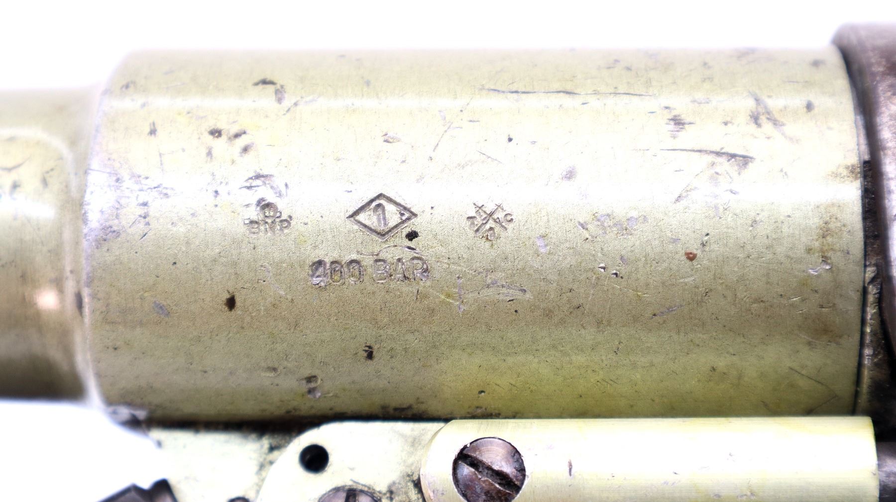 Main Description: No sights, bronze alloy finish, tapered round barrel, checkered spur hammer and opening lever that function, C-Broad arrow on right side of frame indicating Canadian Military issue, checkered one piece wood grip, lanyard ring
