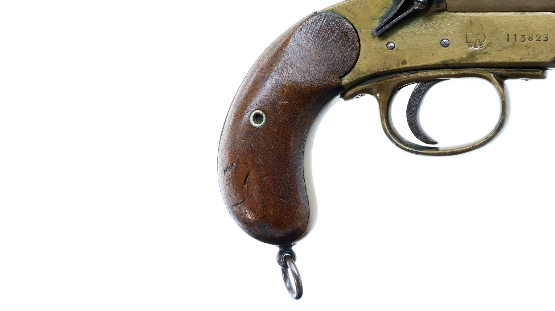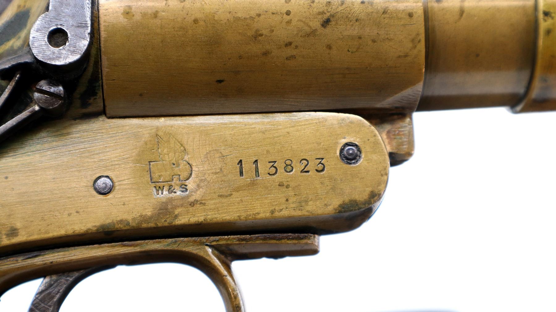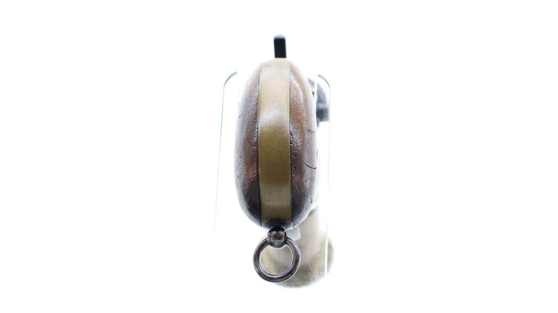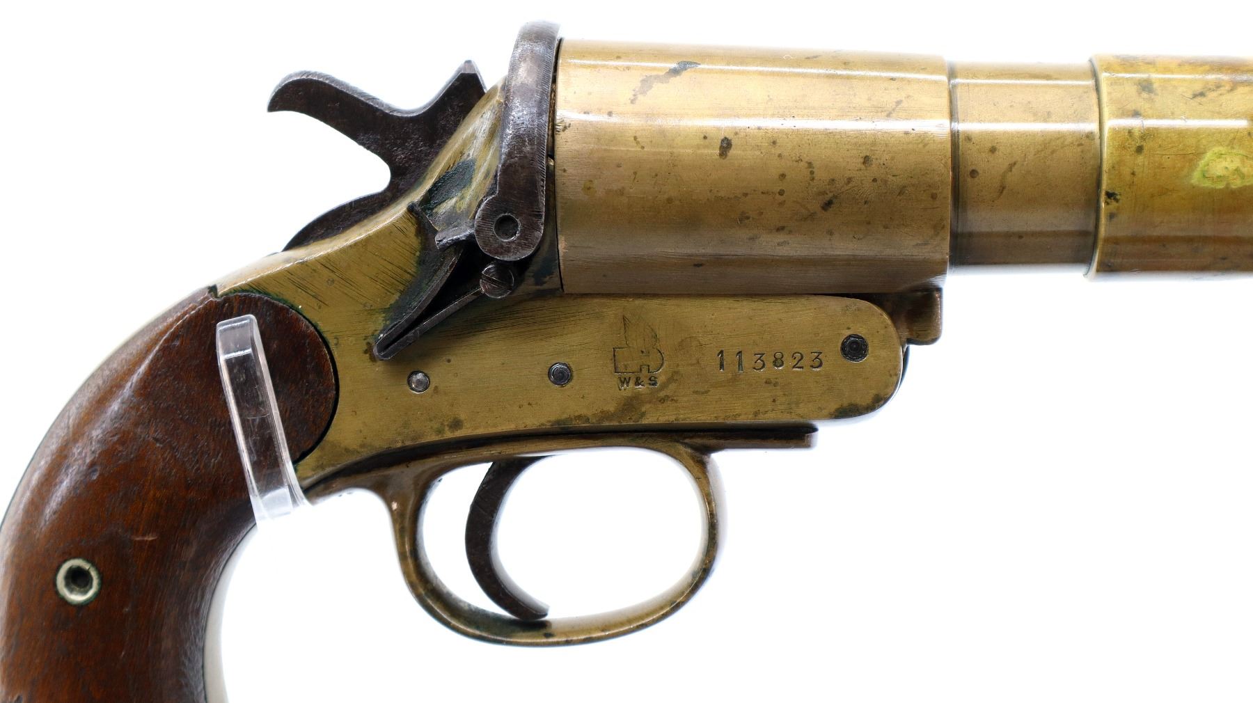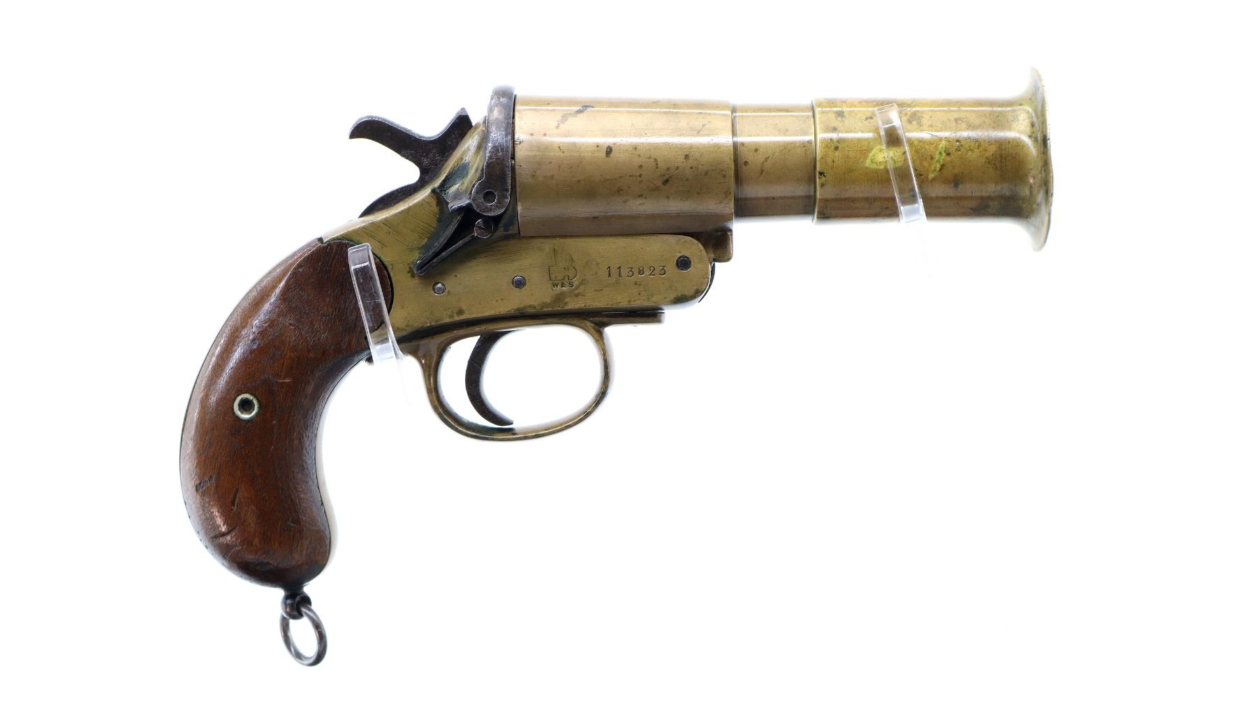 Main Description: No sights, brass construction, flared muzzle, checkered spur hammer and opening lever that function. Two piece smooth wood grips, lanyard ring.
