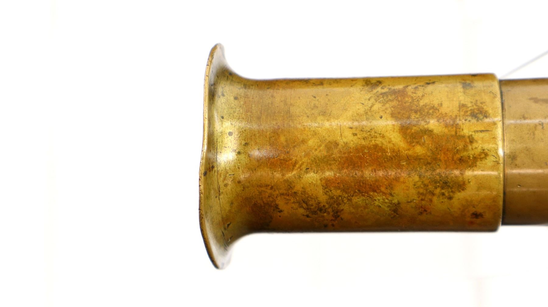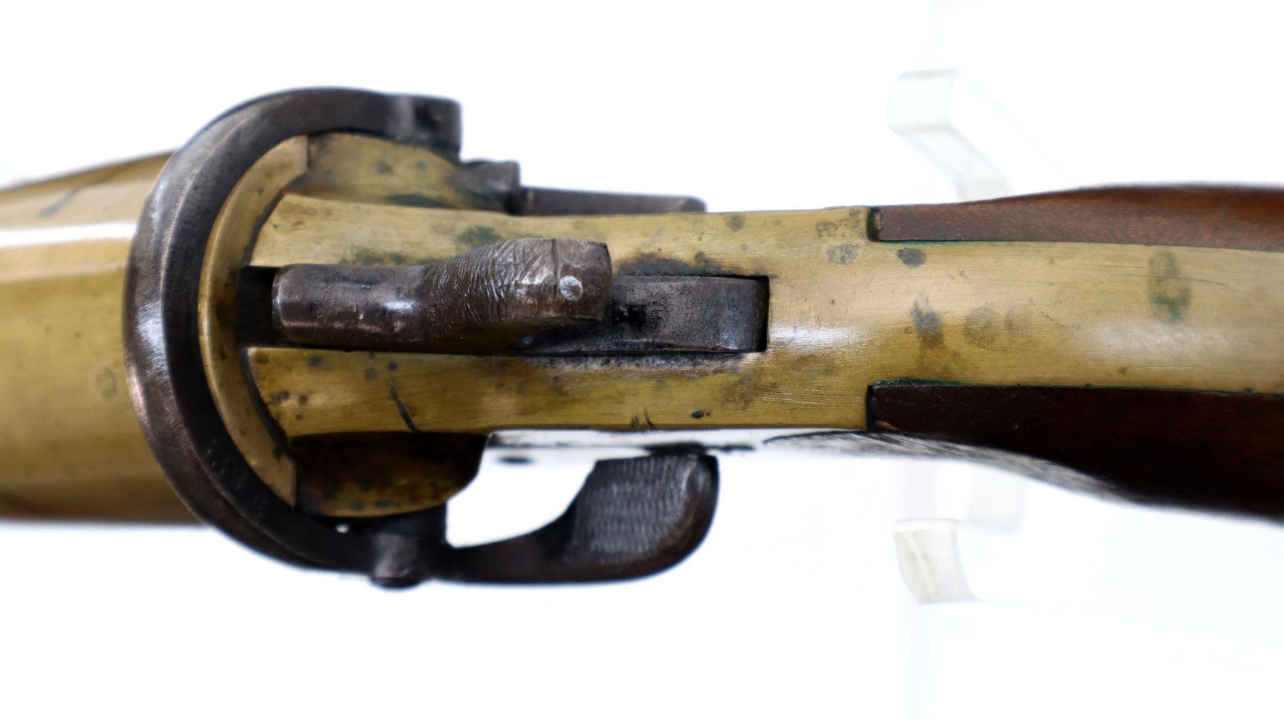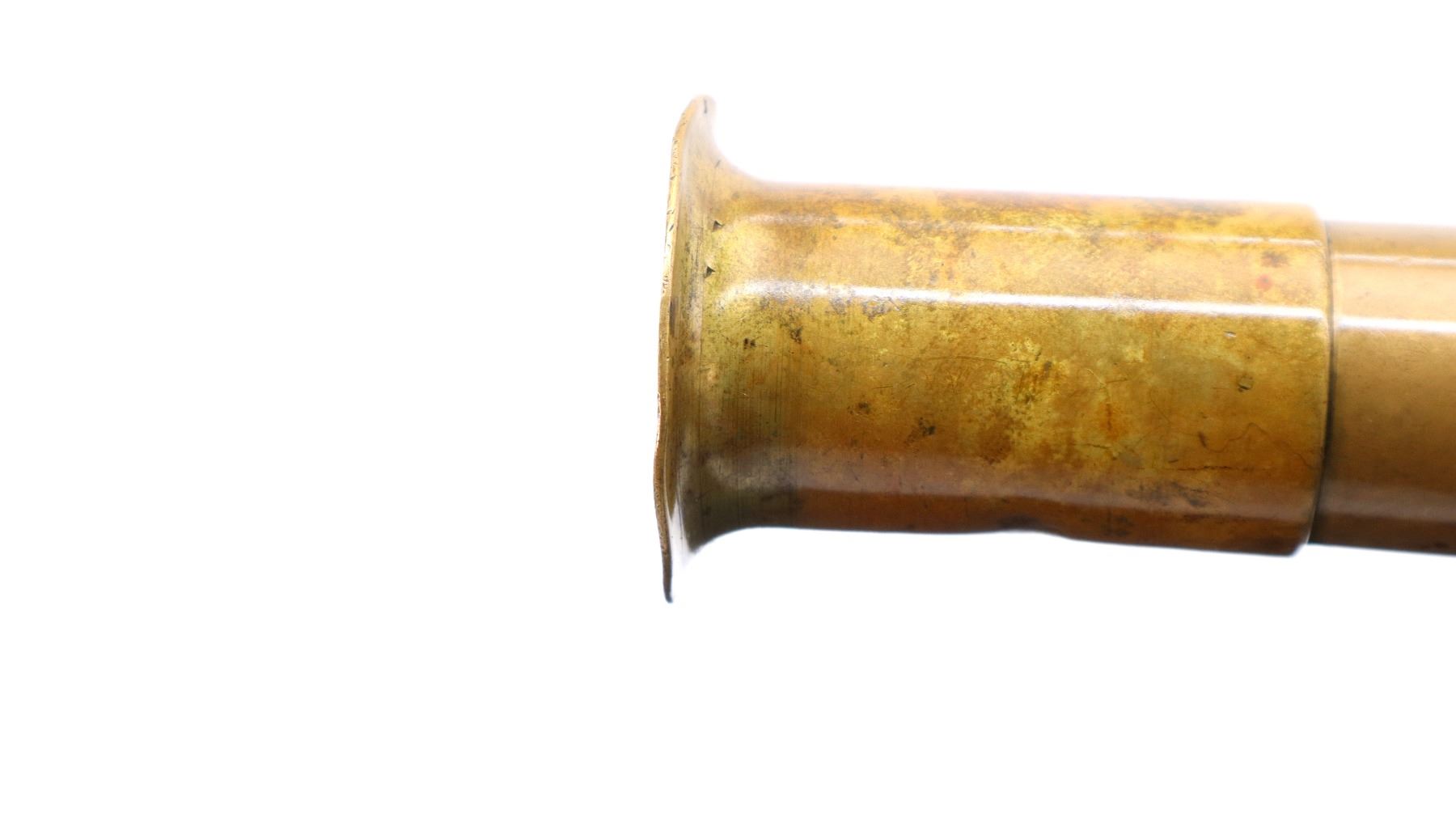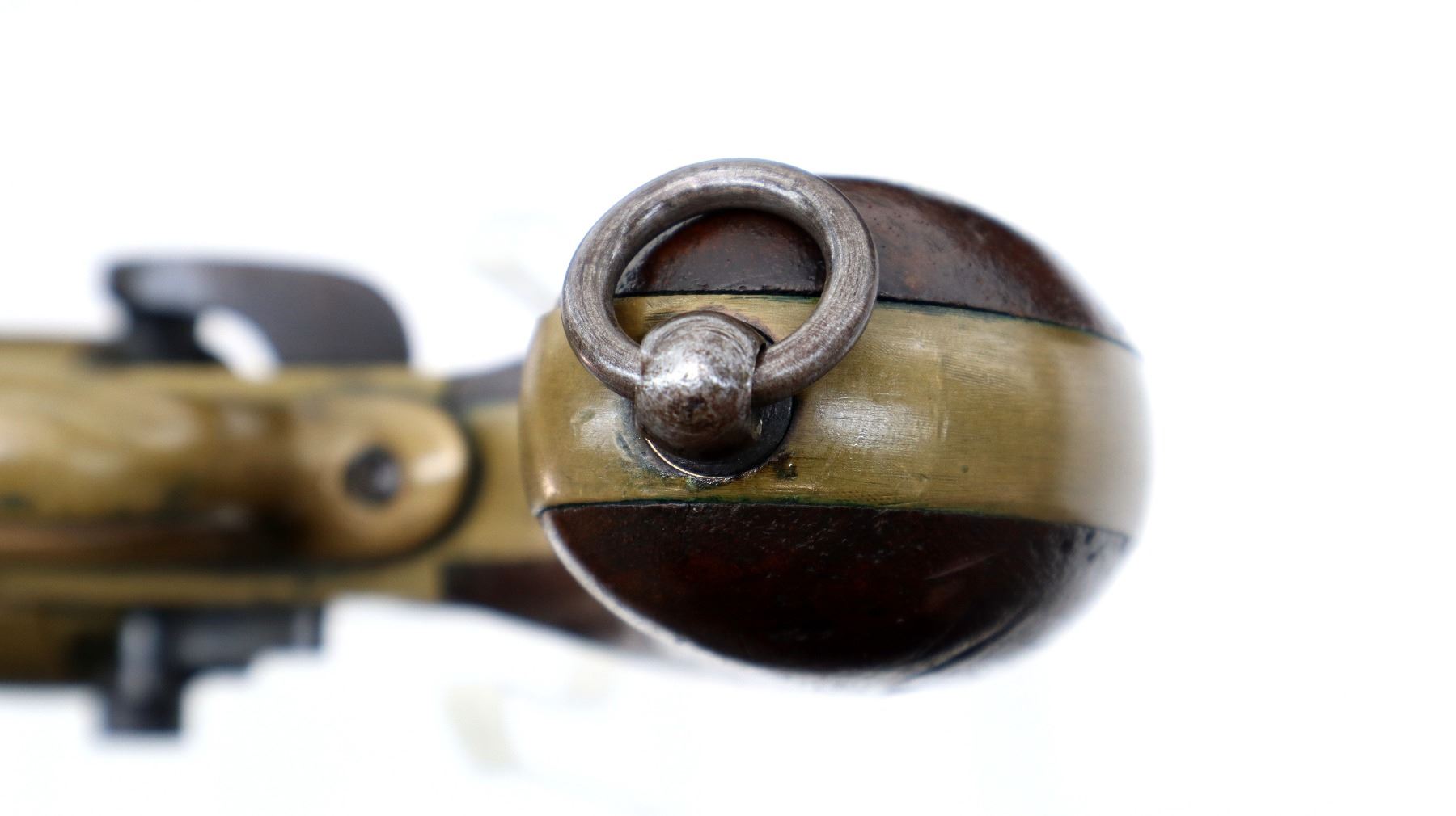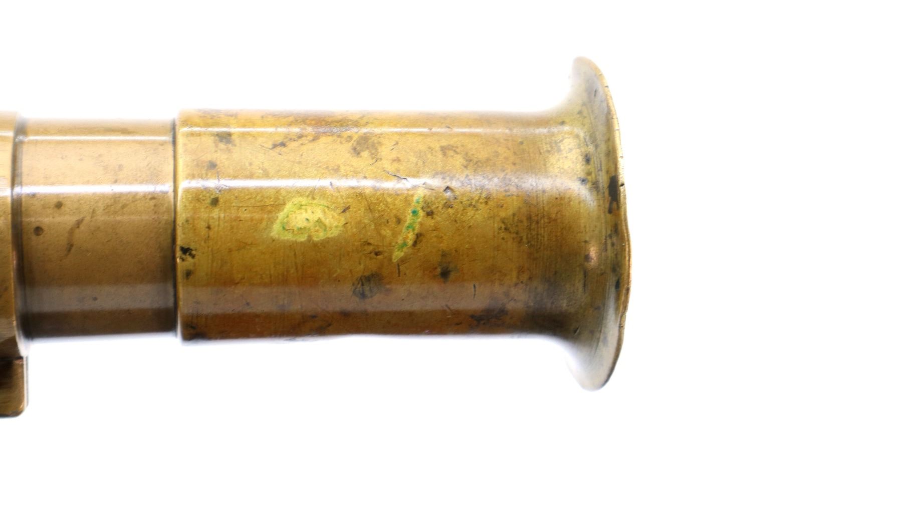 Main Description: No sights, brass construction, flared muzzle, checkered spur hammer and opening lever that function. Two piece smooth wood grips, lanyard ring.