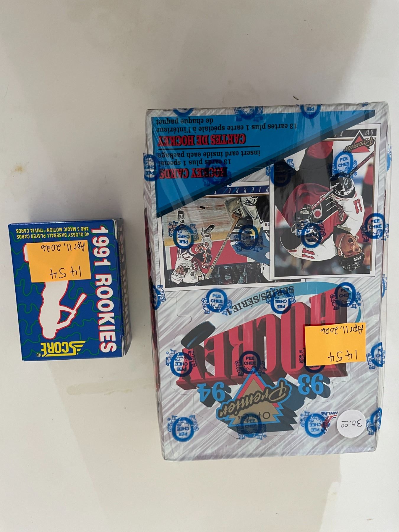 1993-94 premier series 1 sealed box of hockey cards and 40 baseball 1991 rookies cards unopened