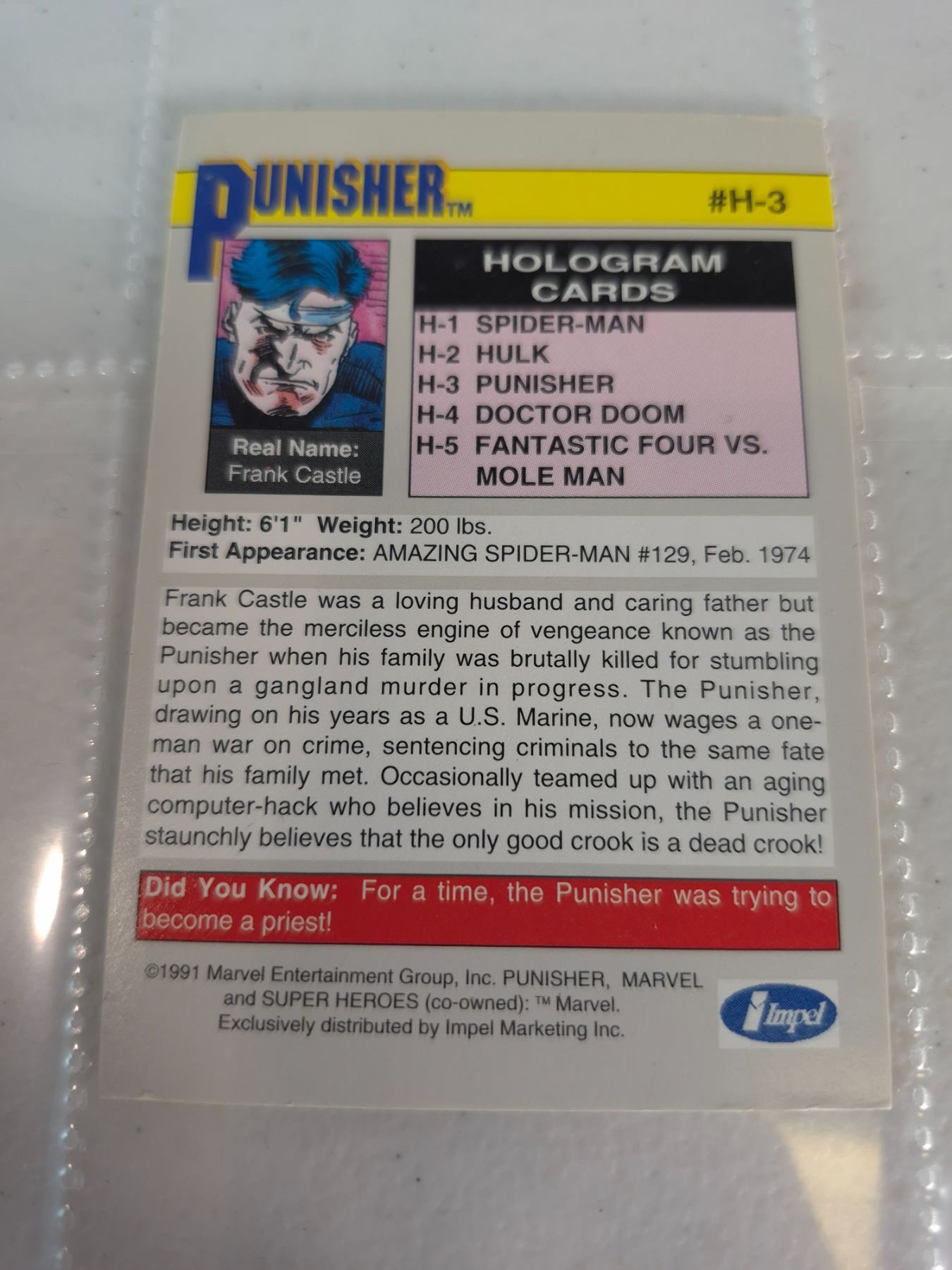 Lot 19 1991 Marvel Universe Series II Hologram Insert Card: Punisher