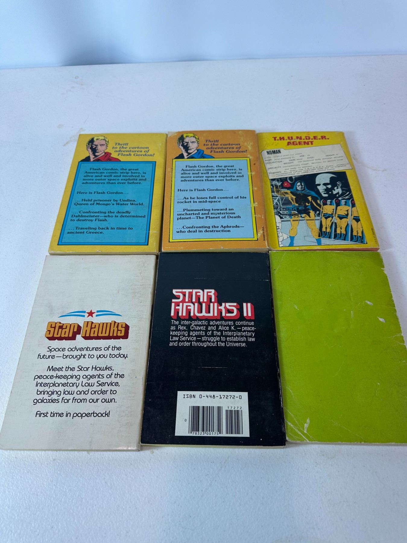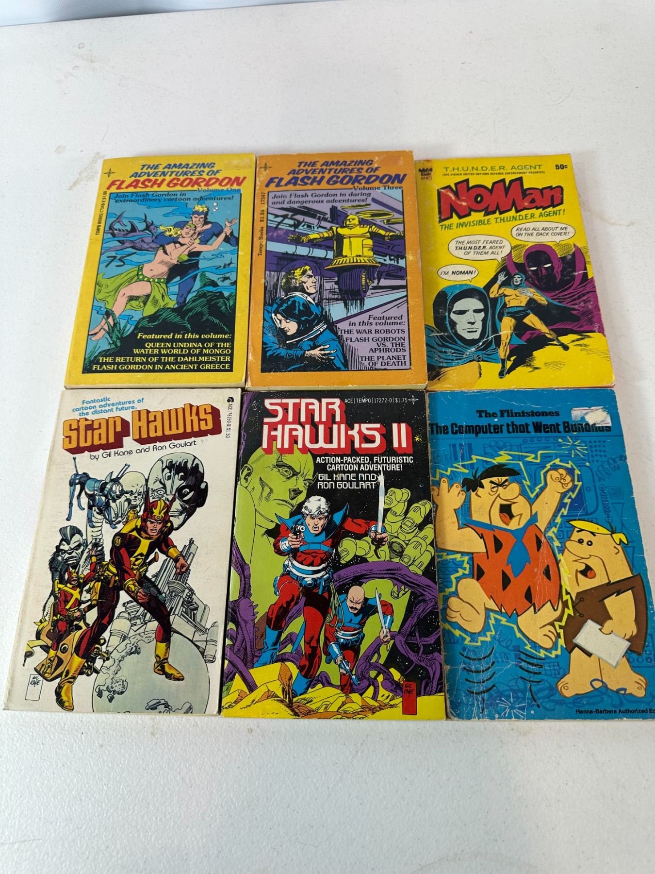 Mixed lot of six vintage comic books and paperback graphic novels including Flash Gordon volumes, NoMan (T.H.U.N.D.E.R. Agents), Star Hawks I & II by Gil Kane and Ron Goulart, and a Flintstones title. Colorful classic sci-fi and cartoon titles.