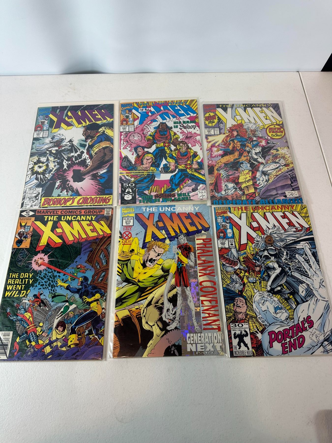 Lot of six Marvel 'Uncanny X-Men' comics featuring notable story arcs including Bishop-s Crossing, Phalanx Covenant, and other 1990s-era issues. Includes appearances by key characters such as Bishop, Storm, and more. Comics are bagged and show light to moderate wear consistent with age and handling.