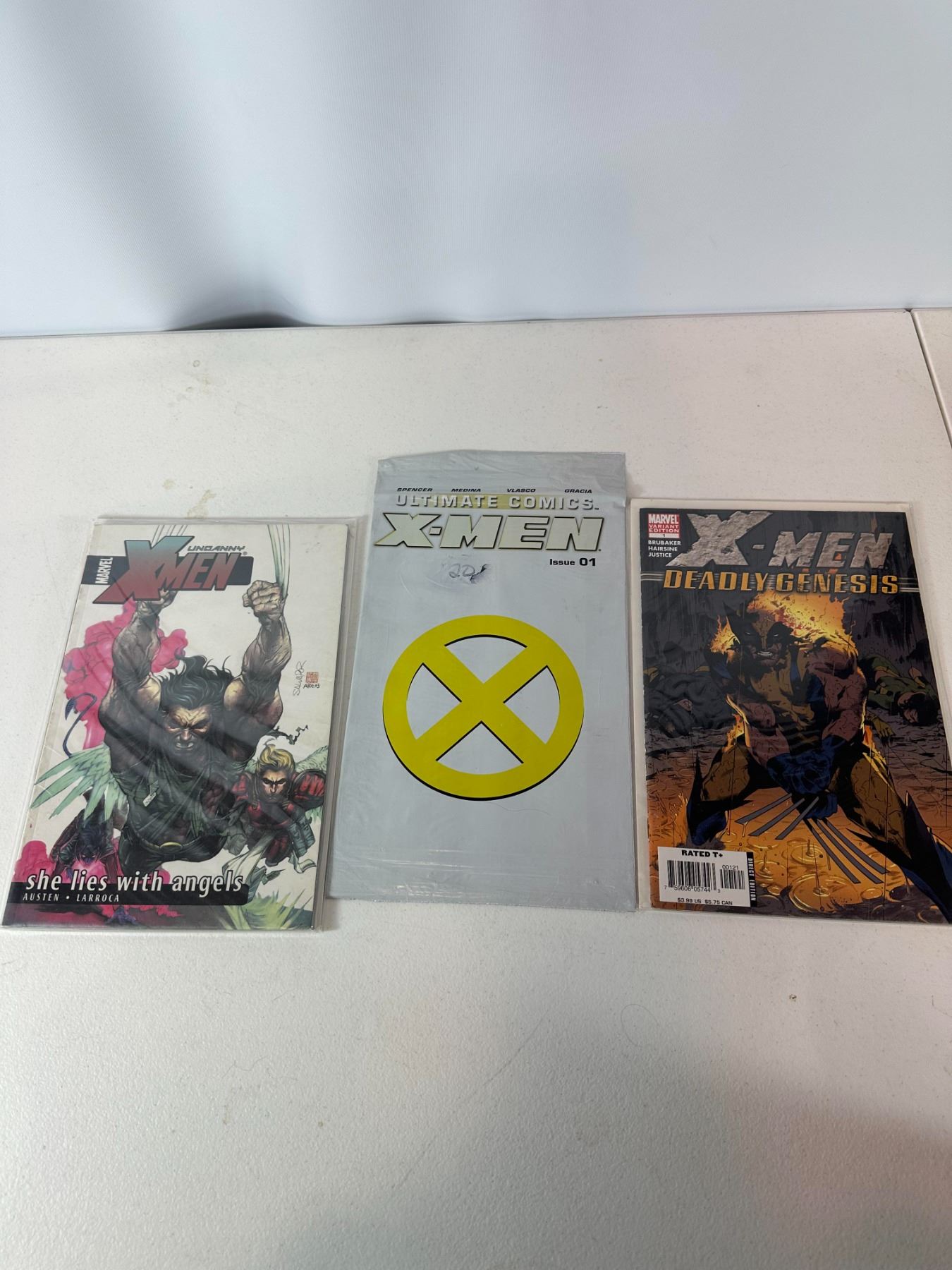 Lot of three Marvel X-Men comics including Ultimate X-Men Issue #1, X-Men: Deadly Genesis, and an Uncanny X-Men issue ('She Lies With Angels'). Features key modern storylines and popular mutant characters. Comics are bagged and show light to moderate wear consistent with age and handling.