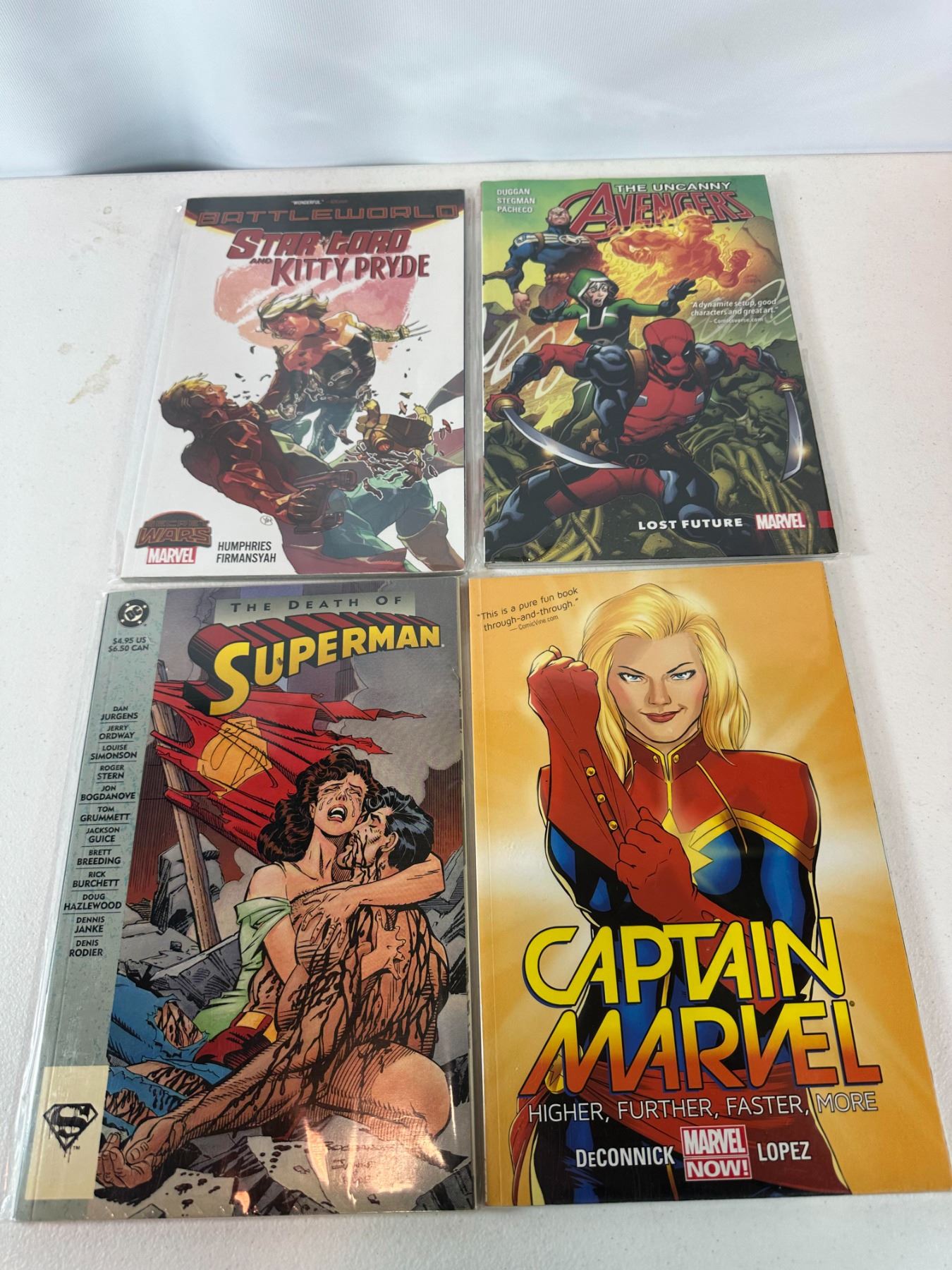 Lot 101 Marvel & DC Graphic Novel Lot - Captain Marvel, Death of Superman, Avengers & Star-Lord (4
