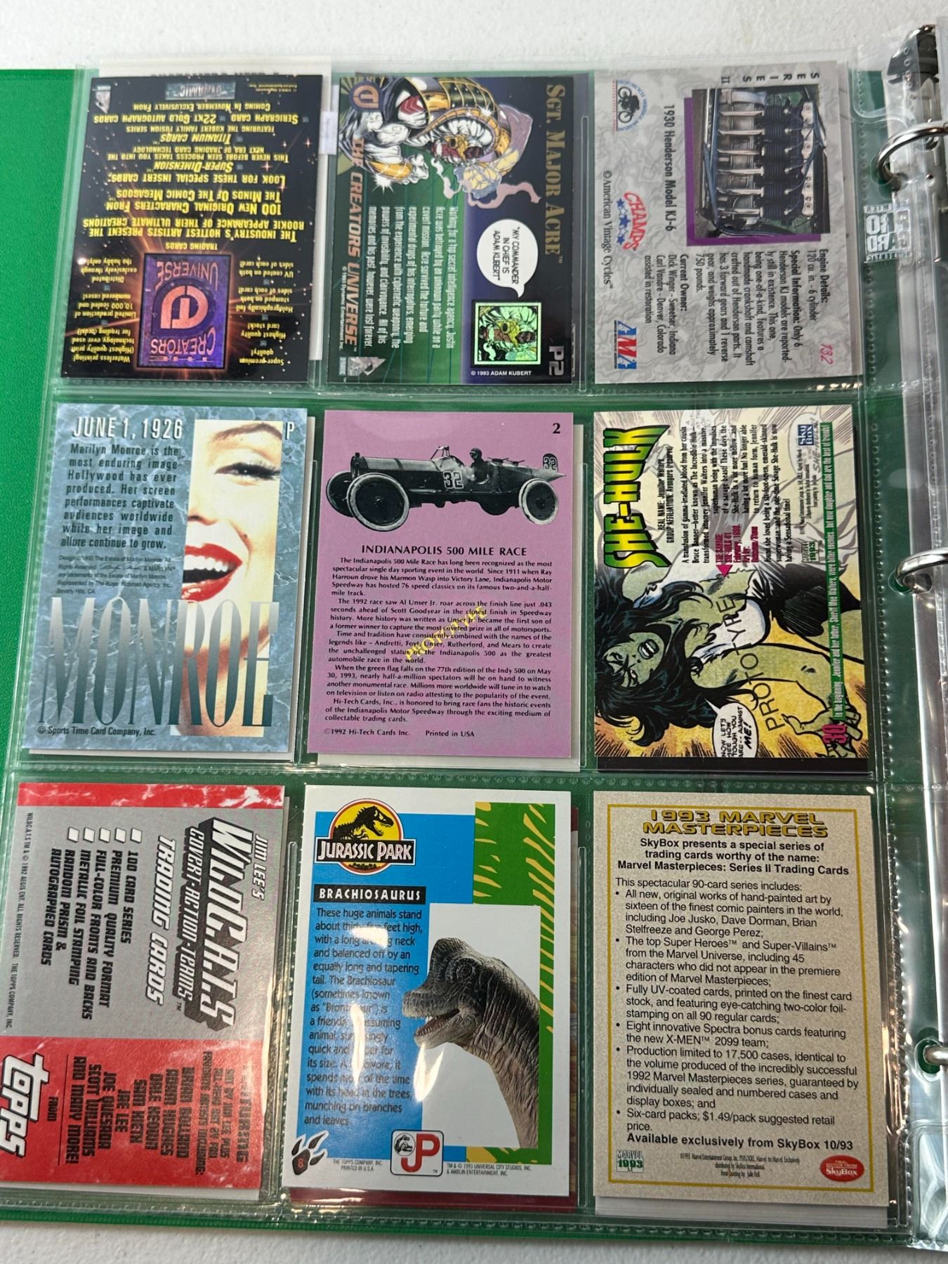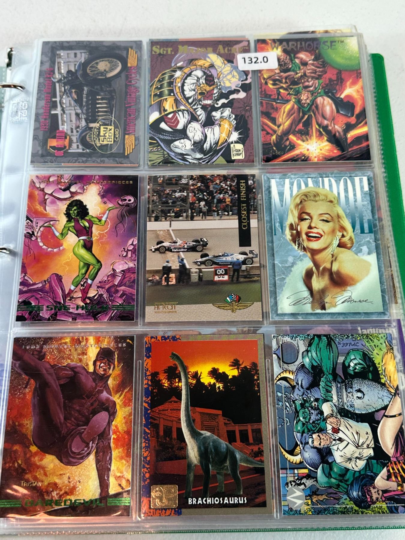 Binder page of assorted collectible trading cards including comic, celebrity, sports, and holographic cards. Includes 9-pocket sheet.