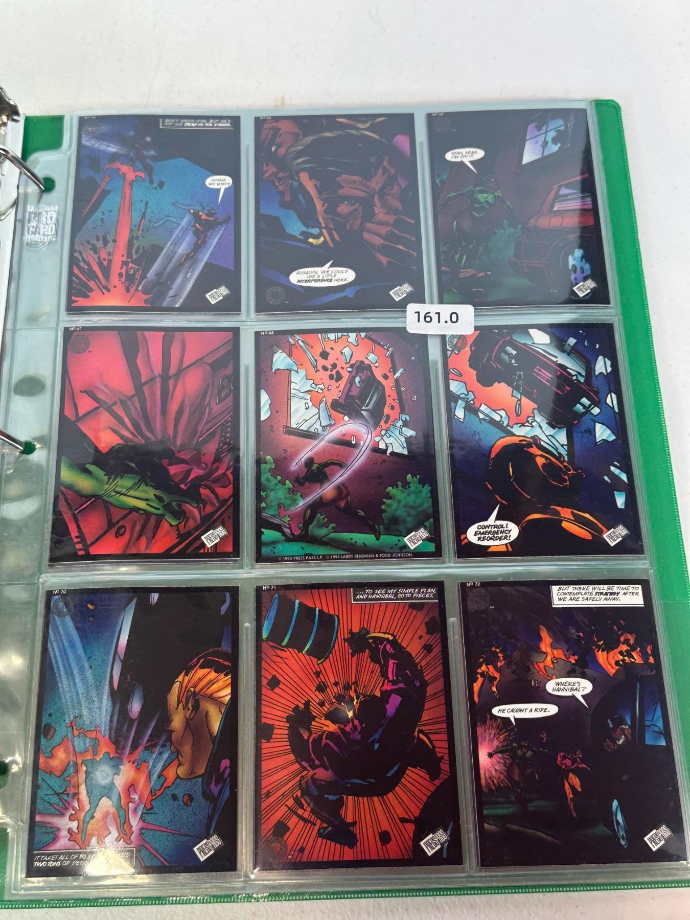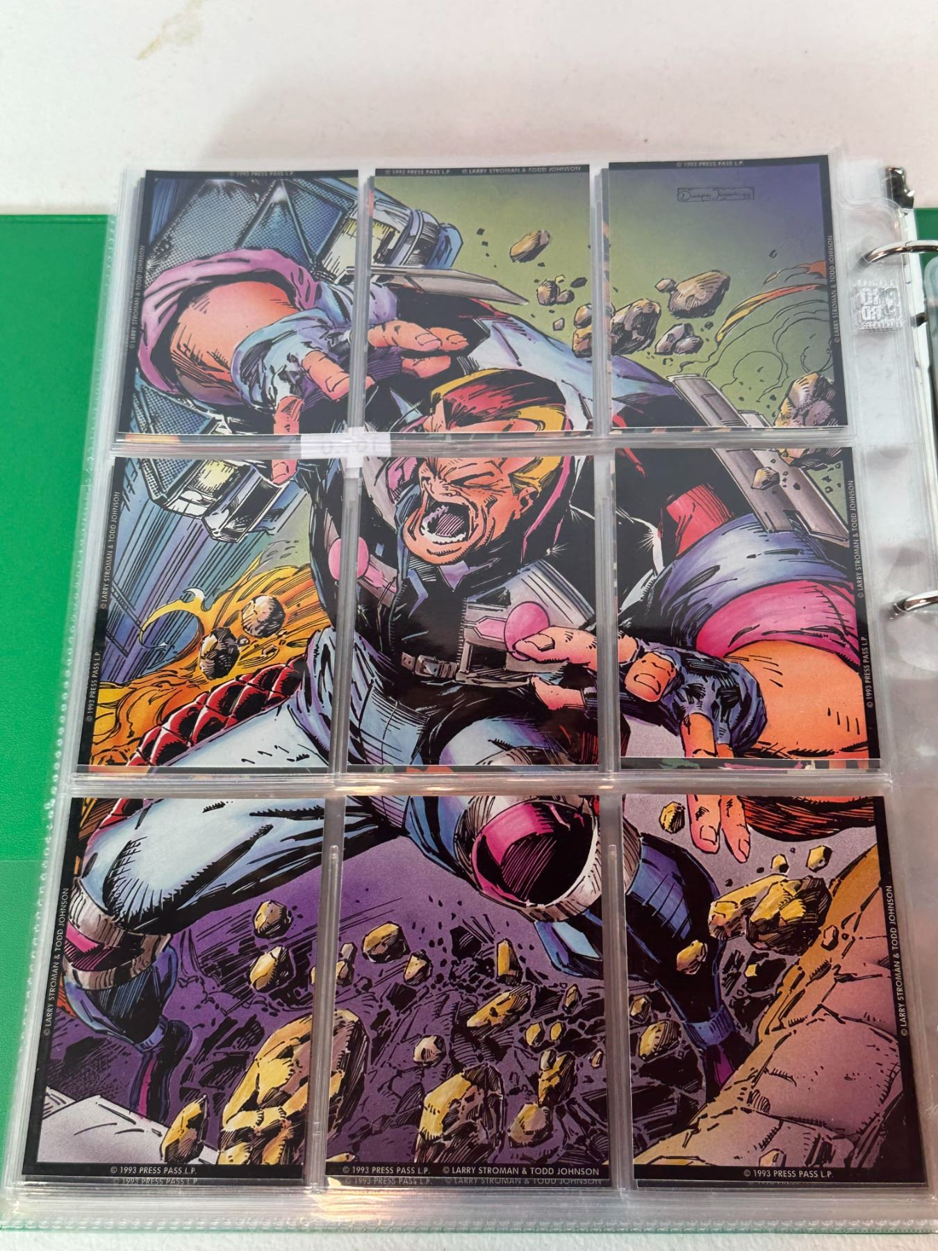 Binder page featuring continued sequential comic panel trading cards from a 1990s Press Pass-style set. Shows ongoing action scenes and storyline progression.