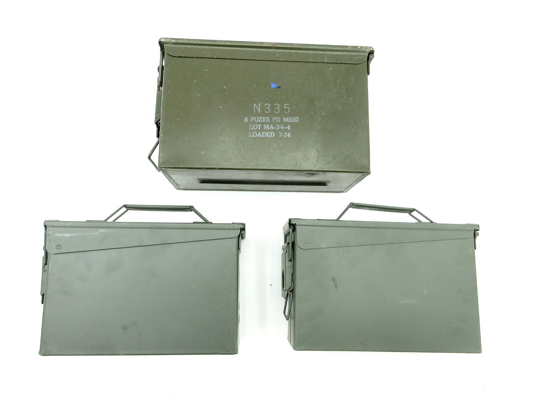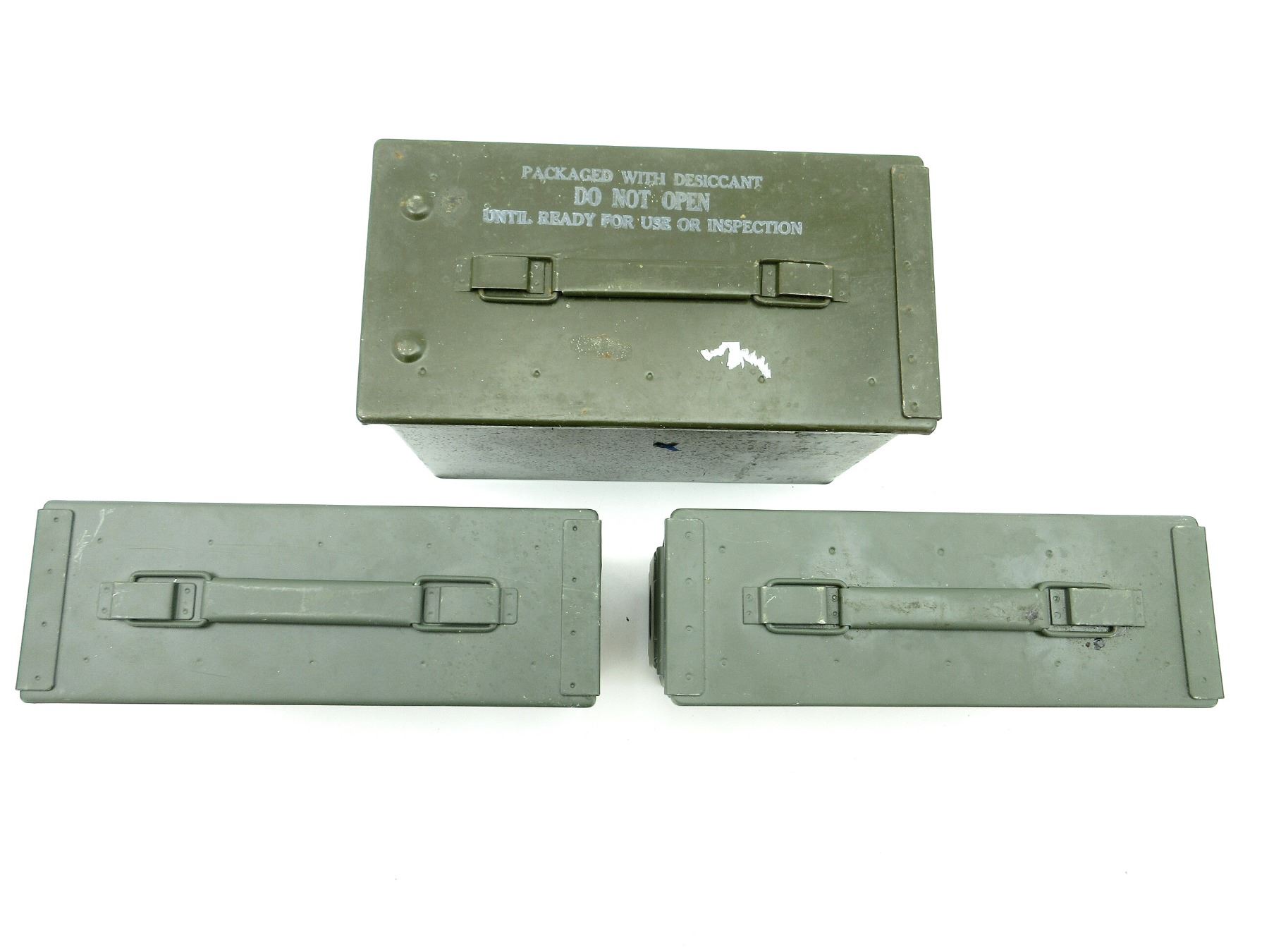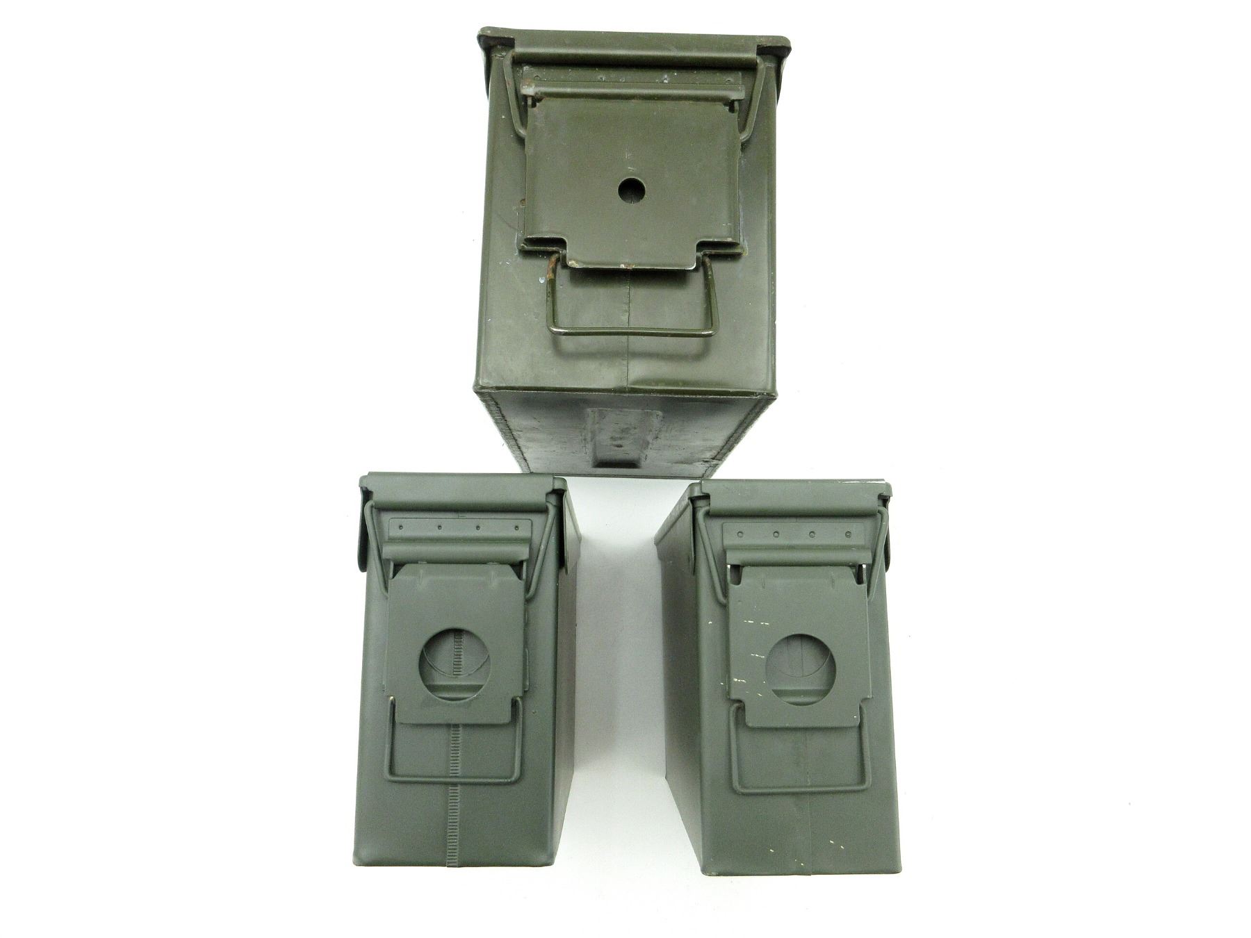 LOT INCLUDES; (1) GREEN PAINTED METAL AMMO TIN, VARIOUS MARKINGS, APPROX. 12" X 6.25" X 7.25" & (2) GREEN PAINTED METAL AMMO TINS, VARIOUS MARKINGS, APPROX. 11" X 3.75" X 7". SEE PHOTOS.