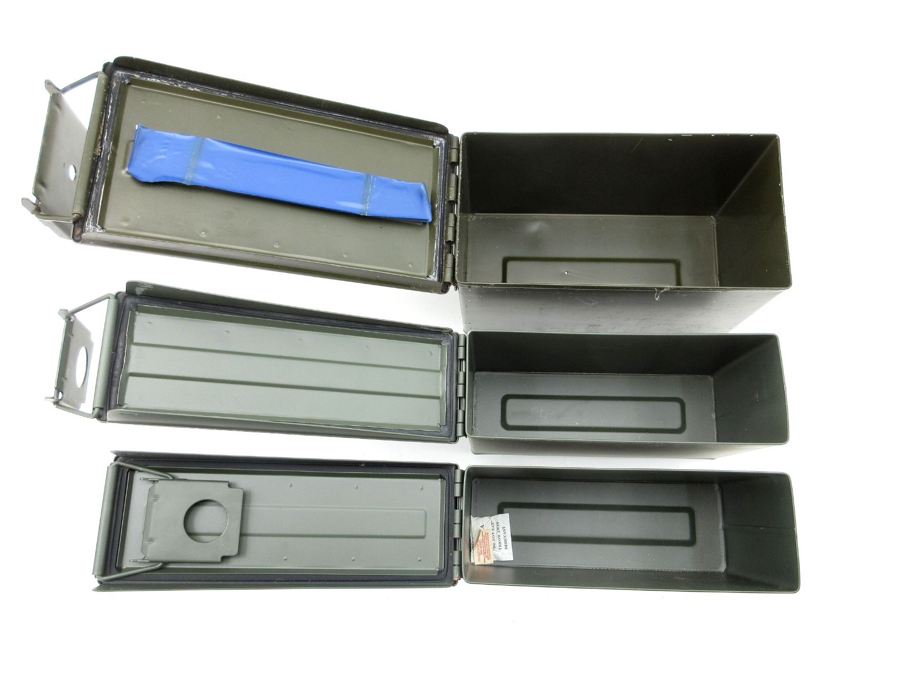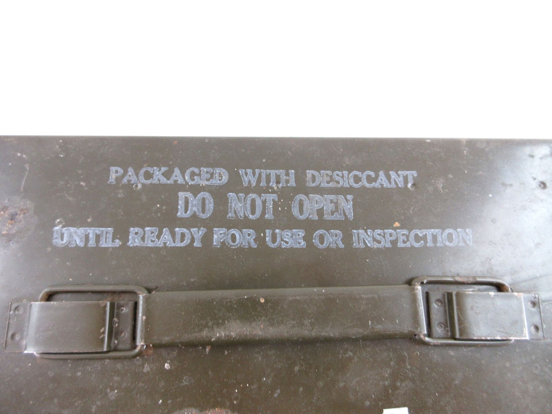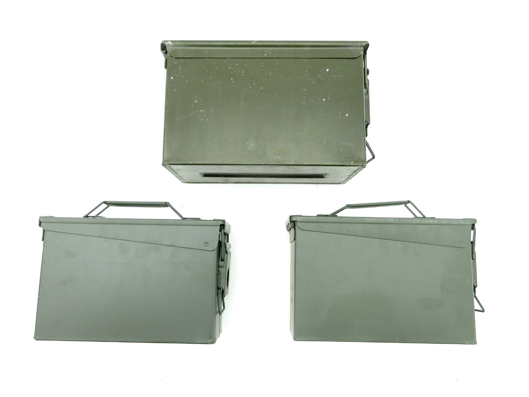 LOT INCLUDES; (1) GREEN PAINTED METAL AMMO TIN, VARIOUS MARKINGS, APPROX. 12" X 6.25" X 7.25" & (2) GREEN PAINTED METAL AMMO TINS, VARIOUS MARKINGS, APPROX. 11" X 3.75" X 7". SEE PHOTOS.