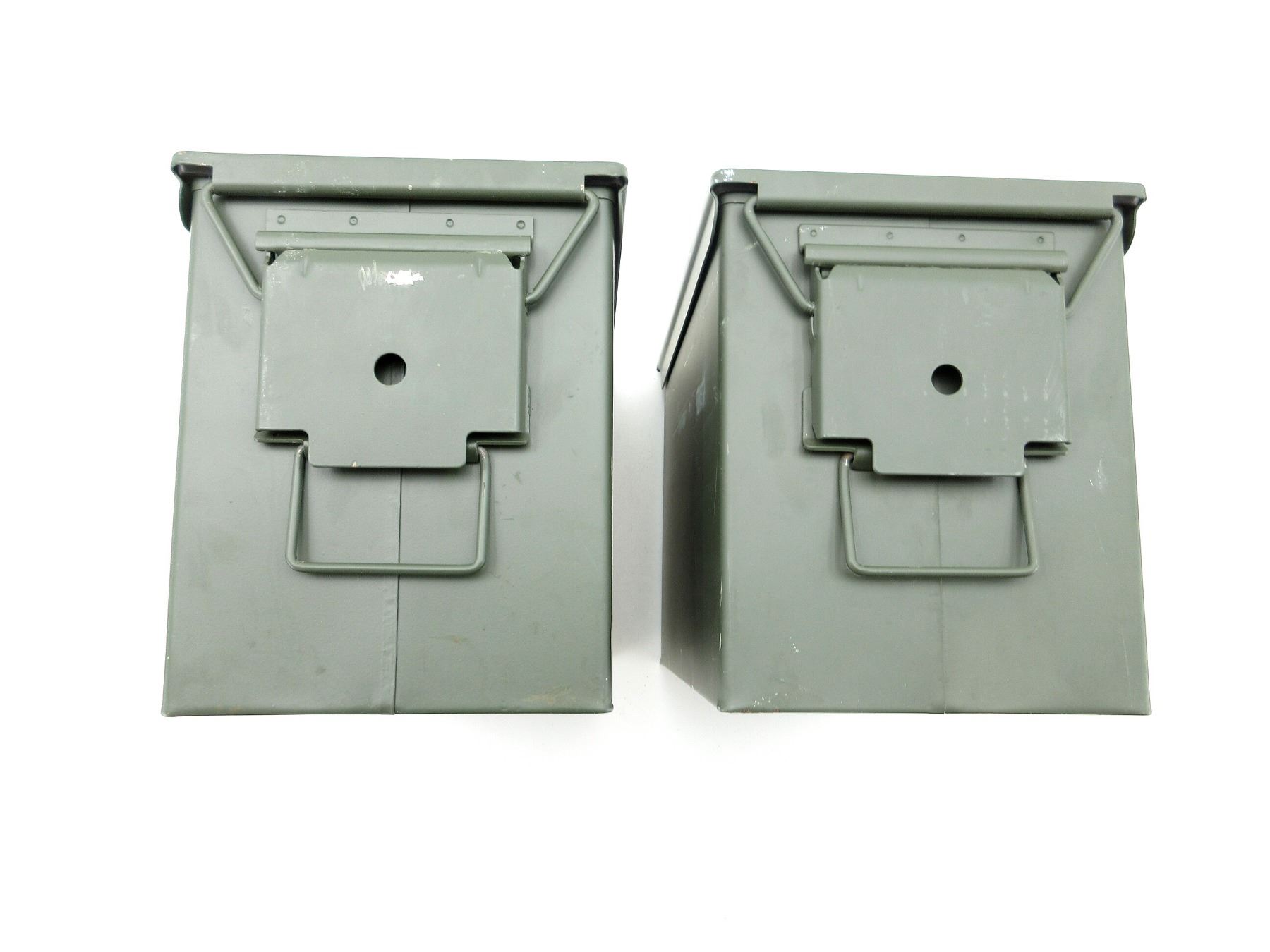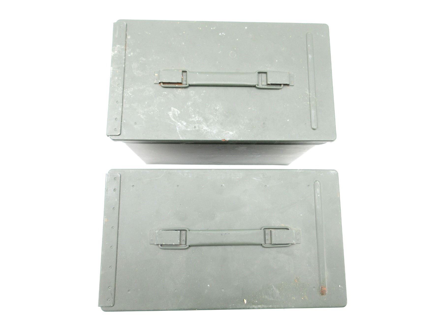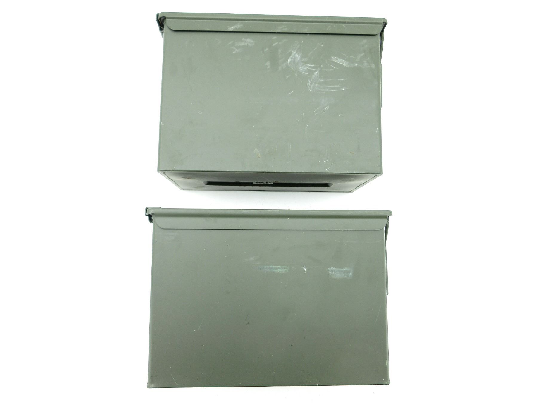 LOT INCLUDES; (2) GREEN PAINTED METAL AMMO TINS, VARIOUS MARKINGS, APPROX. 13" X 7.25" X 8.75". SEE PHOTOS.