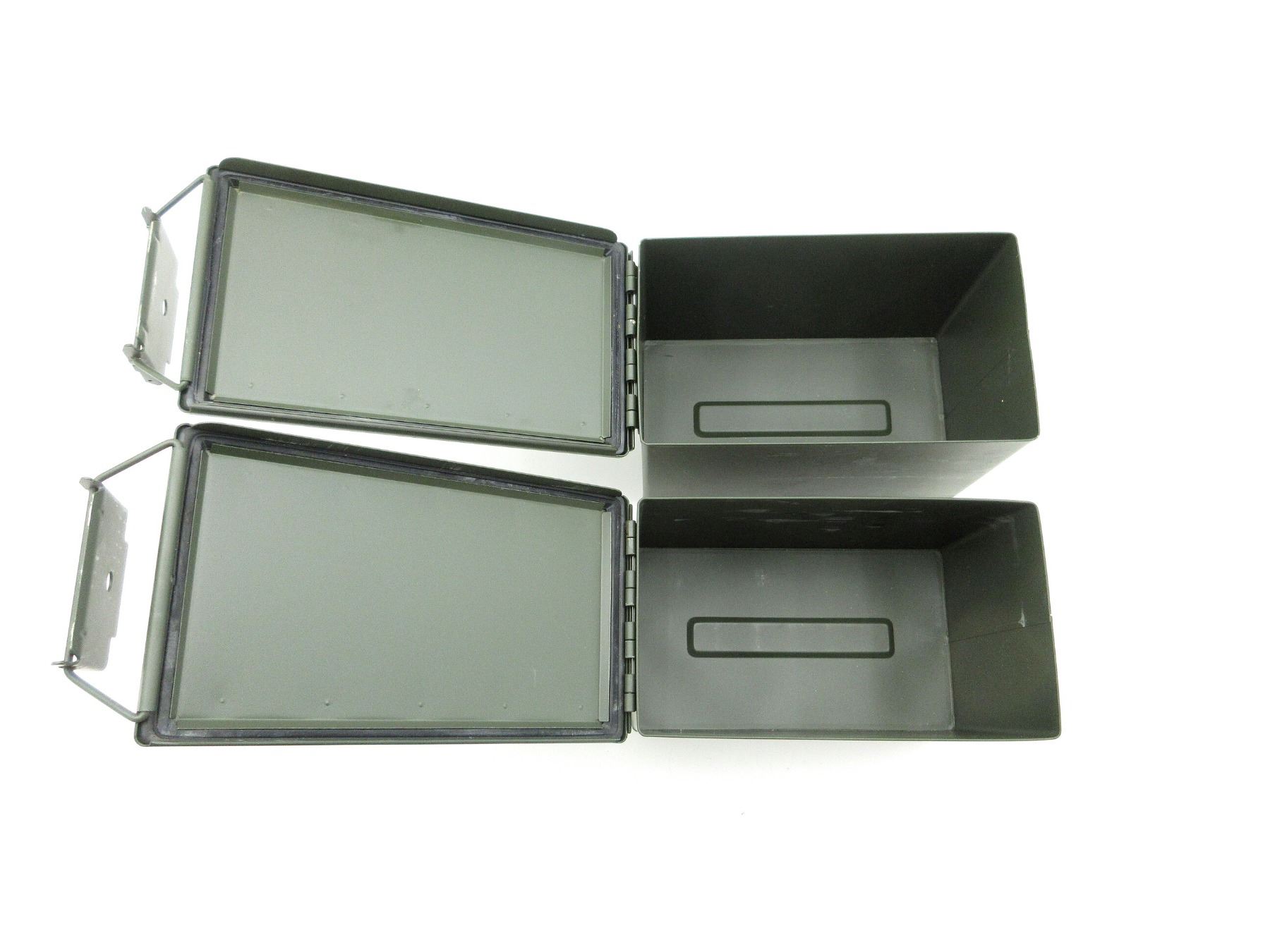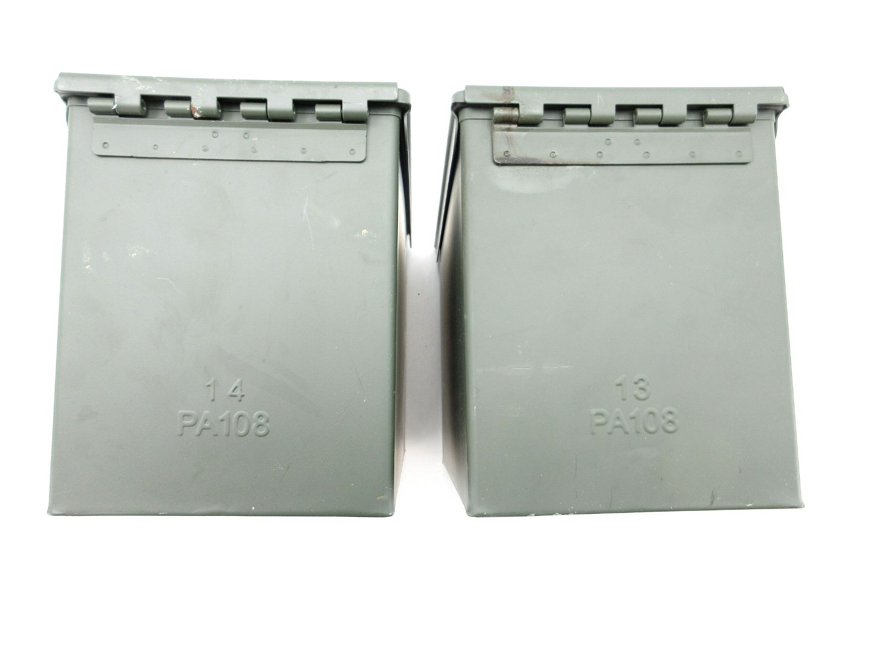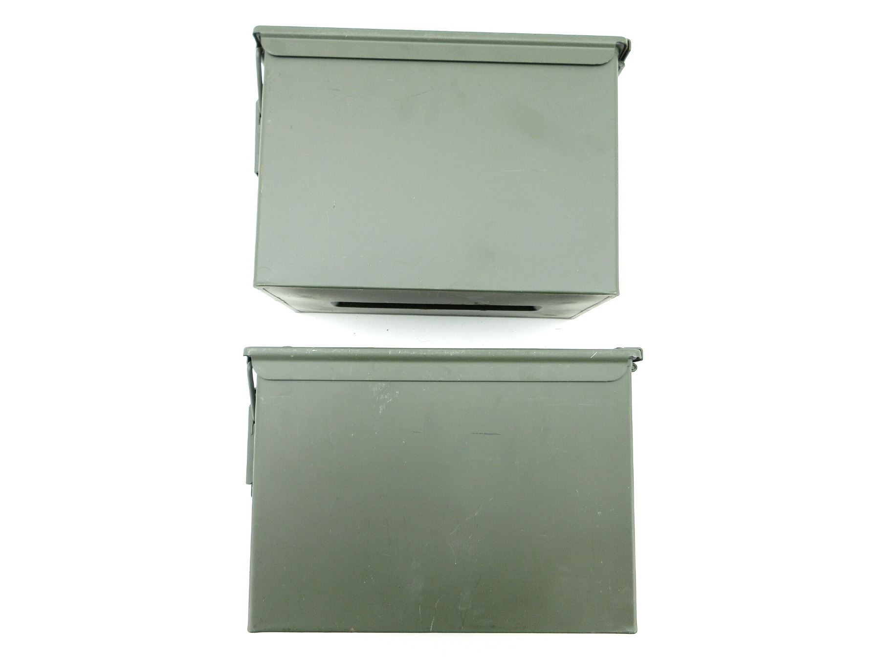 LOT INCLUDES; (2) GREEN PAINTED METAL AMMO TINS, VARIOUS MARKINGS, APPROX. 13" X 7.25" X 8.75". SEE PHOTOS.