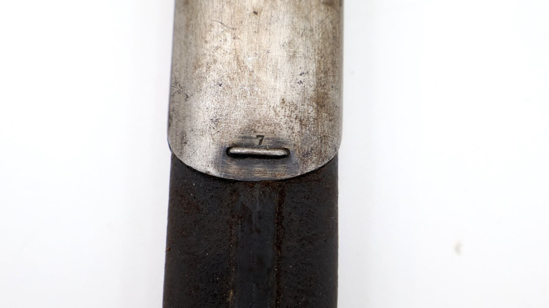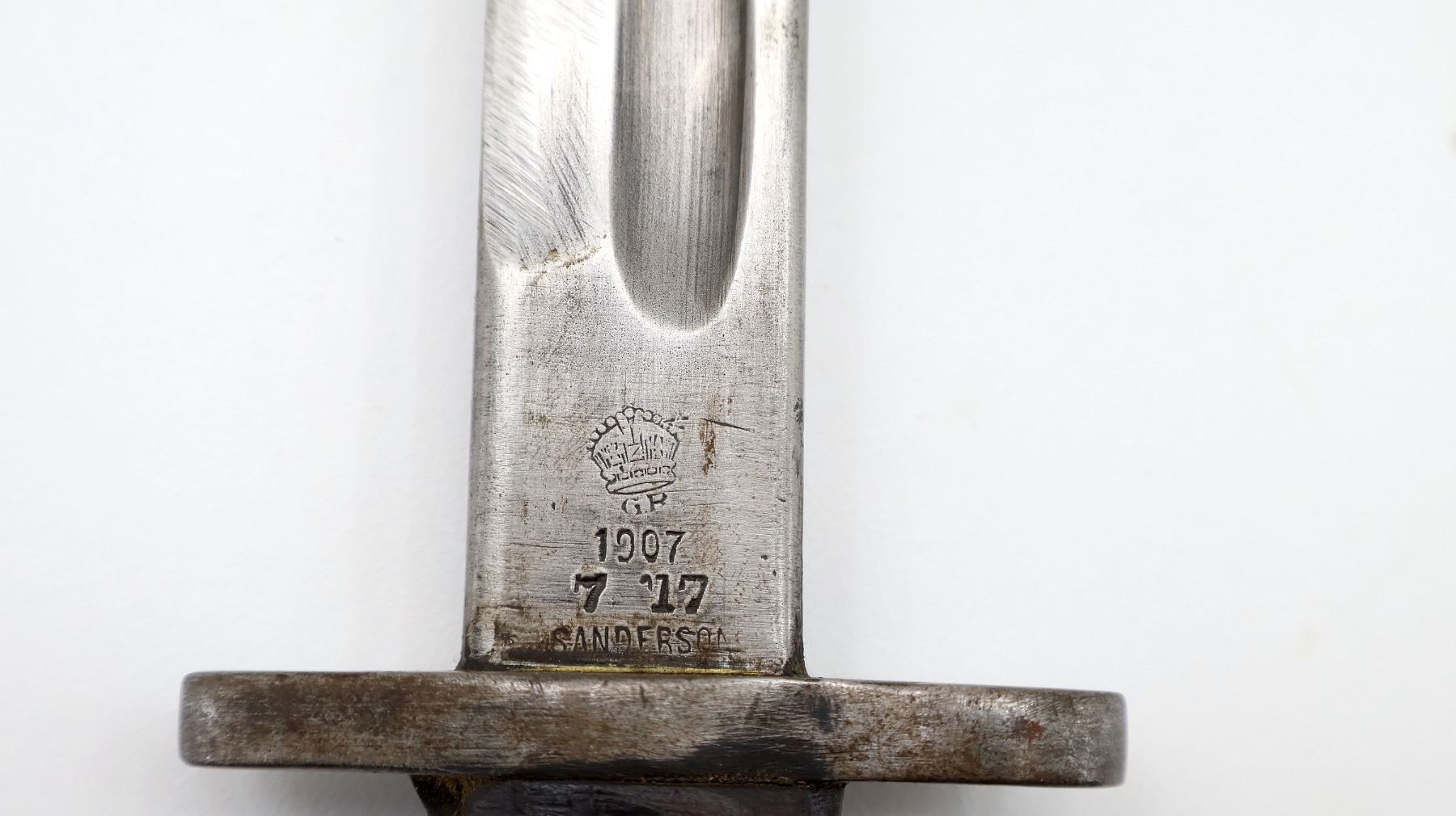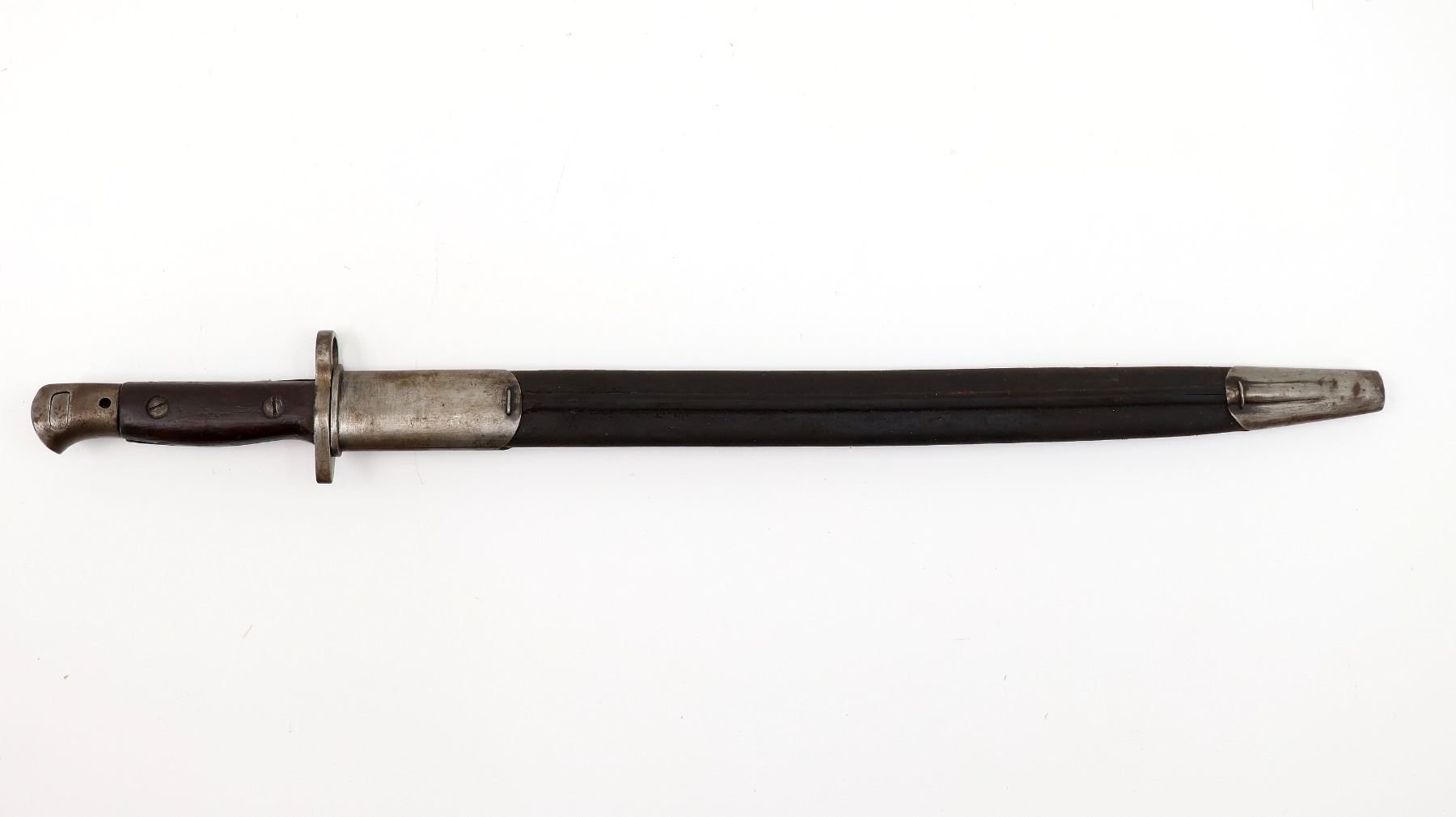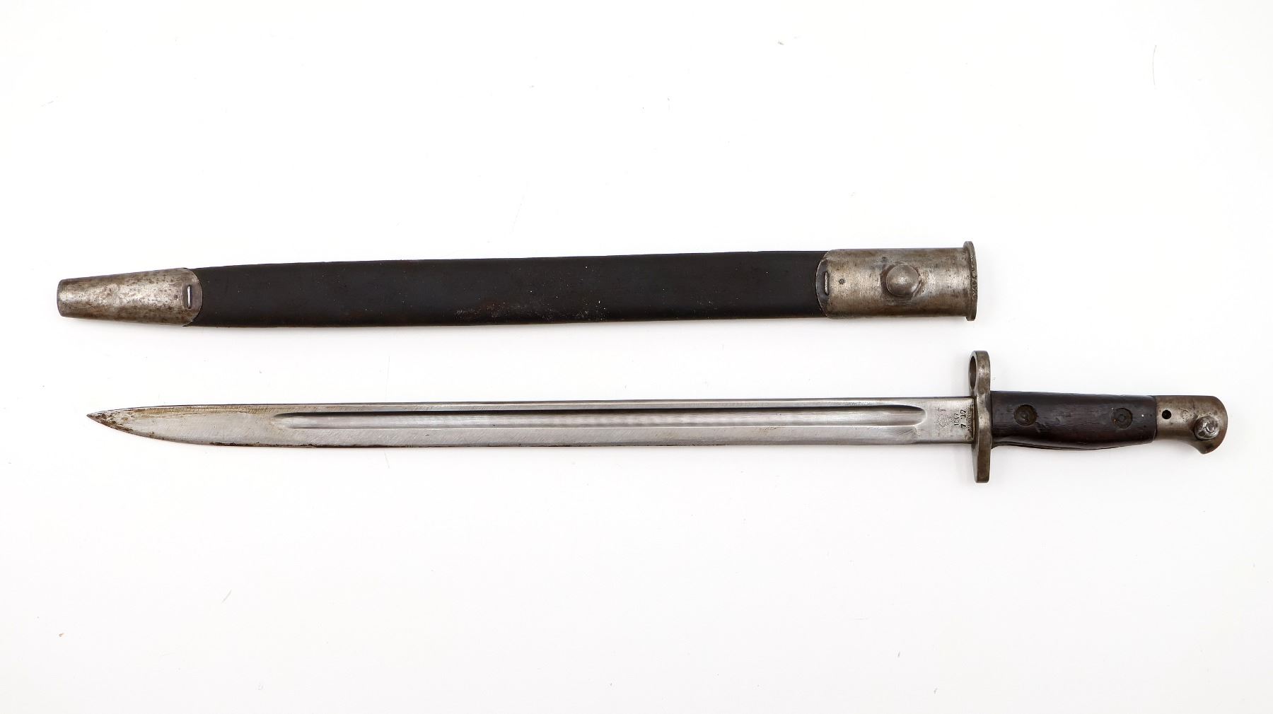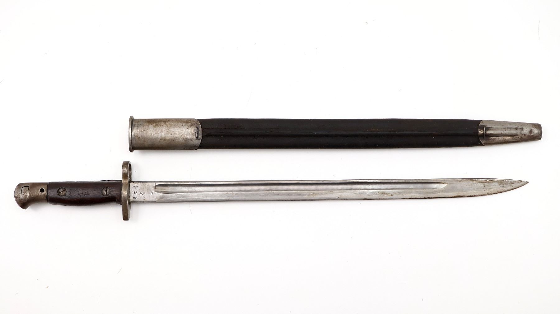 (1) FITS LEE ENFIELD NO.1 MKIII RIFLES, RICASSO MARKED: CROWN OVER "GR" OVER "1907" OVER "7 '17" OVER "SANDERSON", OTHER-SIDE MARKED: VARIOUS PROOF MARKS, "X" (BEND TEST) & BROAD ARROW, NO QUILLON, 2-PIECE WOOD GRIPS, METAL IN-BETWEEN GRIPS MARKED: "X" (BEND TEST), METAL POMMEL, NO VISIBLE MARKINGS, AUSTRALIAN LEATHER & METAL SCABBARD, THROAT EDGE MARKED: "3MD, 74924", FAINT / UN-CLEAR MARKINGS ON LEATHER, UNDER STUD MARKED: "A" IN A STAR, OTHER-SIDE MARKED: "7", OTHER METAL END MARKED: "A" IN A STAR, BLADE APPROX. 17 1/8" & OVERALL LENGTH APPROX. 22". SEE PHOTOS.