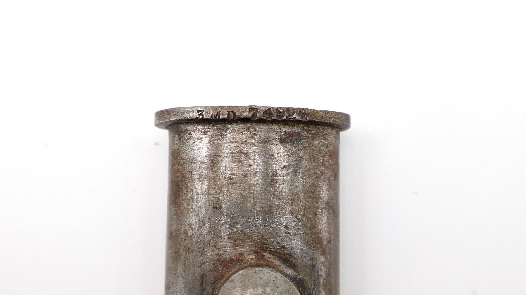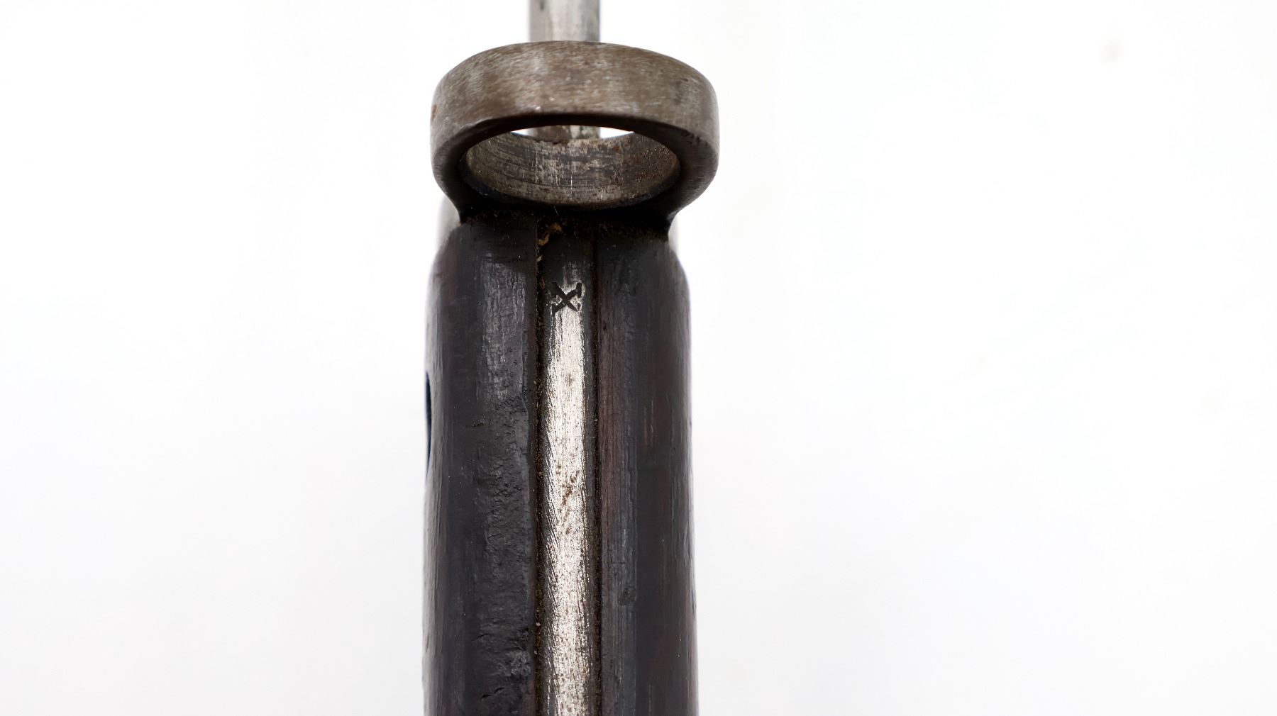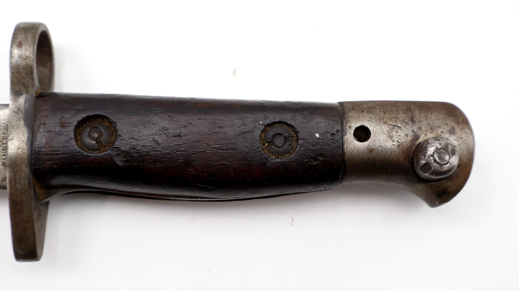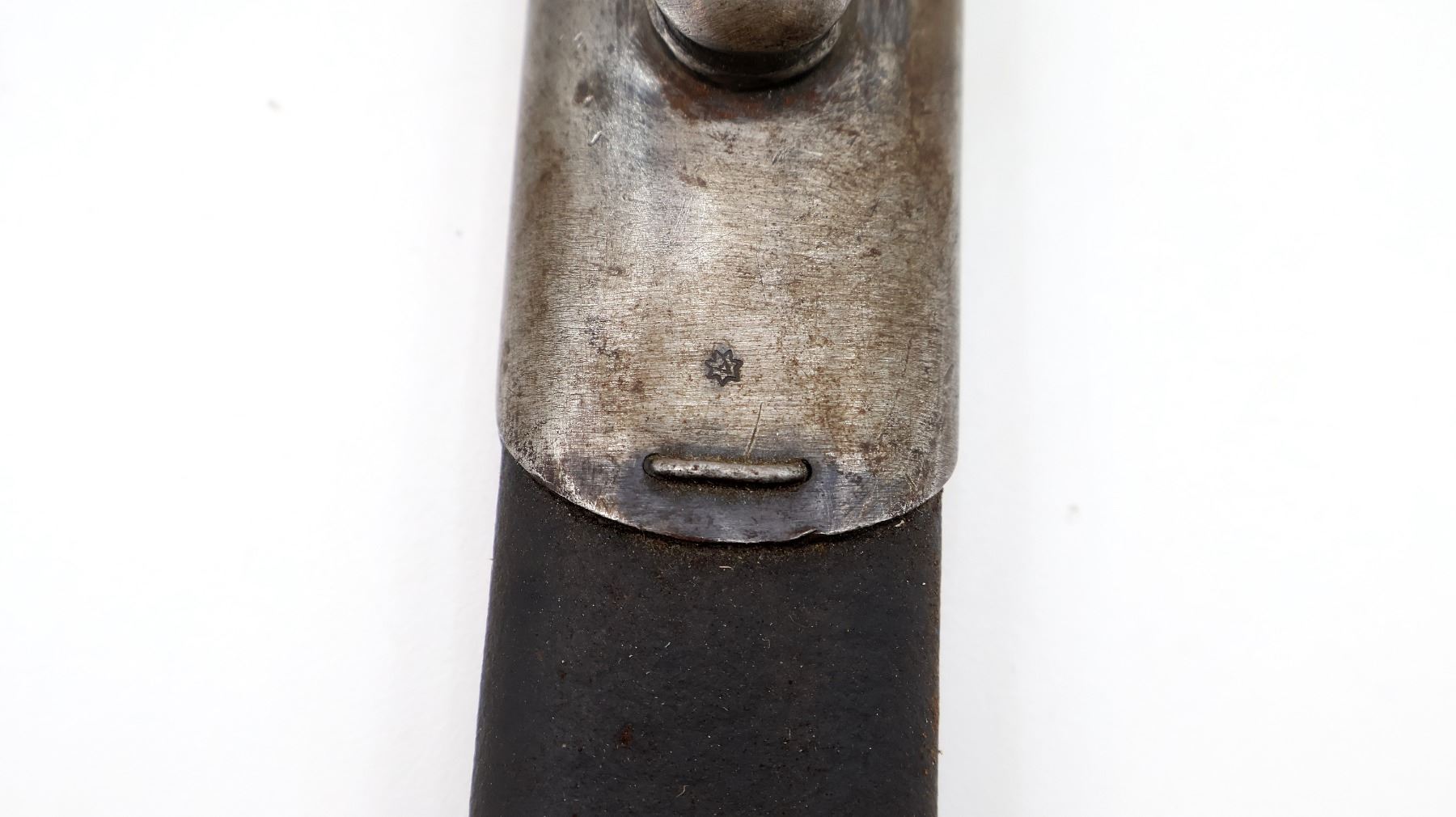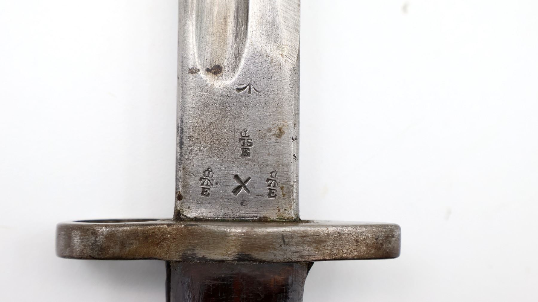 (1) FITS LEE ENFIELD NO.1 MKIII RIFLES, RICASSO MARKED: CROWN OVER "GR" OVER "1907" OVER "7 '17" OVER "SANDERSON", OTHER-SIDE MARKED: VARIOUS PROOF MARKS, "X" (BEND TEST) & BROAD ARROW, NO QUILLON, 2-PIECE WOOD GRIPS, METAL IN-BETWEEN GRIPS MARKED: "X" (BEND TEST), METAL POMMEL, NO VISIBLE MARKINGS, AUSTRALIAN LEATHER & METAL SCABBARD, THROAT EDGE MARKED: "3MD, 74924", FAINT / UN-CLEAR MARKINGS ON LEATHER, UNDER STUD MARKED: "A" IN A STAR, OTHER-SIDE MARKED: "7", OTHER METAL END MARKED: "A" IN A STAR, BLADE APPROX. 17 1/8" & OVERALL LENGTH APPROX. 22". SEE PHOTOS.