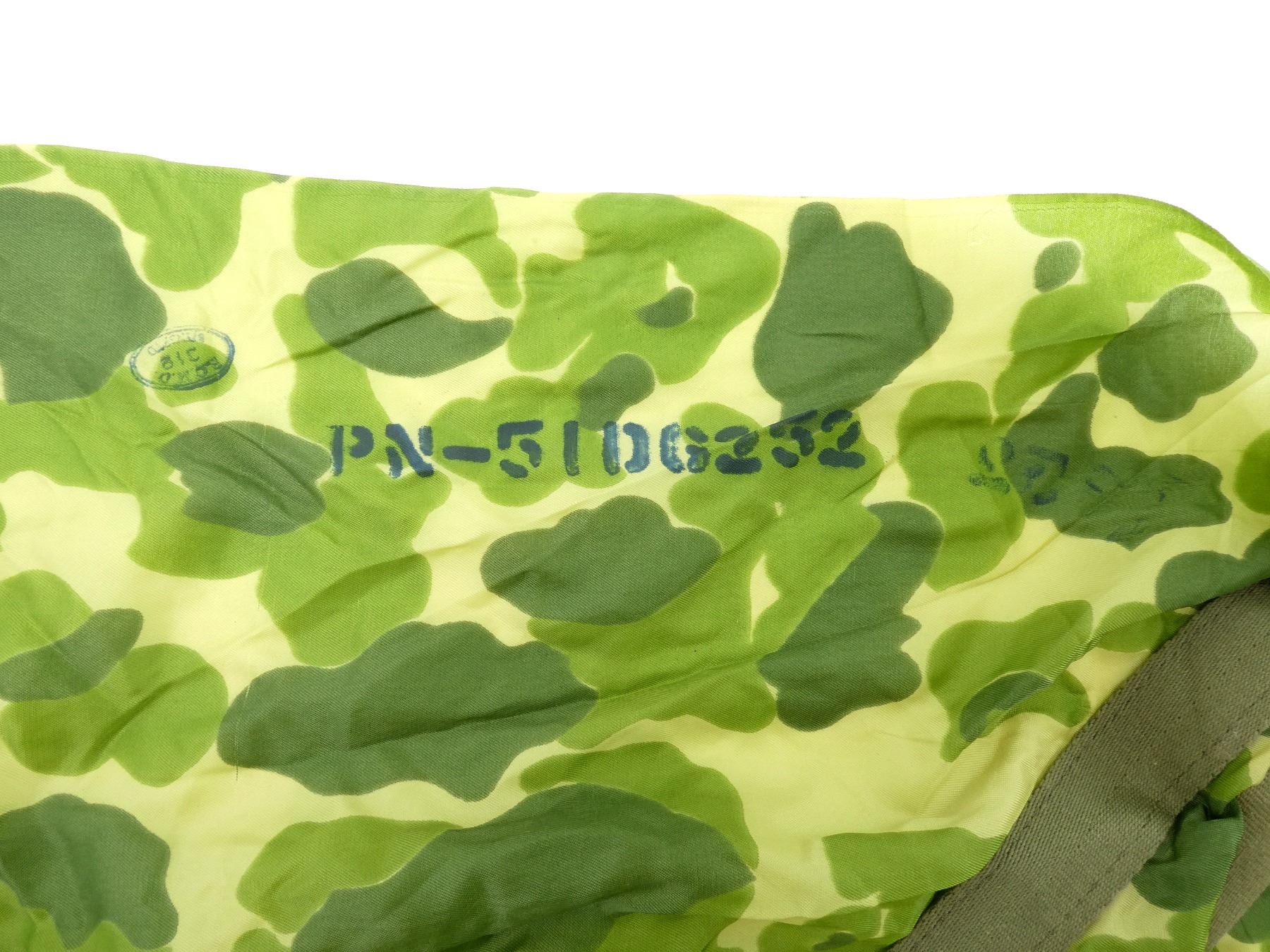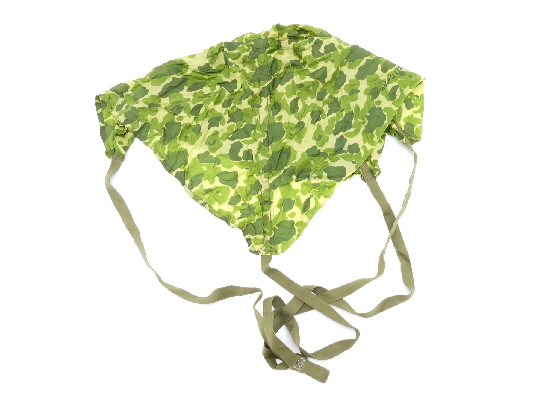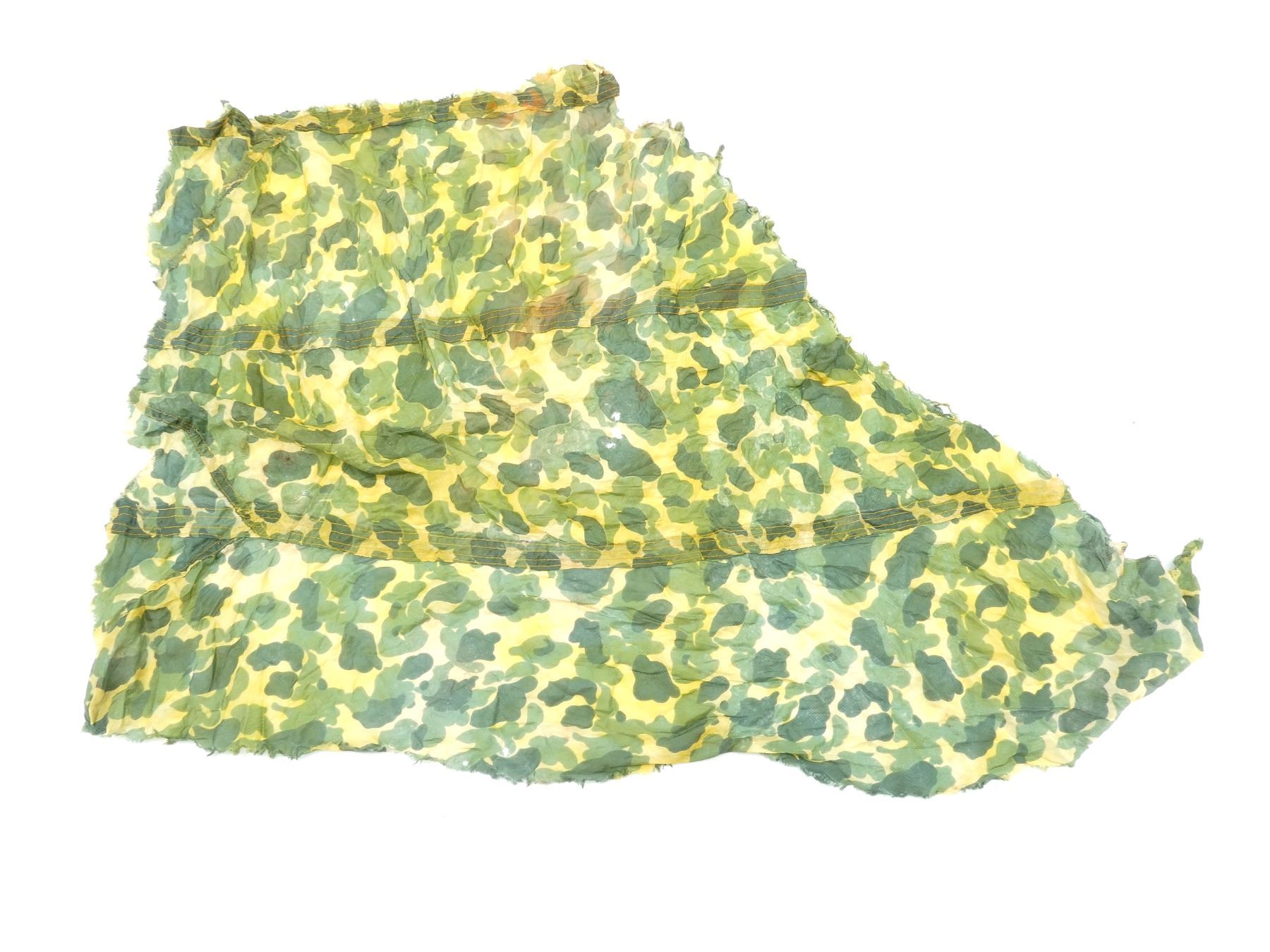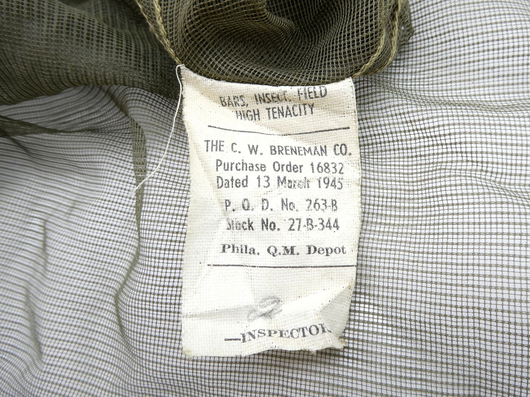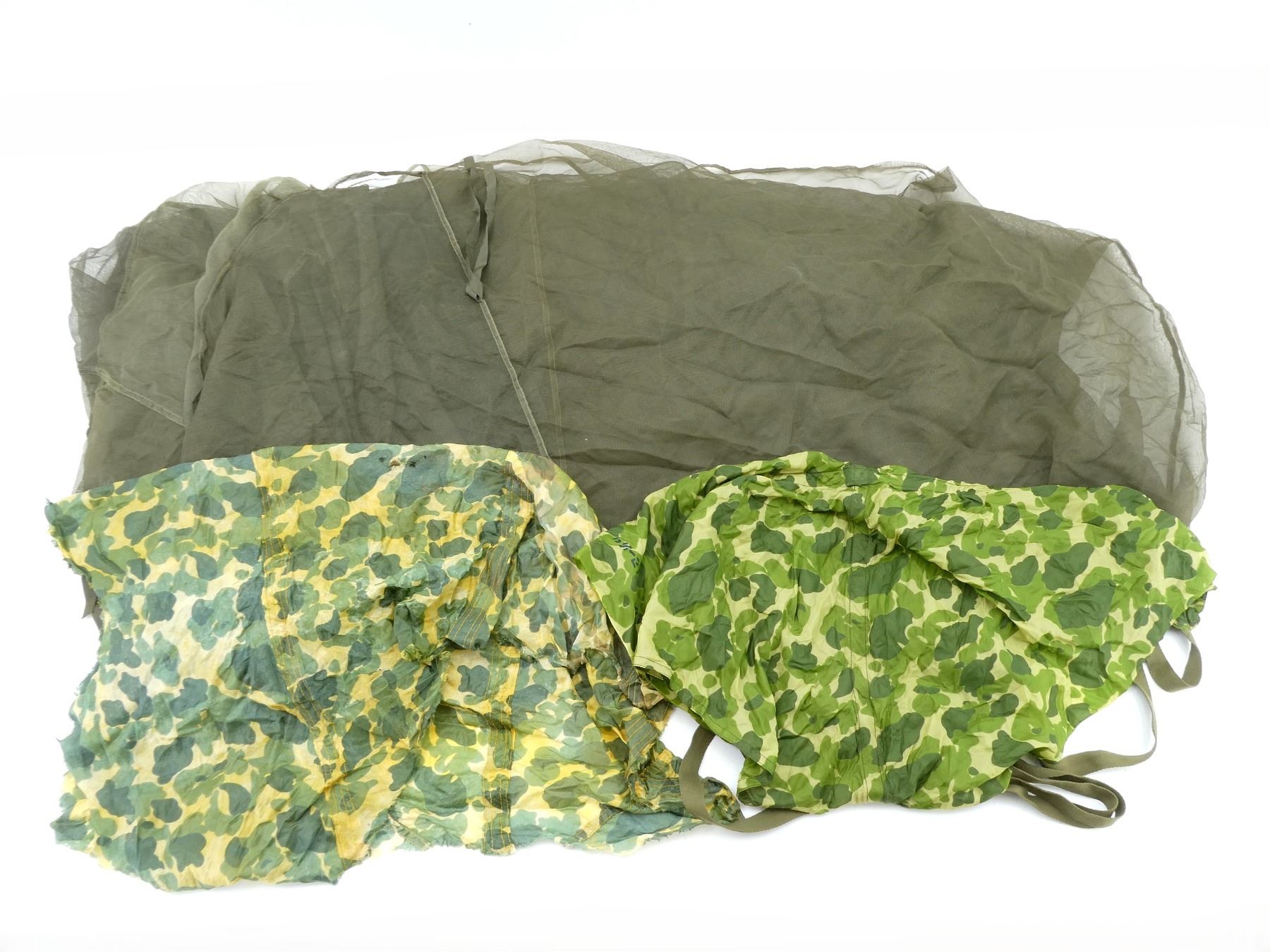 LOT INCLUDES; (1) OLIVE GREEN MESH NETTING, LABEL MARKED: "BARS, INSECT, FIELD, HIGH TENACITY, THE C.W. BRENEMAN CO., PURCHASE ORDER 16832, DATED 13 MARCH 1945, PHILA Q.M. DEPOT" ETC., APPROX. 196" L X 128" W, (1) WWII ERA FROG SKIN CAMO SMALL PARACHUTE CANOPY, INK STAMPED: "P.Q.M.D., 318, ?????", "PN-51DG252", "23", OLIVE GREEN CANVAS STRAPS ATTACHED, OLIVE GREEN THREADING, APPROX. 34" X 34" & (1) UNKNOWN MILITARY FROG SKIN CAMO STYLE PIECE OF FABRIC, NO VISIBLE MARKINGS, SHOWS AGE / WEAR / TEAR. SEE PHOTOS.