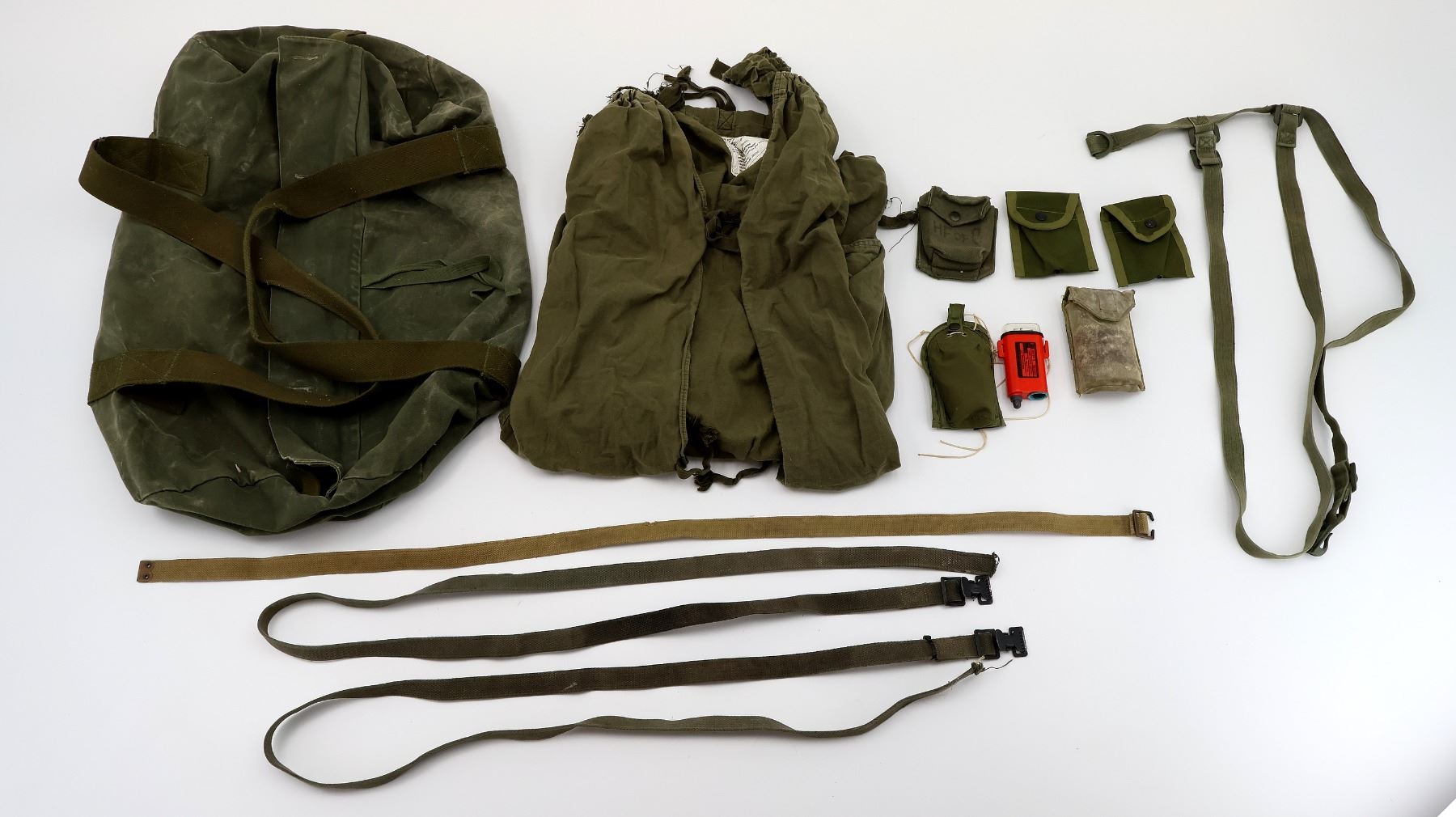 LOT INCLUDES; (1) CANADIAN MILITARY STYLE DUFFLE BAG, FAINT / UN-CLEAR INK STAMP MARKING ON SIDE OF BAG, BUTTON / ZIPPERED CLOSURE, (WORKS), CANVAS CARRY HANDLES, SHOWS AGE / WEAR / TEAR, (1) CANADIAN MILITARY COLD WEATHER SLEEPING BAG LINER, MARKED: "NSN/NNO 8465-21-842-6080, LINER, SLEEPING BAG, COLD WEATHER" ETC., VARIOUS CANVAS TIES, SECTION CUT OUT, SHOWS AGE / WEAR / TEAR, APPROX. 76" X 24", (4) ASSORTED STYLE TAN / GREEN CANVAS STRAPS, NO VISIBLE MARKINGS, THREE APPEAR TO BE FOR CARGO, OALS APPROX. 43" TO 70", (2) MILITARY STYLE GREEN NYLON AMMO POUCHES, MARKED: "MADE IN KOREA", METAL BELT CLIPS, (1) CANADIAN MILITARY STYLE GREEN CANVAS AMMO POUCH, VARIOUS FAINT / UN-CLEAR MARKINGS, BELT LOOP, SHOWS AGE / WEAR, (1) U.S. MILITARY DISTRESS LIGHT MARKER WITH GREEN NYLON POUCH, LIGHT MARKED: "US", "MODEL NO. FED SDU-5/E, SERIAL NO. 011164, TYPE LIGHT MARKER, DISTRESS, NSN 6230-00-067-5209" ETC., MISSING CAP FOR BATTERY COMPARTMENT, UN-TESTED, ETC. SEE PHOTOS.