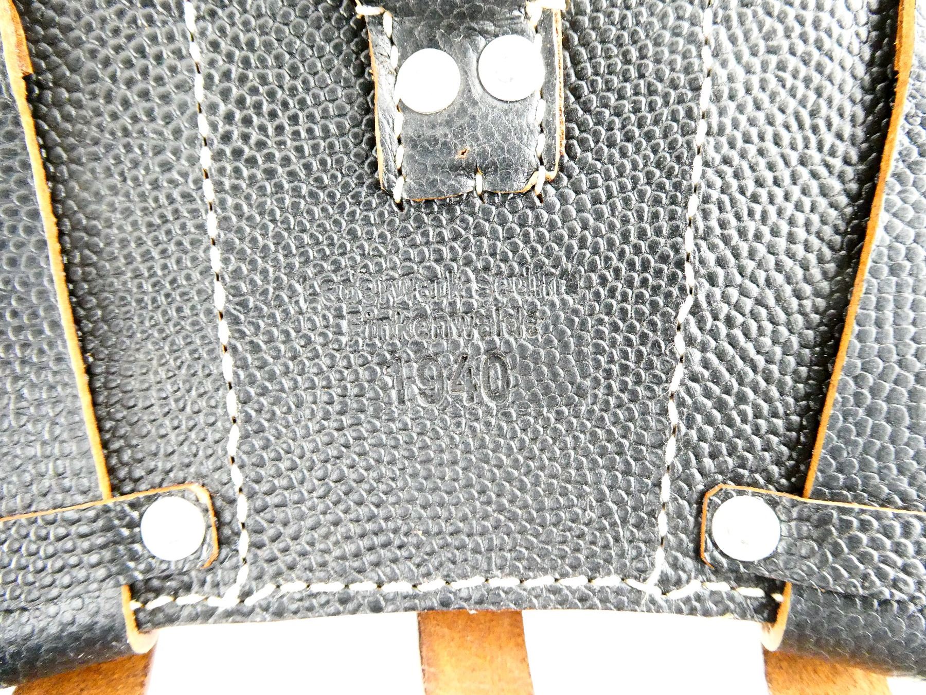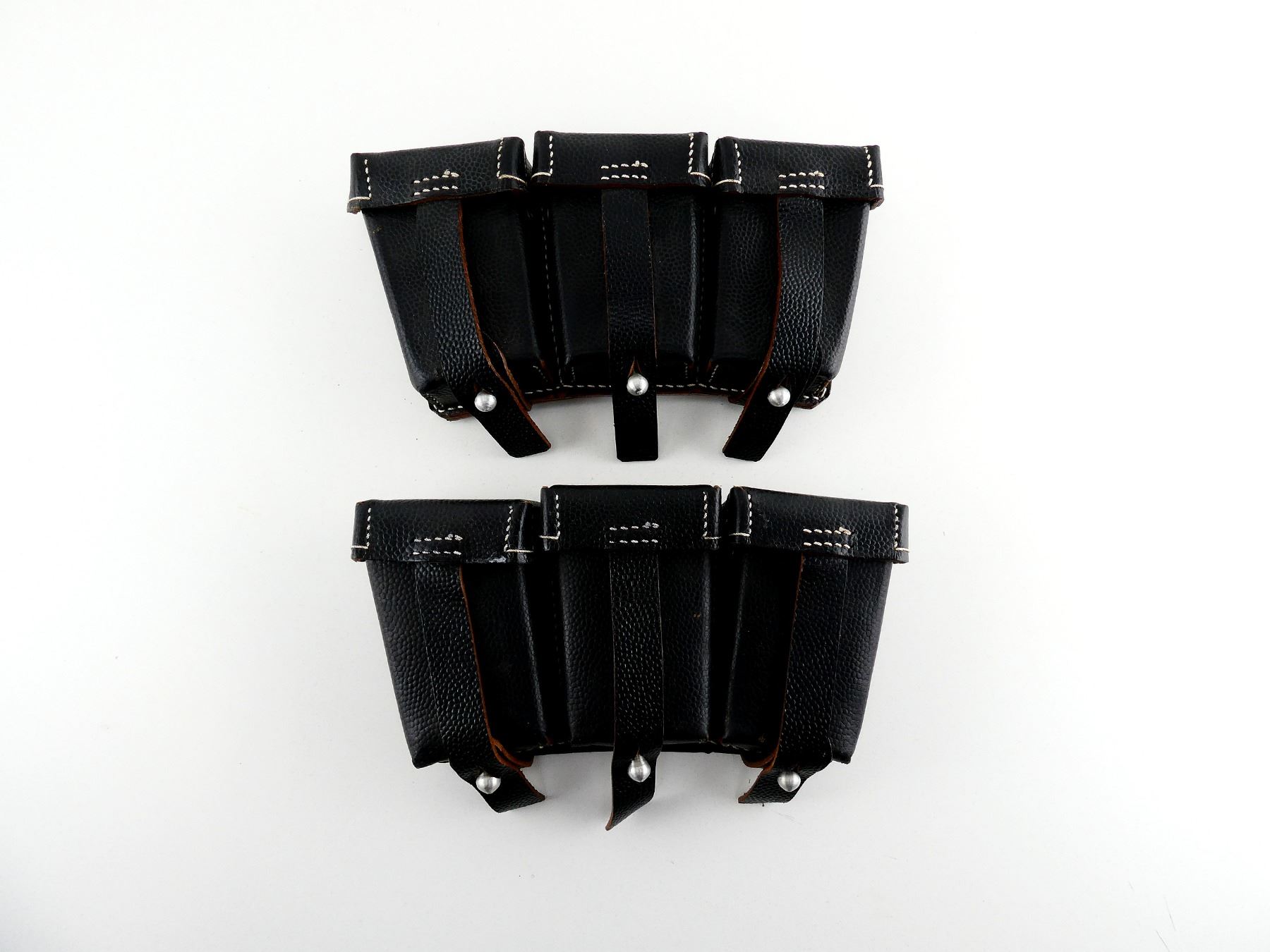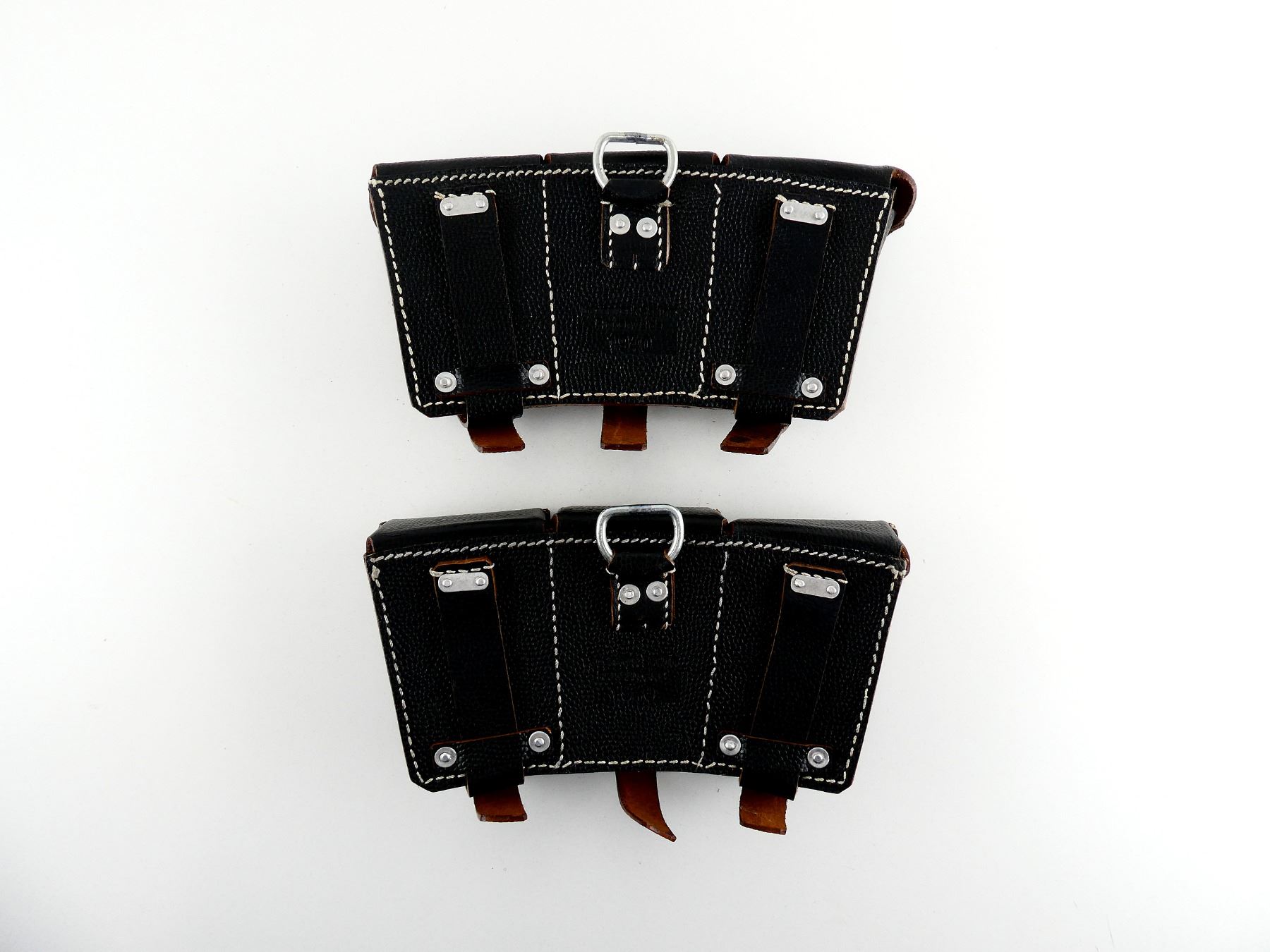 LOT INCLUDES; (2) REPRODUCTION BLACK PEBBLED LEATHER AMMO POUCHES, MARKED: "LEDERWERK SEDINA, FINKENWALDE, 1940", METAL FITTINGS, TWO LEATHER BELT LOOPS. SEE PHOTOS.