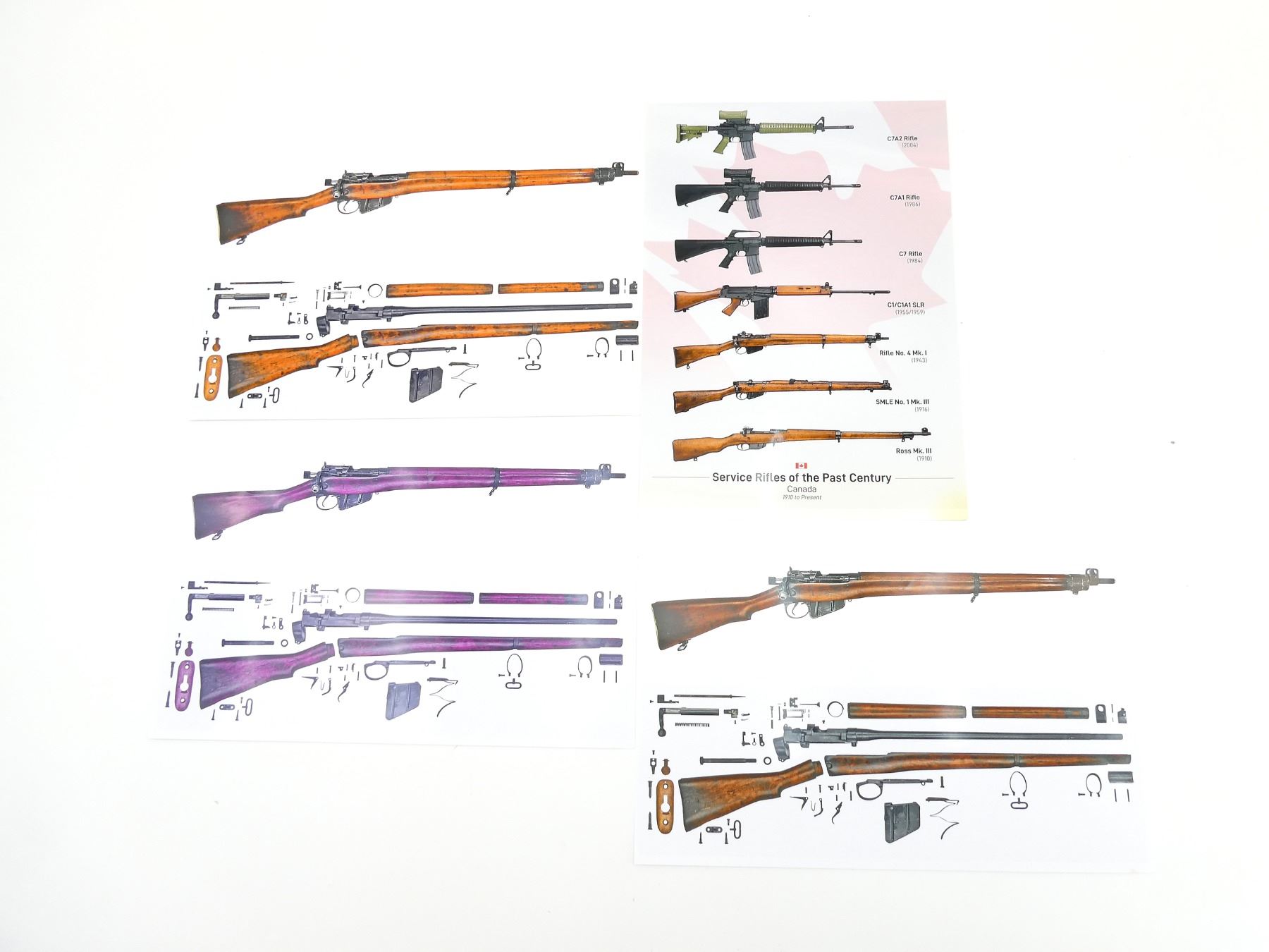 LOT INCLUDES; (3) LEE ENFIELD POSTERS, DEPICTING LEE ENFIELD PUT TOGETHER / TAKEN APART, APPROX. 19" X 13" & (1) "SERVICE RIFLES OF THE PAST CENTURY, CANADA, 1910 TO PRESENT" POSTER, DEPICTING VARIOUS RIFLES USED BY CANADIAN FORCES OVER THE YEARS, APPROX. 19" X 13". SEE PHOTOS.